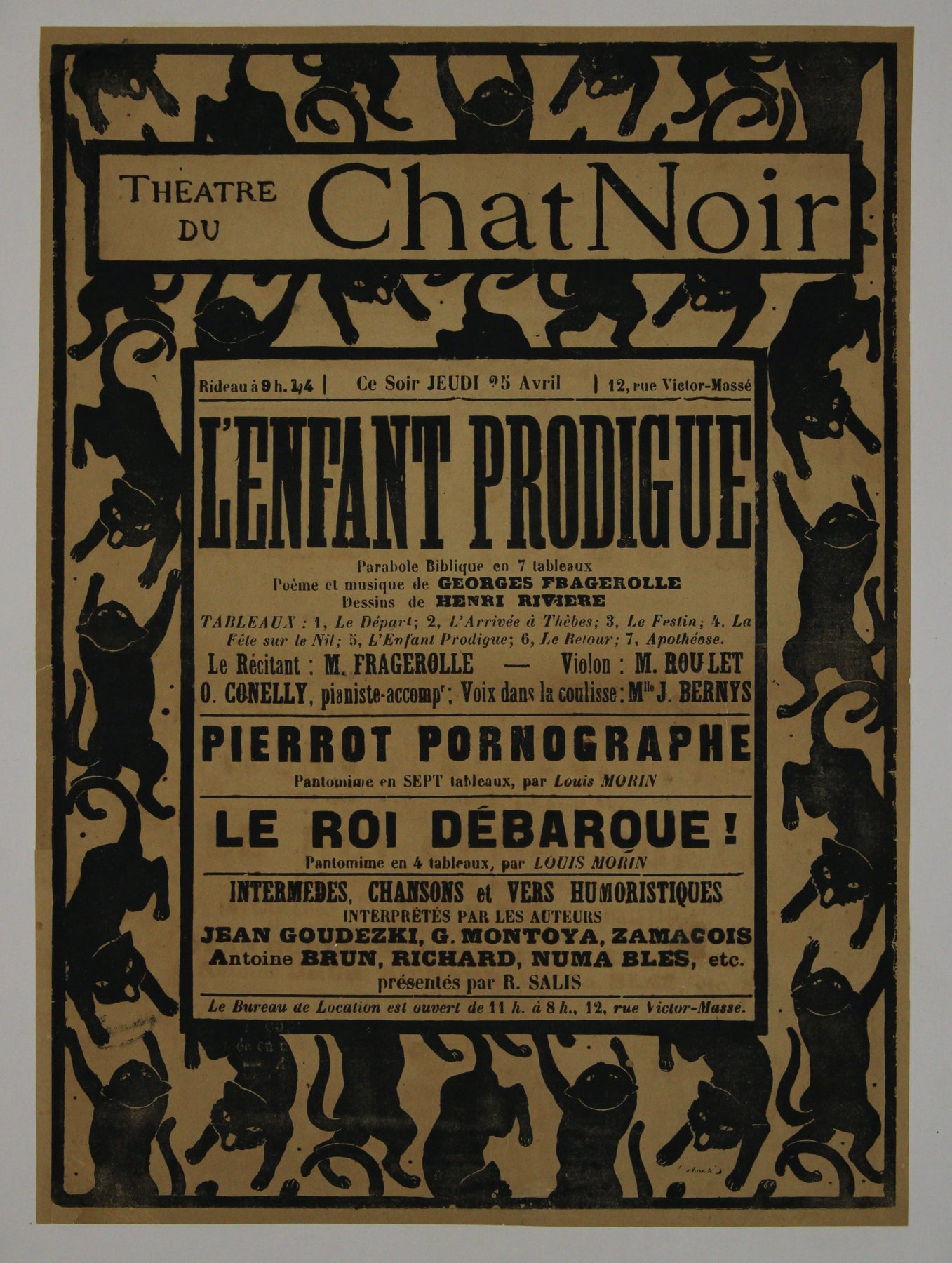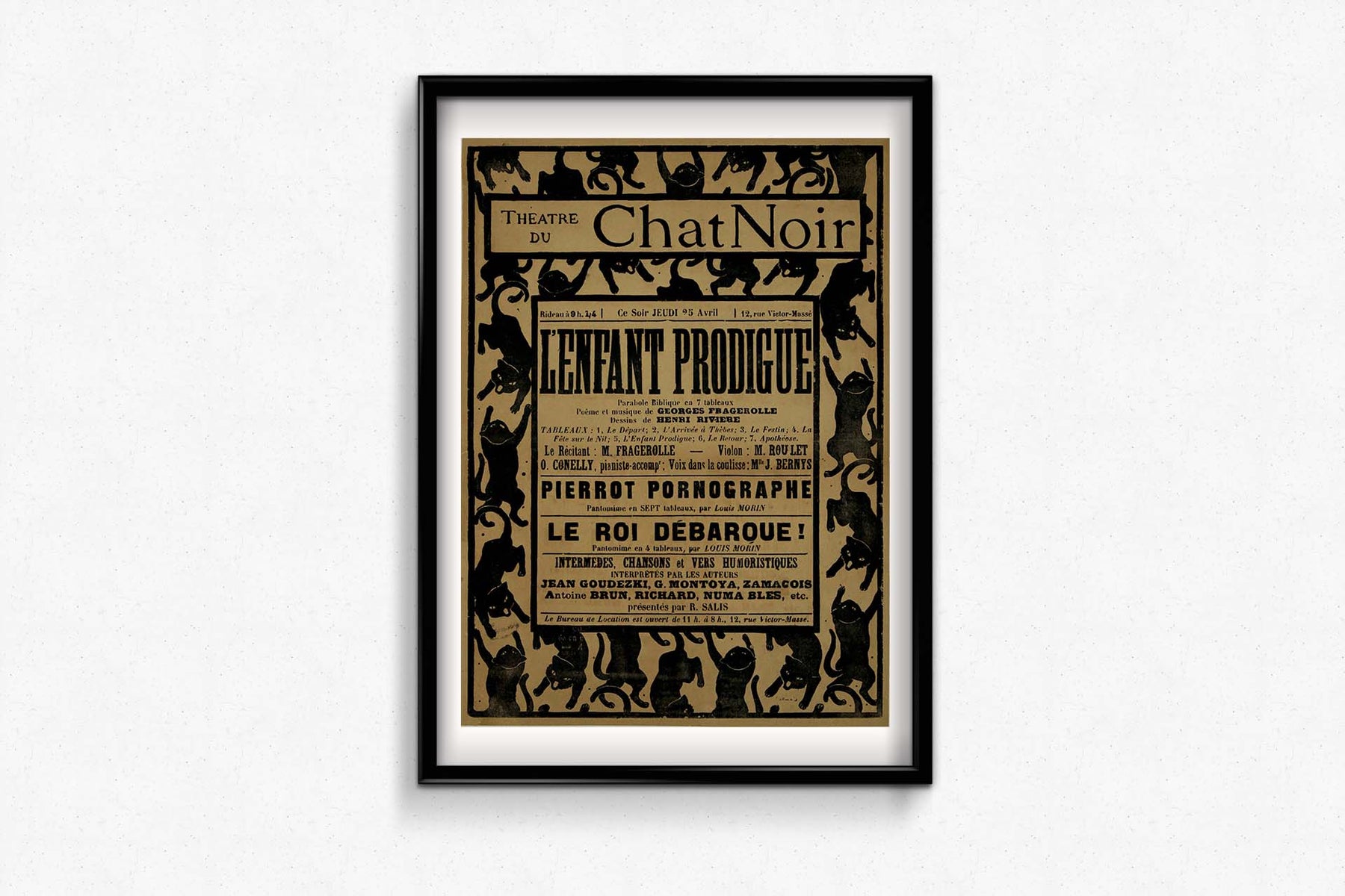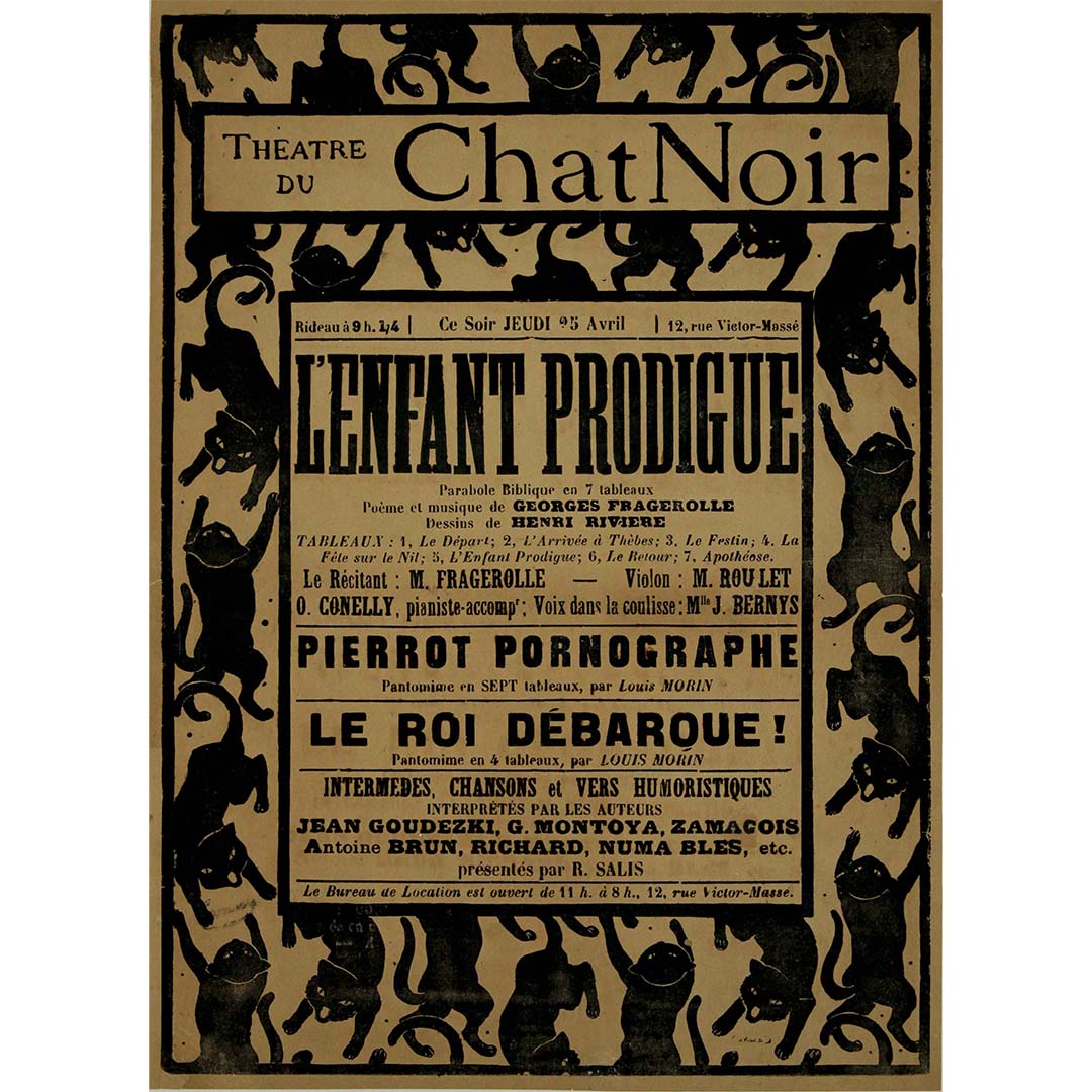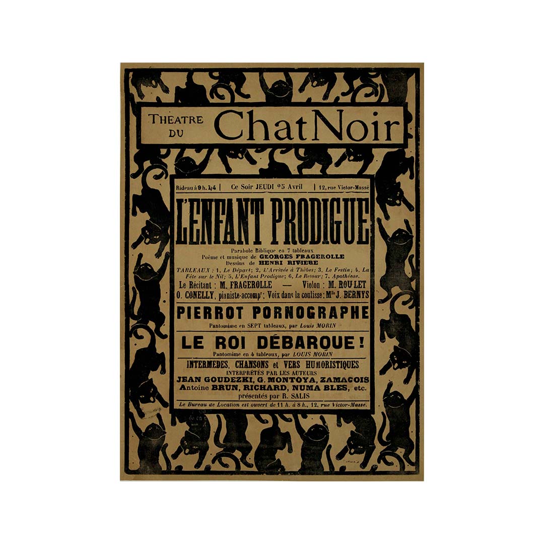 Henri Rivière's circa 1895 creation for "Le Théâtre du Chat Noir: L'Enfant Prodigue" stands as a whimsical masterpiece that invites us to step into the magical realm of Parisian cabaret. This iconic poster captures the essence of a bygone era when cabaret entertainment thrived in the heart of Paris.