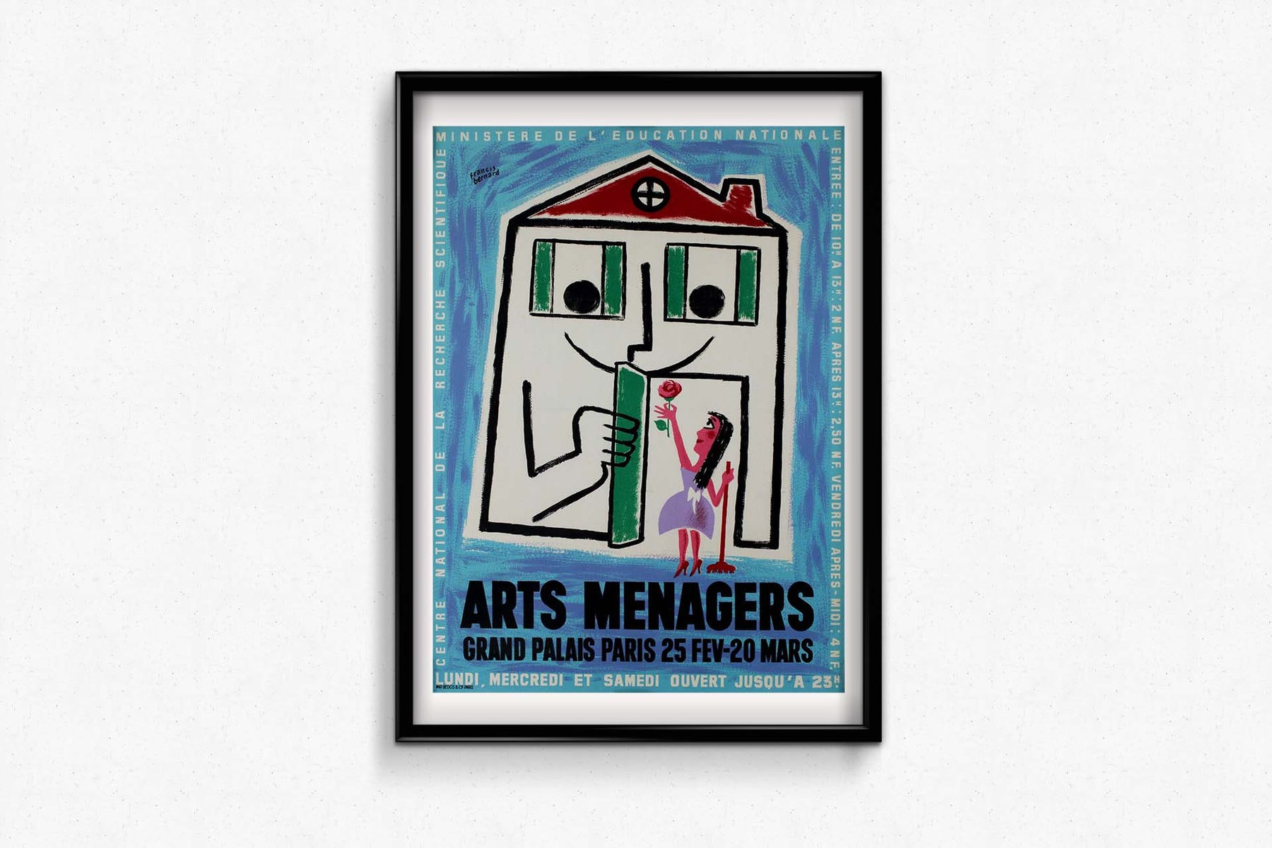 Regular price €500,00The circa 1950 original poster by Francis Bernard for the "Arts Ménagers" exhibition at the Grand Palais, organized in collaboration with the Centre National de la Recherche Scientifique (CNRS), stands as a testament to the era's forward-thinking approach to household management and scientific innovation. This poster not only promoted an event but also encapsulated the post-war enthusiasm for modernity and efficiency in daily life.