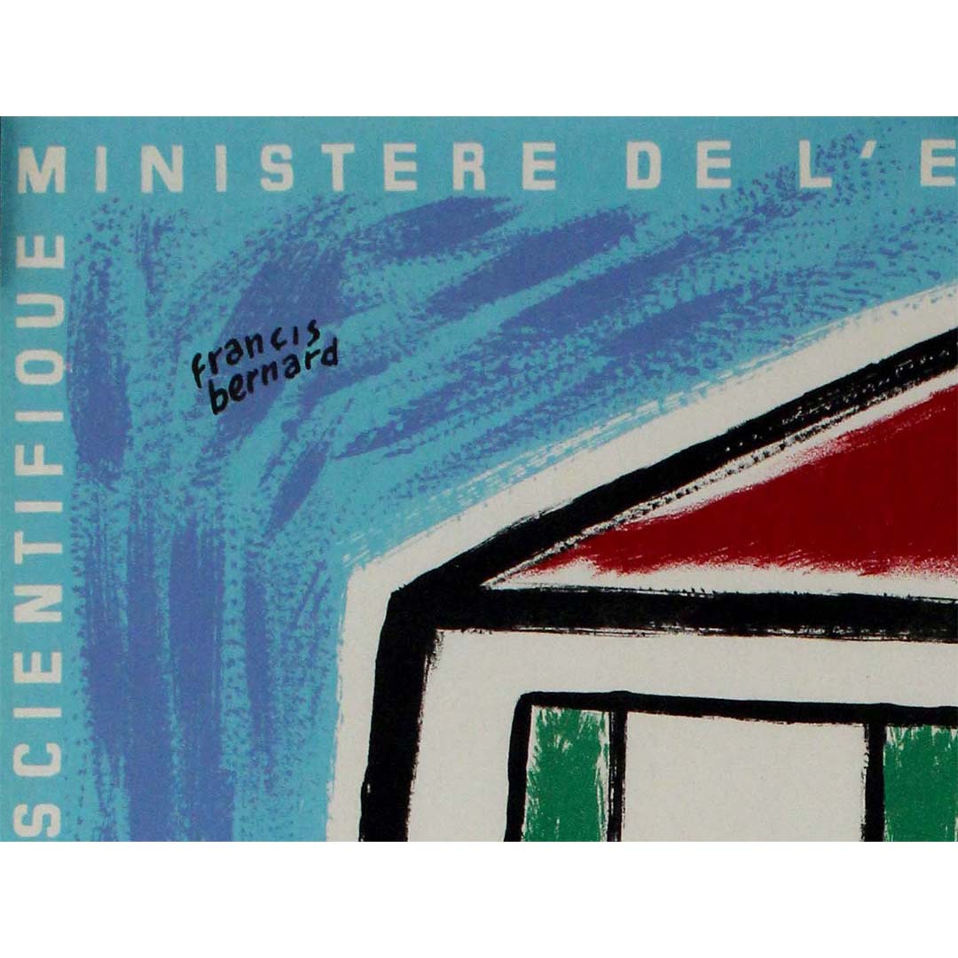 In conclusion, the circa 1950 original poster by Francis Bernard for the "Arts Ménagers" exhibition at the Grand Palais, in collaboration with the CNRS, is a remarkable piece of design history. It encapsulates the period's excitement for modern household advancements and the significant role of scientific research in enhancing daily life, making it a valuable artifact for those interested in the intersection of art, science, and home economics.