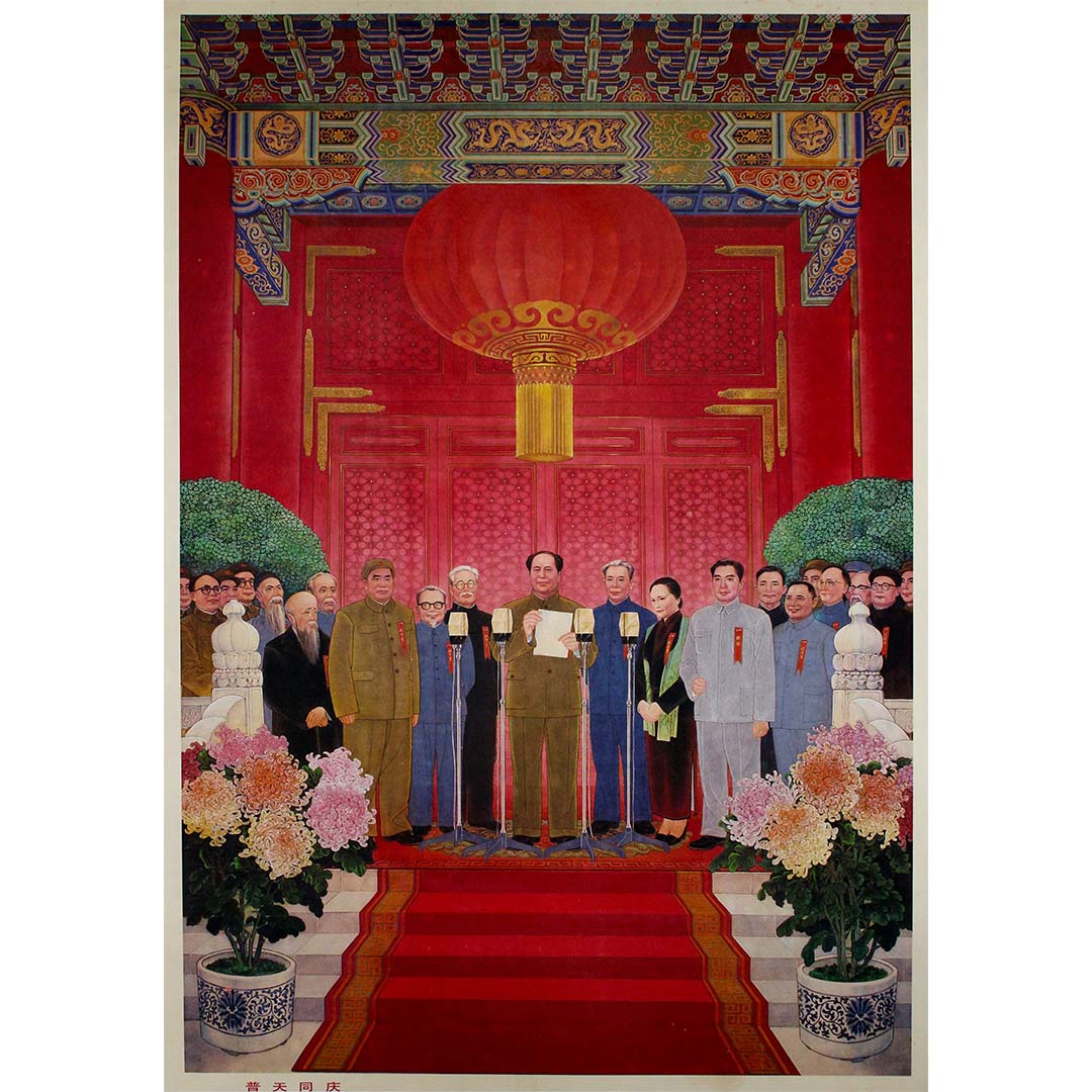 Regular price €1.500,00This original Chinese poster is an iconic depiction of a historic moment that celebrates the founding of the People’s Republic of China. With its vivid colors, meticulous detail, and careful composition, the image showcases Mao Zedong and prominent leaders of the Chinese Communist Party standing in front of the Tiananmen Gate, symbolizing unity, progress, and the dawn of a new era.