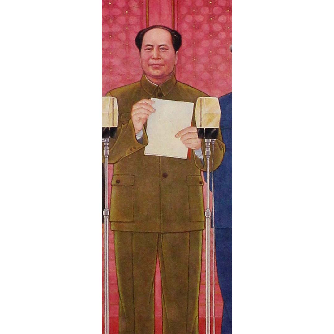 Mao Zedong stands at the center, his presence commanding yet approachable, holding the document of the declaration. Surrounding him are key political figures, military leaders, and intellectuals who played pivotal roles in the revolution. The individuals’ postures and expressions convey a sense of collective achievement, reinforcing the image of unity and shared purpose. The meticulous attention to detail in their clothing and accessories emphasizes their importance while creating a connection with the audience, portraying them as leaders who emerged from the people.
