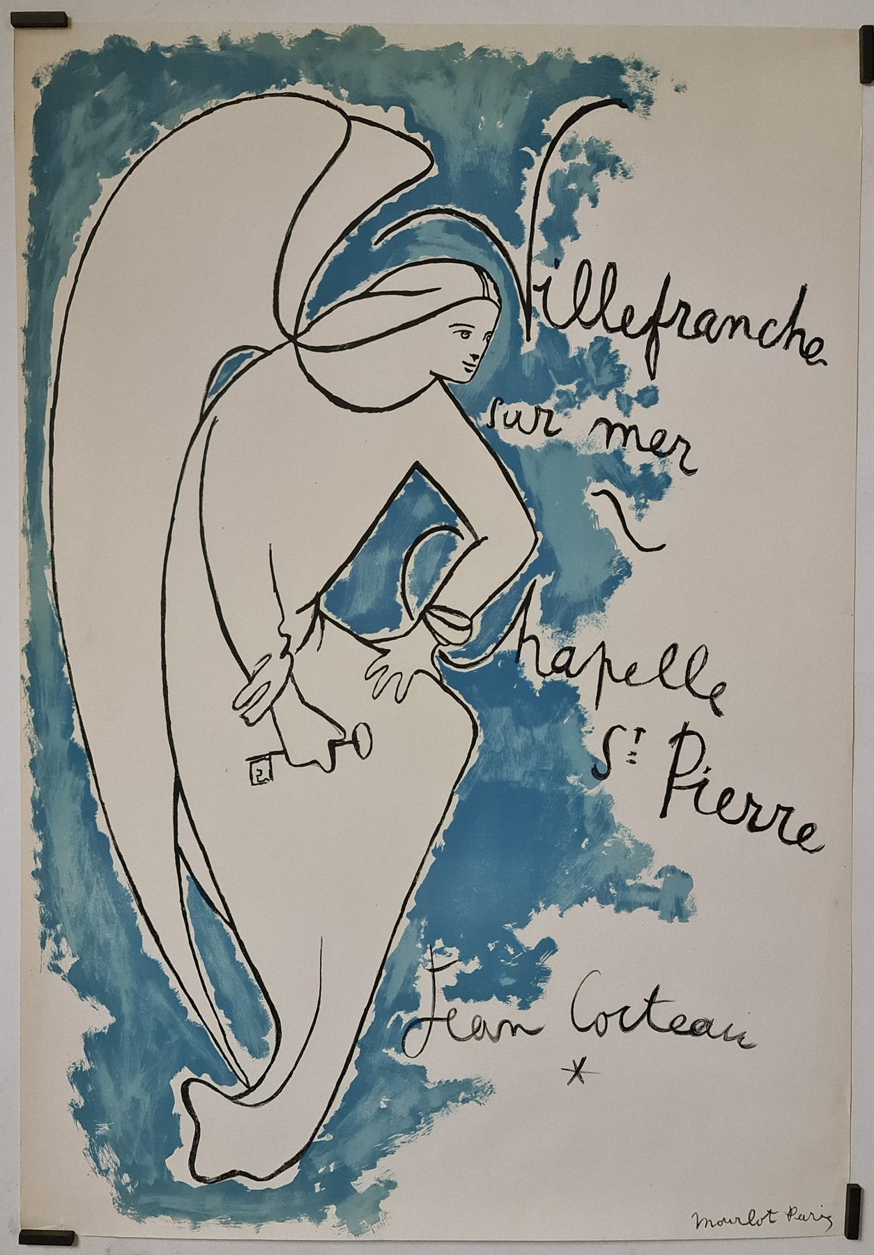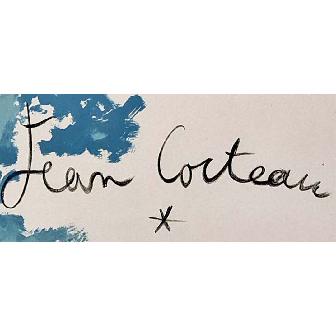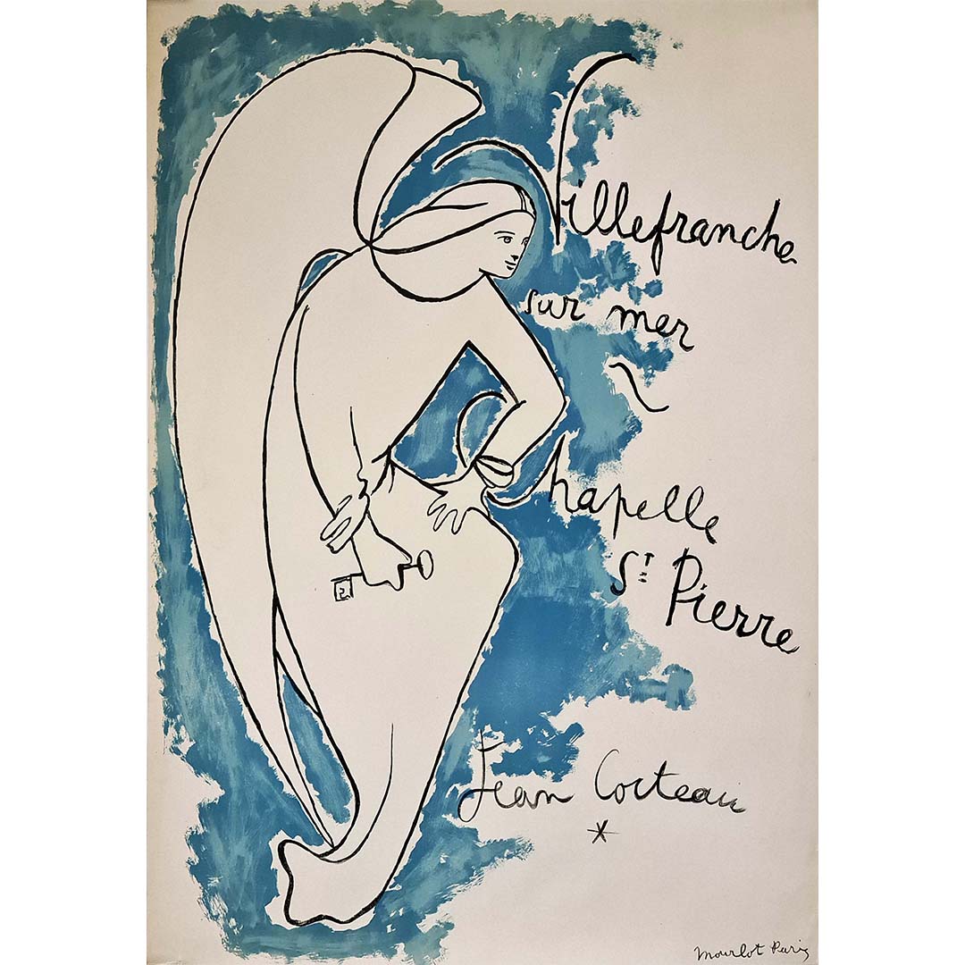 This iconic and original lithographic poster was created by Jean Cocteau to celebrate the Chapelle St. Pierre in the town of Villefranche-sur-Mer, in the south of France. Cocteau spent several months in the small Mediterranean seaside village painting murals inside the small chapel to celebrate St. Peter and the fishermen.