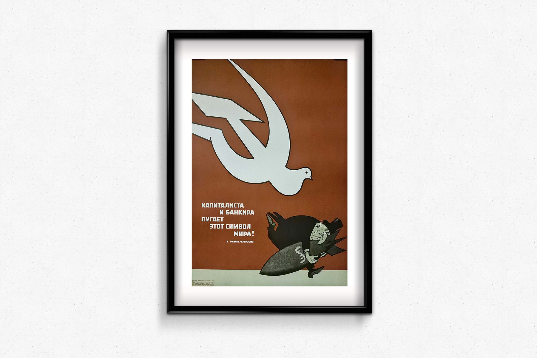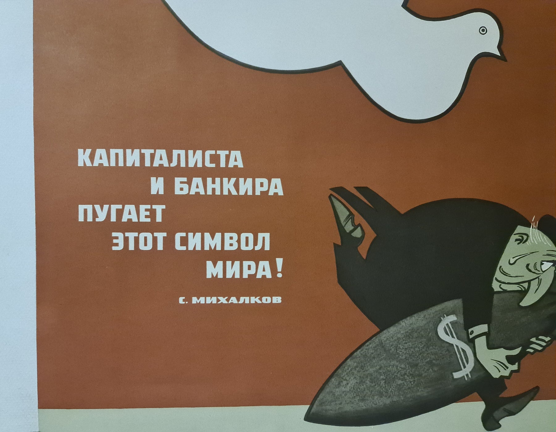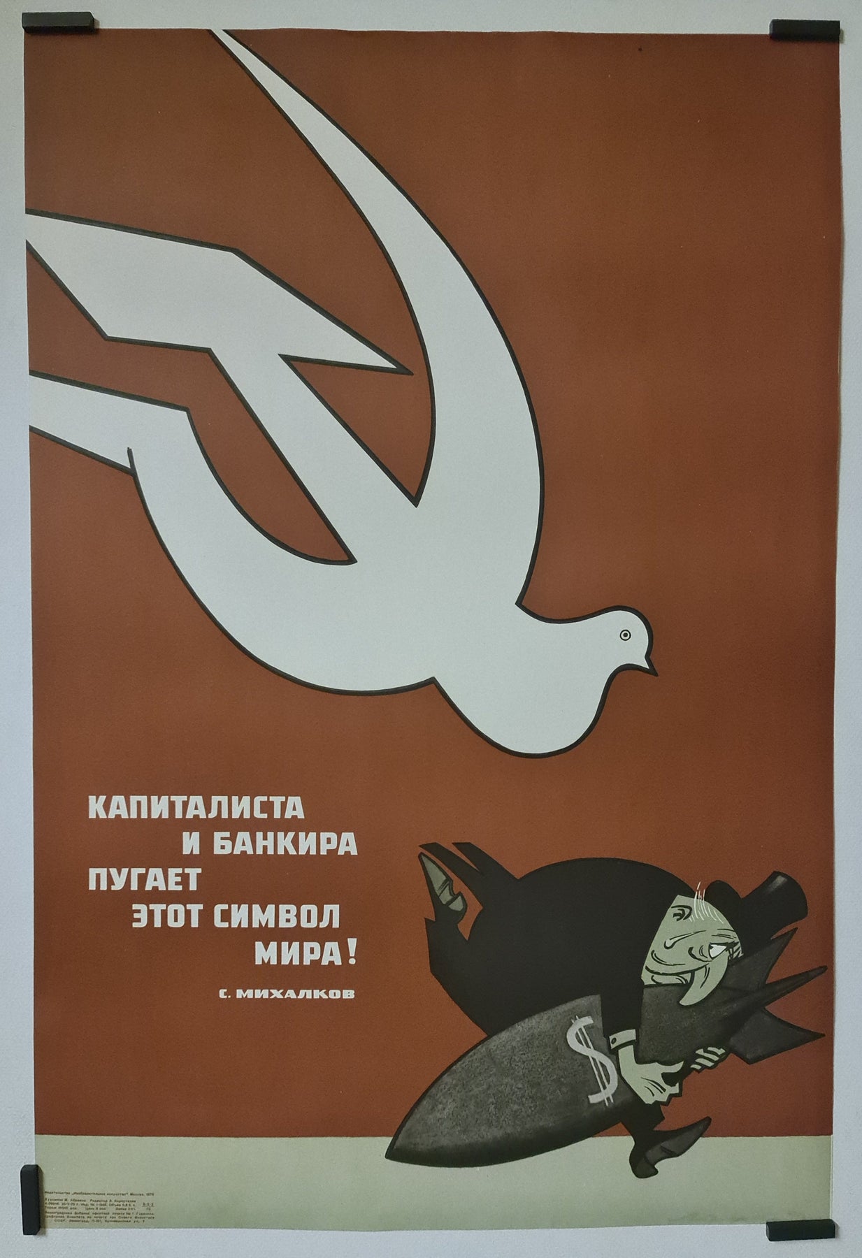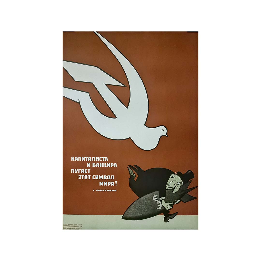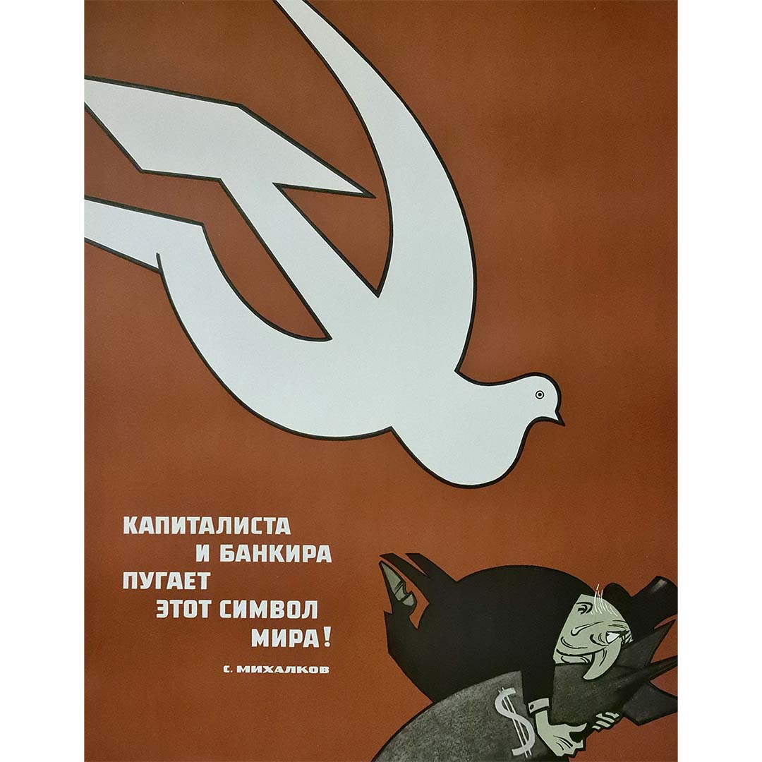 This original circa 1970 Soviet propaganda poster, titled Le capitaliste et le banquier ont peur de ce symbole - Paix !, was created by Sergei Vladimirovich Mikhalkov, a prominent Russian and Soviet poet and writer. Mikhalkov is notably recognized for authoring the lyrics of the Soviet Union's National Anthem in 1944 and revising them in 1977 to remove references to Stalin.