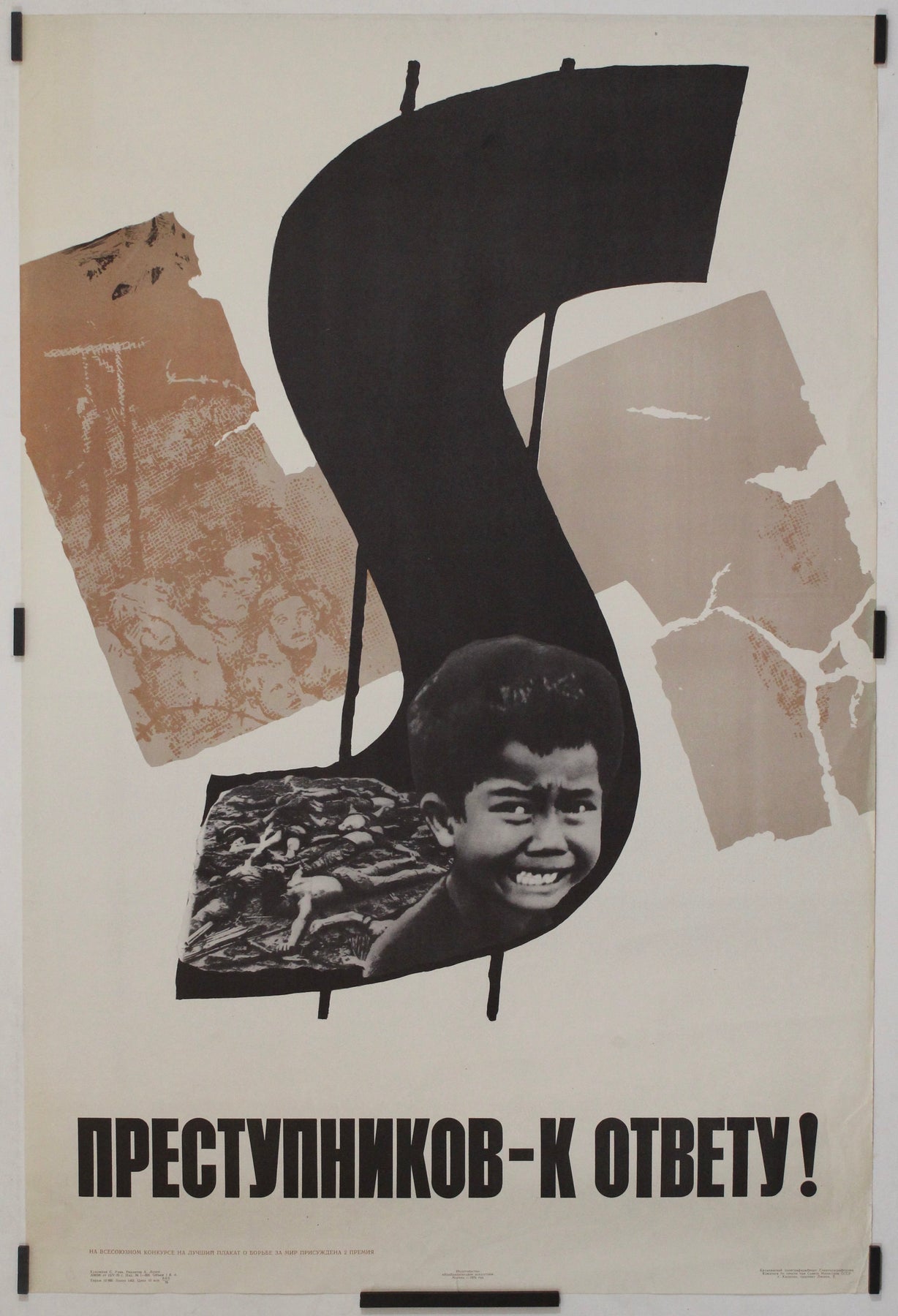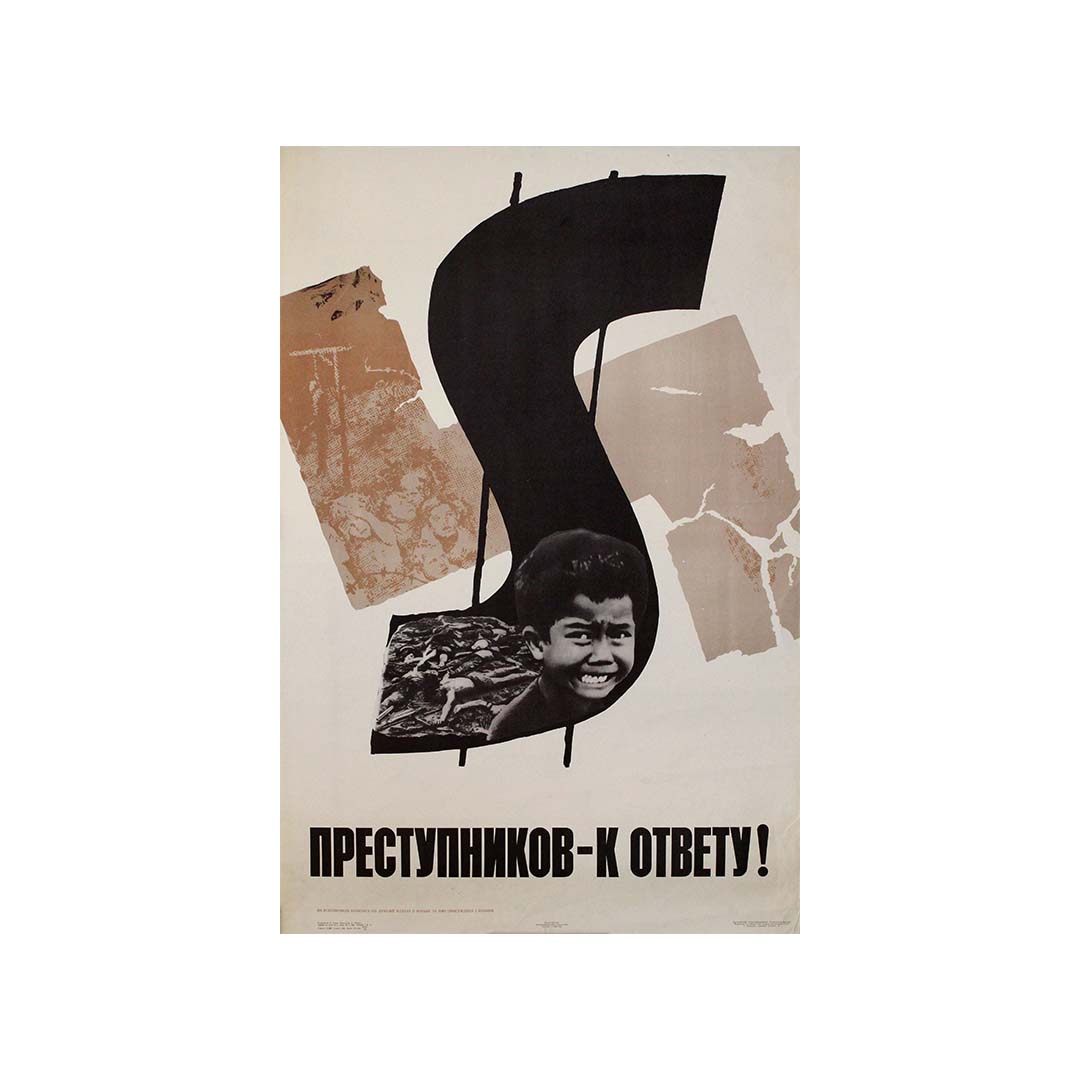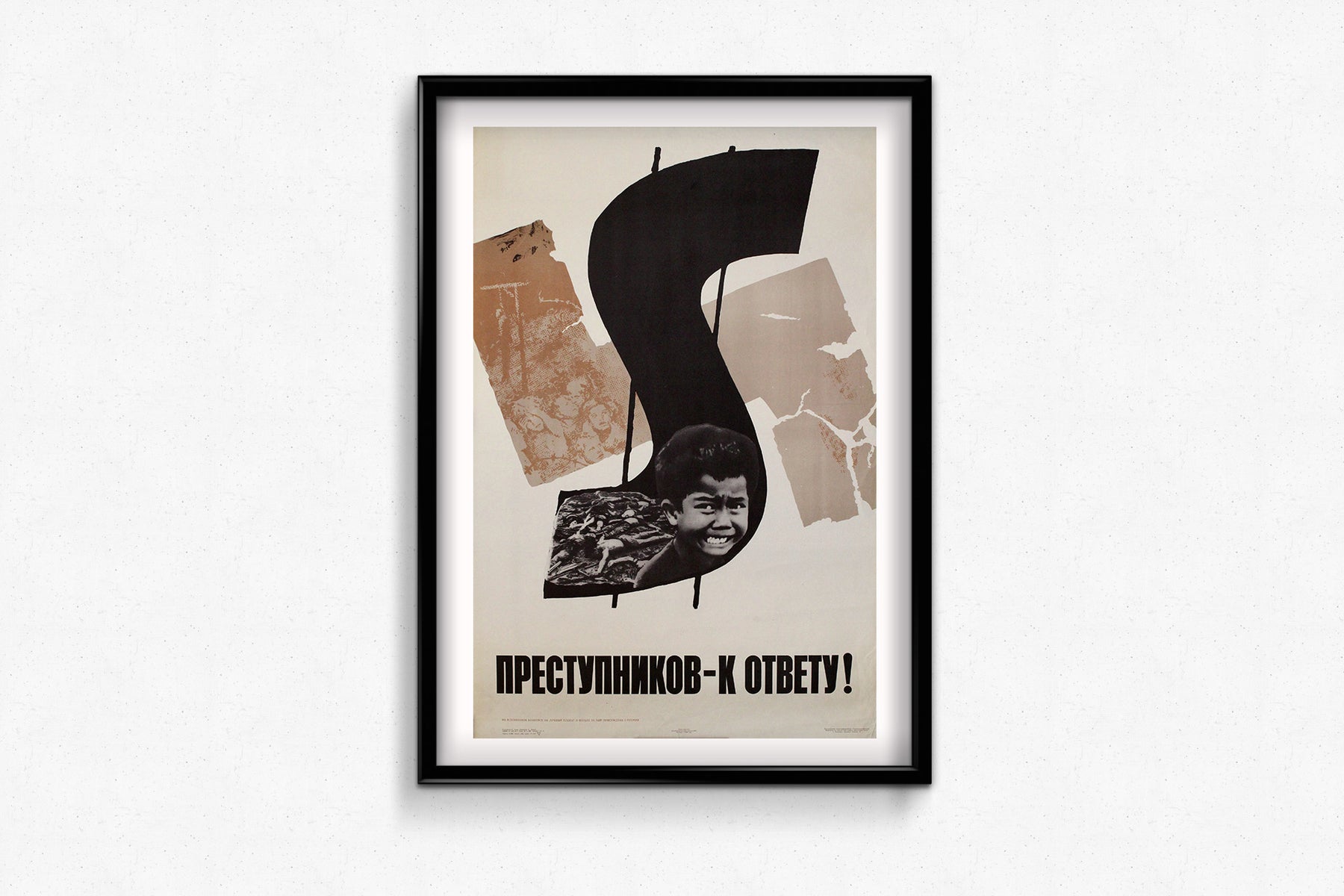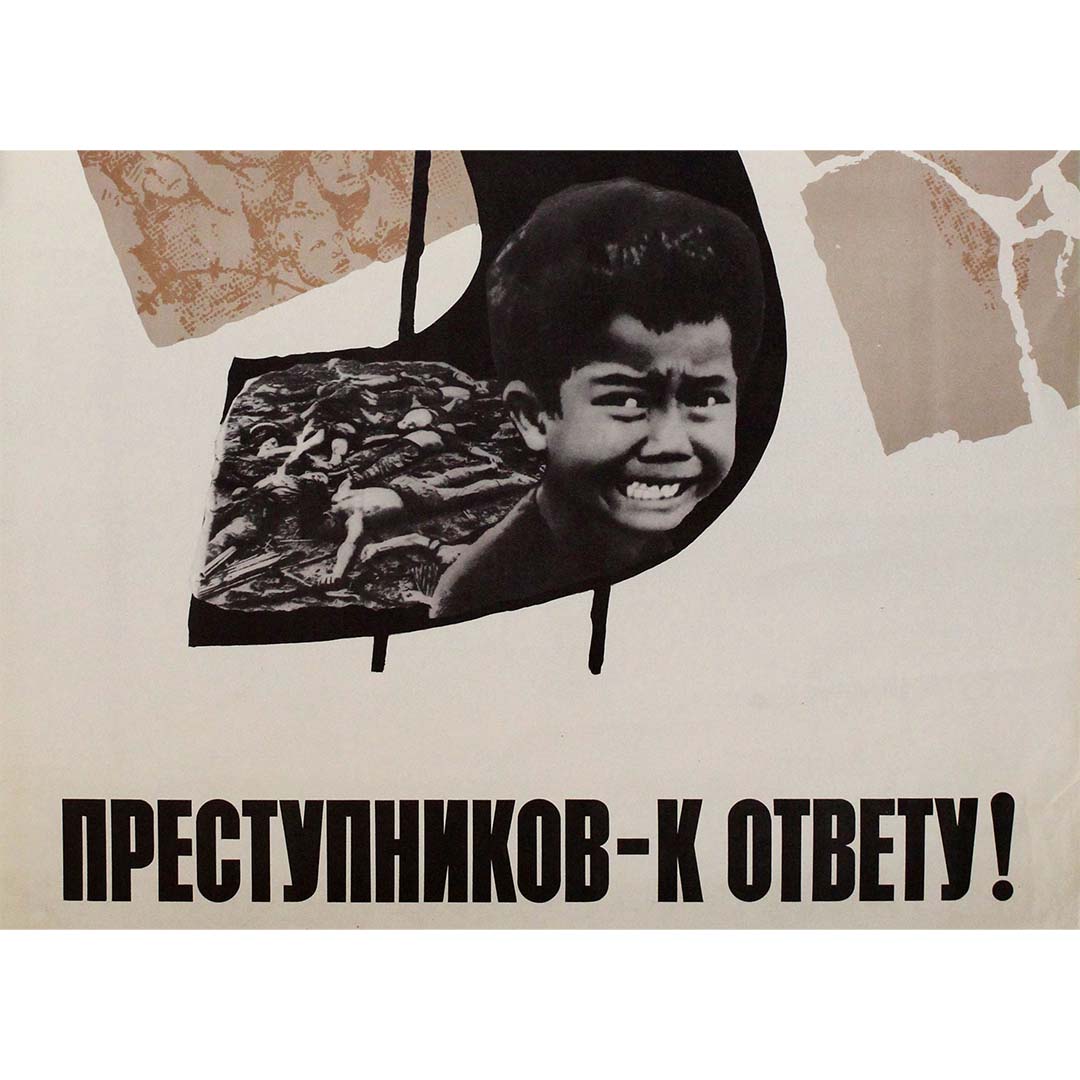 The poster’s title, "Преступников – к ответу!" ("Bring the Criminals to Justice!"), is a direct and impassioned call for accountability. This work aligns with the Soviet Union’s broader campaign to denounce U.S. involvement in Southeast Asia and to position the USSR as a defender of oppressed peoples worldwide.