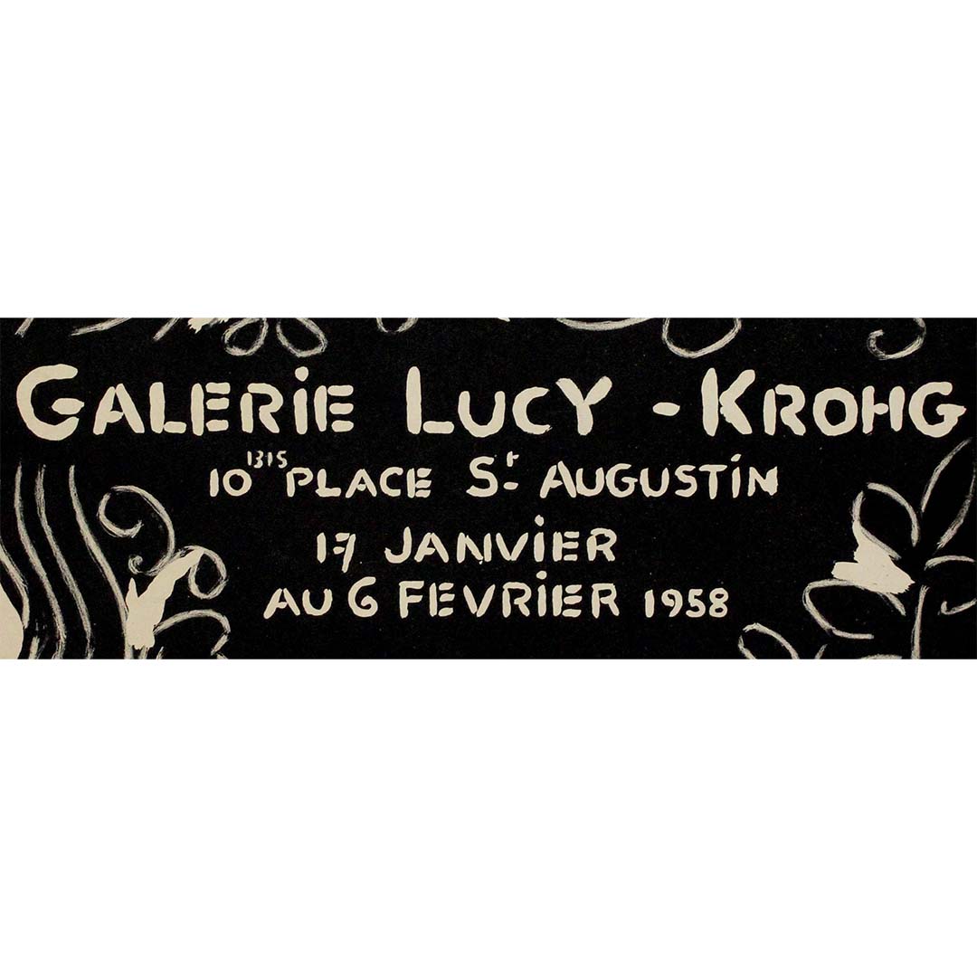 This original 1958 exhibition poster was created for a show of Jacqueline Lamba’s drawings at the Galerie Lucy-Krohg in Paris. Lamba, a key figure in the Surrealist movement, was known for her deeply evocative and poetic works, blending dreamlike imagery with expressive linework. The exhibition, which ran from January 17 to February 6, 1958, highlighted her mastery of drawing as a medium of surrealist exploration and emotional depth.