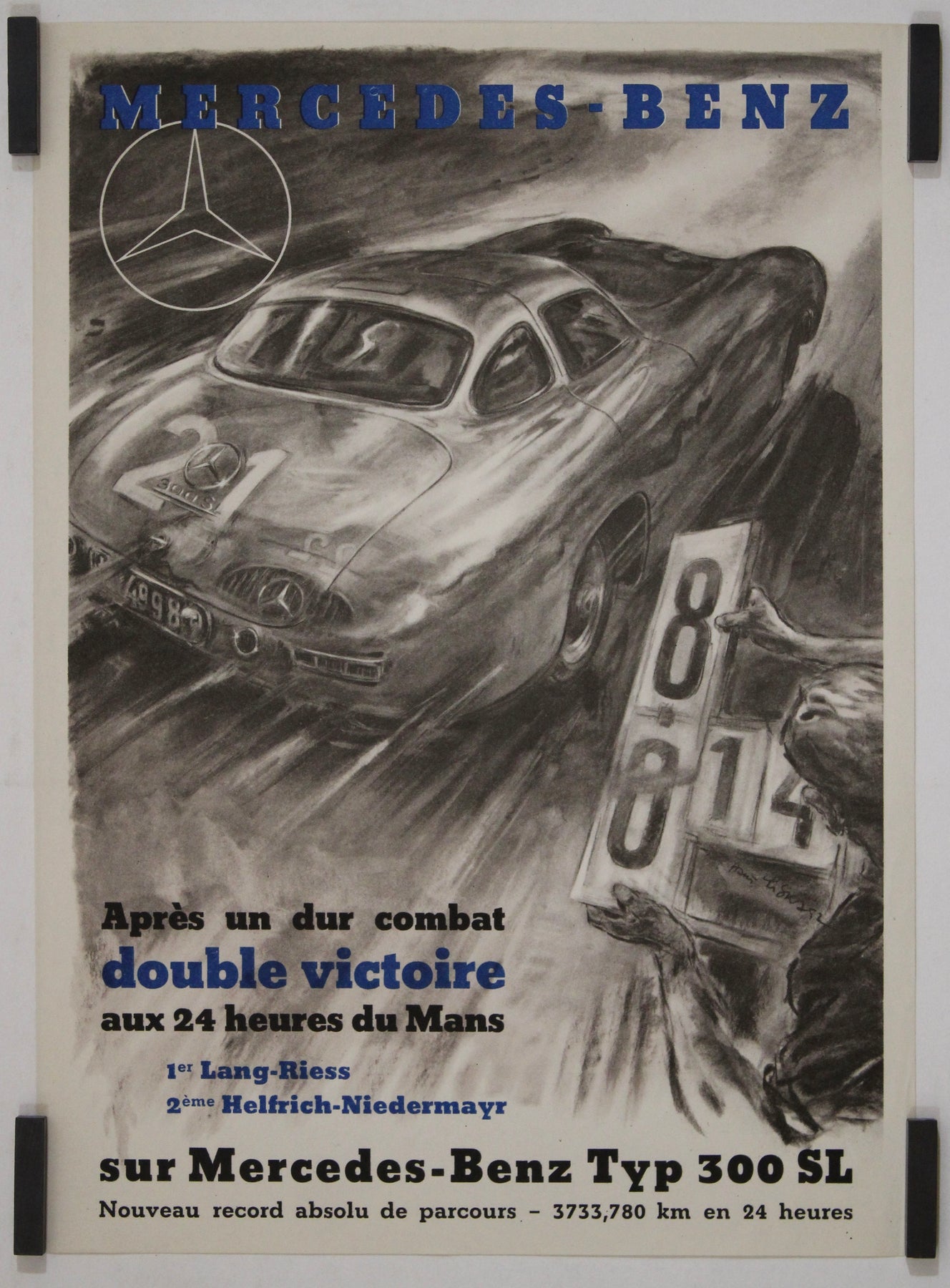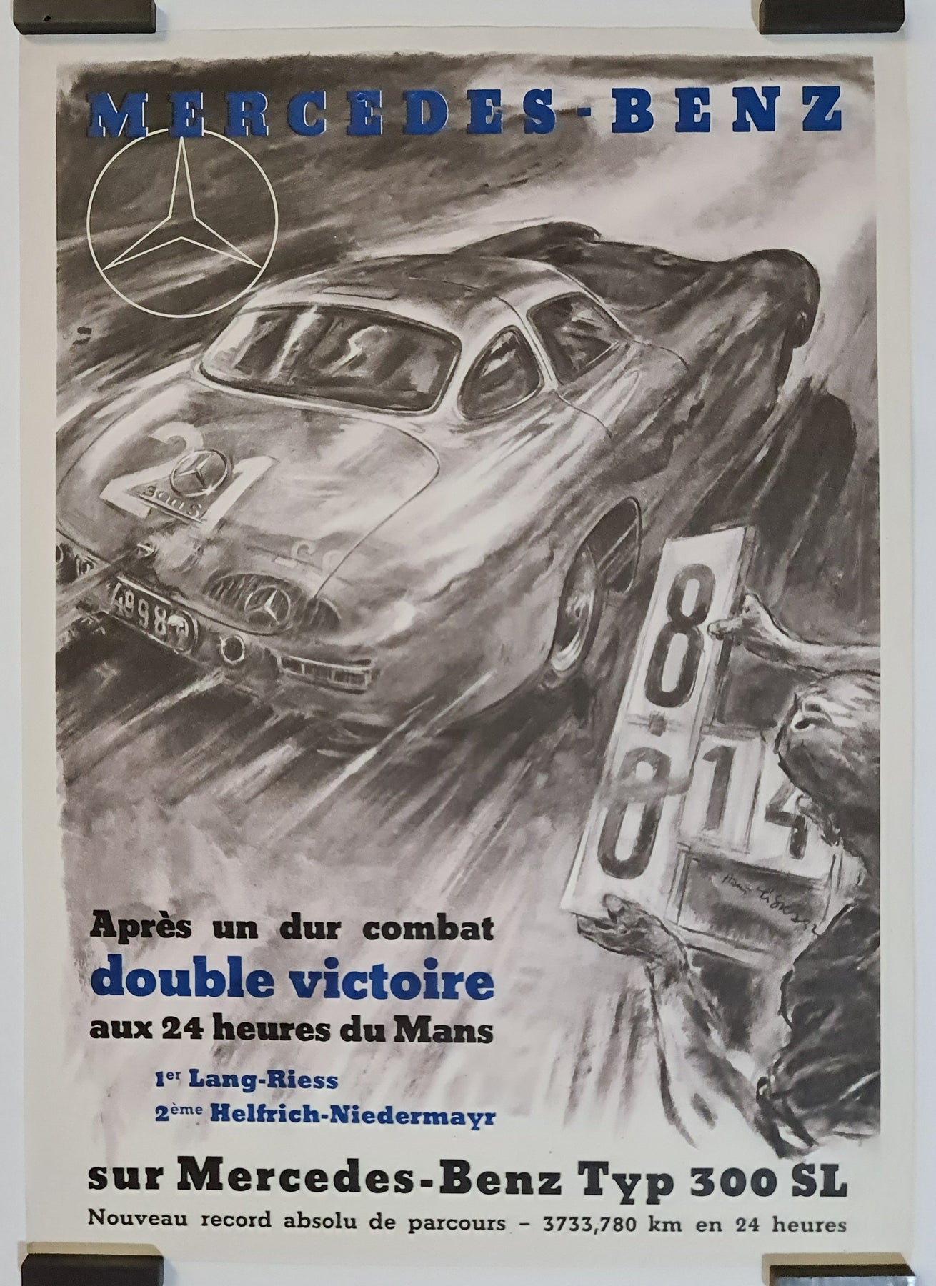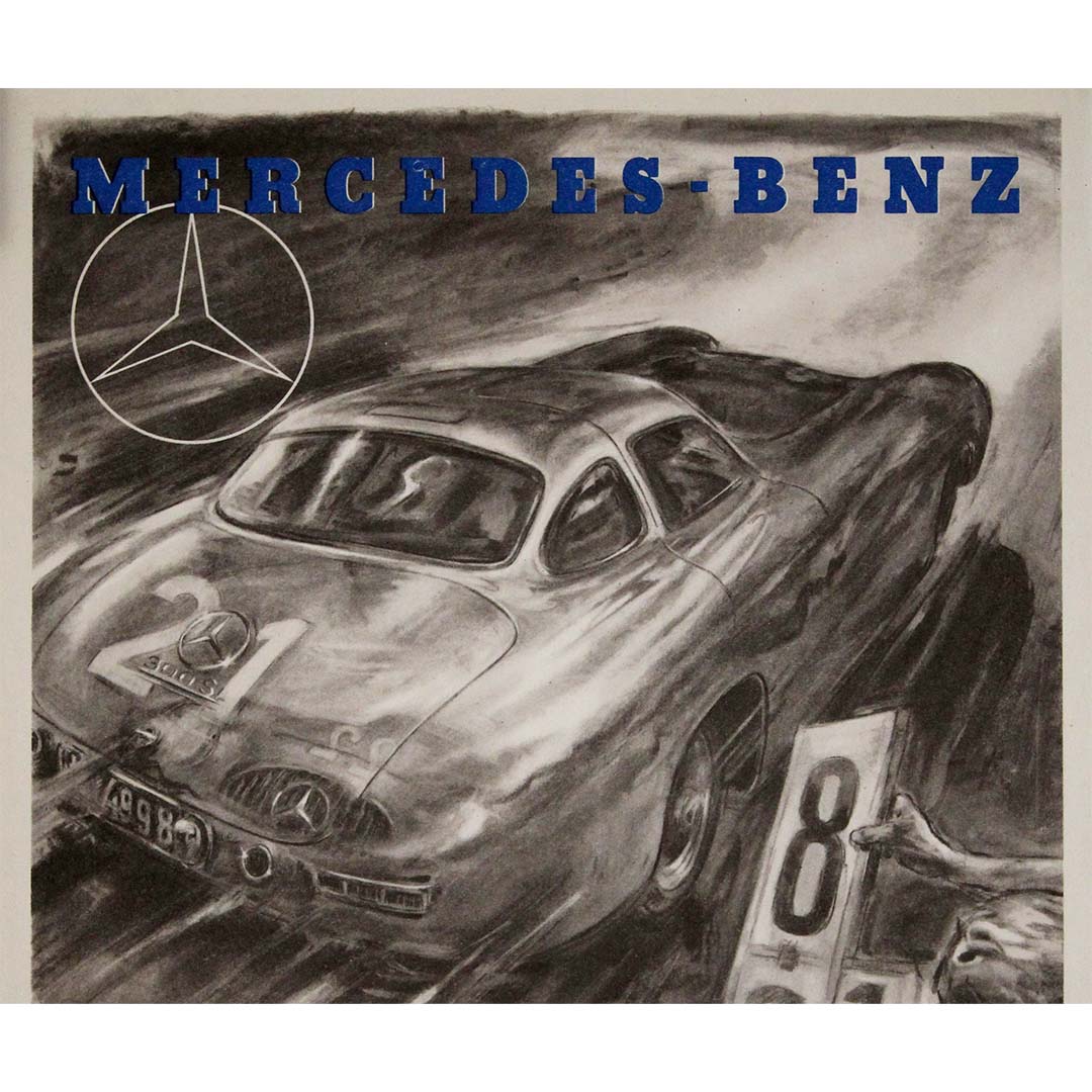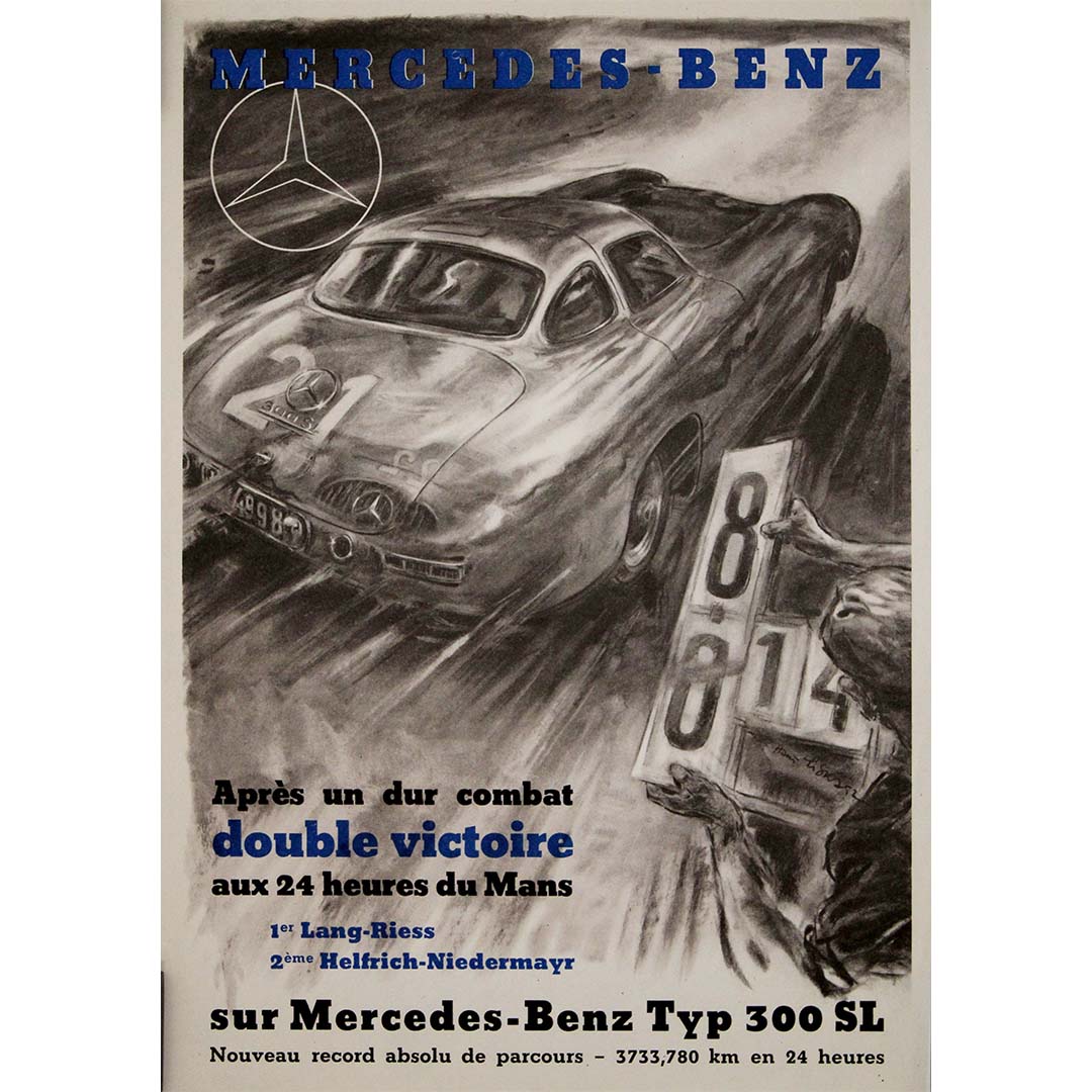 The original vintage poster celebrating Mercedes-Benz’s double victory at the 24 Hours of Le Mans is a dynamic tribute to one of the brand’s most iconic moments in motorsport history. Featuring the legendary Mercedes-Benz Typ 300 SL, the poster highlights the triumph of Lang-Riess in first place and Helfrich-Niedermayr in second, marking a dominant performance at the world’s most famous endurance race.