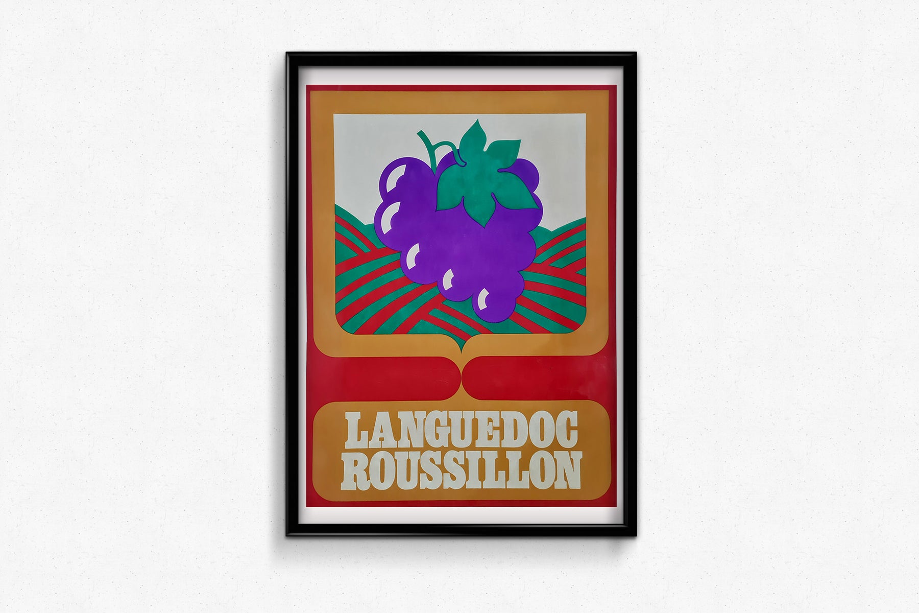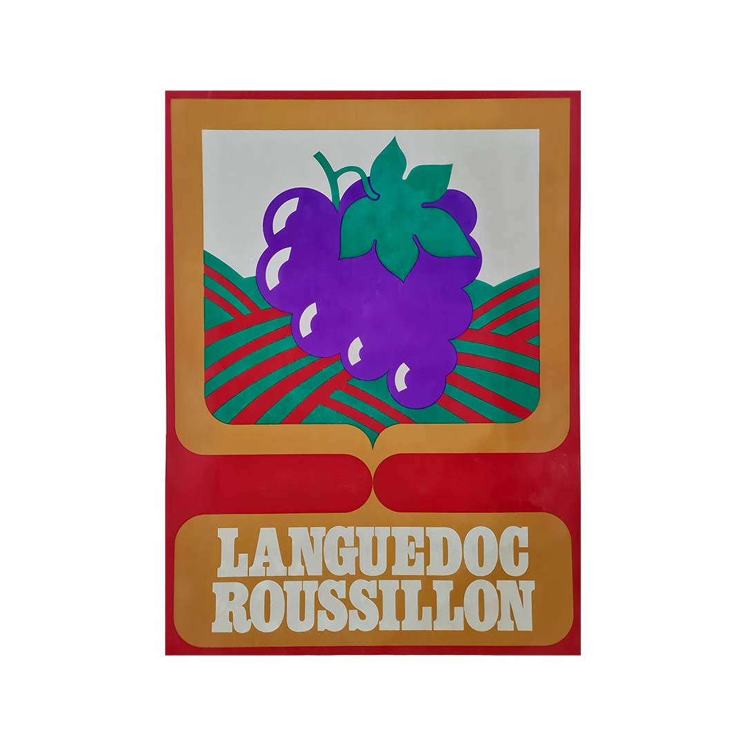 This poster likely served as a regional tourism advertisement or wine promotion, inviting travelers and wine enthusiasts to discover the renowned vineyards, rolling landscapes, and rich cultural heritage of Languedoc-Roussillon. Combining simplicity, elegance, and effective visual storytelling, it stands as a timeless representation of France’s enduring connection to its wine-producing regions.