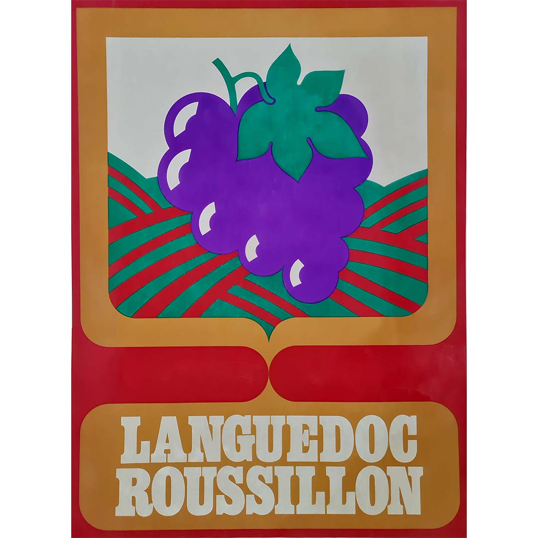 This striking vintage poster celebrating the Languedoc-Roussillon region of southern France embodies the bold, graphic aesthetic characteristic of early 20th-century travel and promotional art. With its vibrant use of color, simplified forms, and Art Deco influences, the poster presents an iconic representation of the region’s most famous product—grapes and vineyards, symbolizing its rich winemaking heritage.