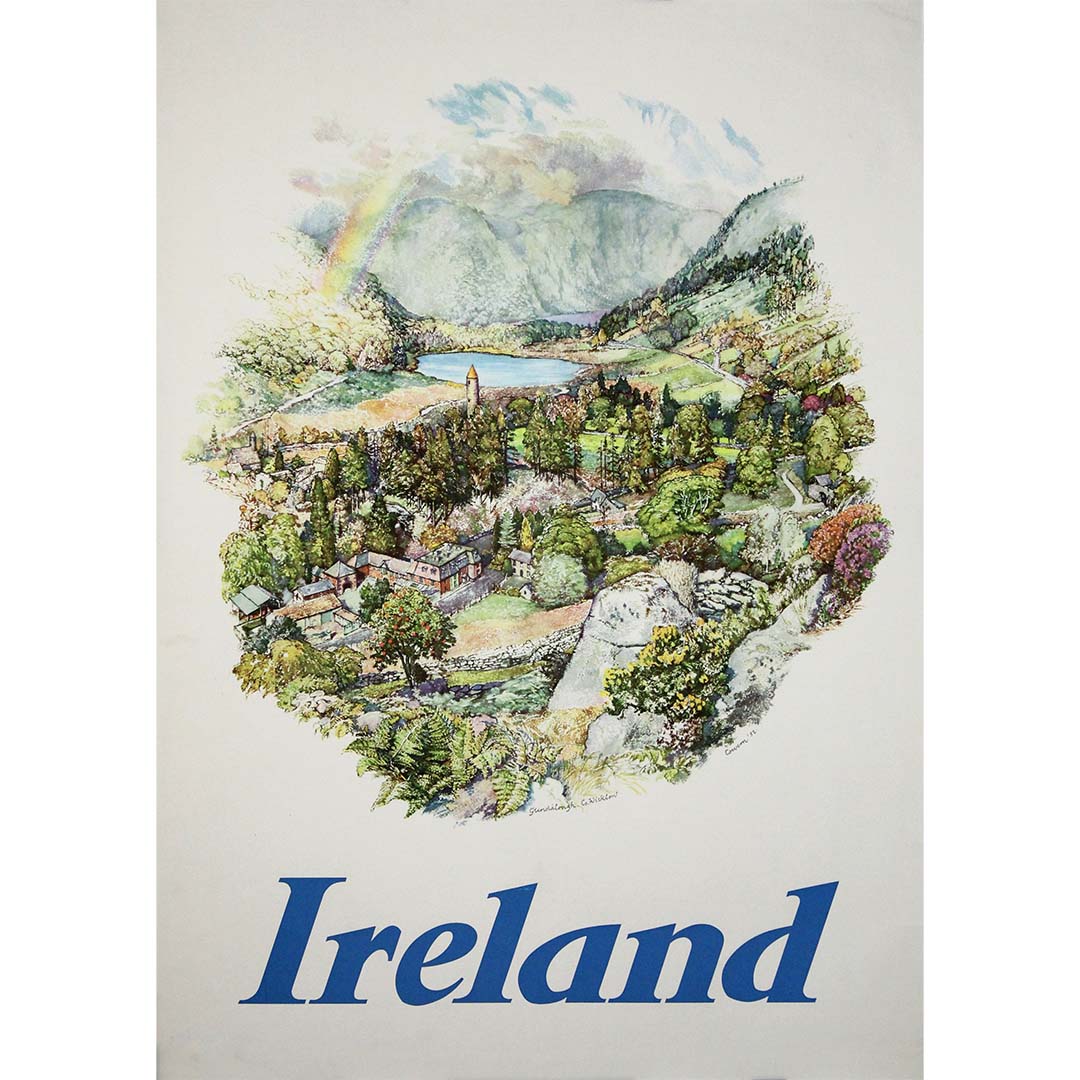 Set in County Wicklow, Glendalough—meaning “Valley of the Two Lakes”—is steeped in monastic history and ancient legend. Cowern’s lush and finely detailed watercolor-style composition brings to life the iconic round tower, tranquil lakes, winding paths, stone cottages, and rolling wooded hills—all framed under a dramatic Irish sky and arcing rainbow. The effect is both idyllic and immersive, like stepping into a living memory of Ireland’s pastoral heritage.