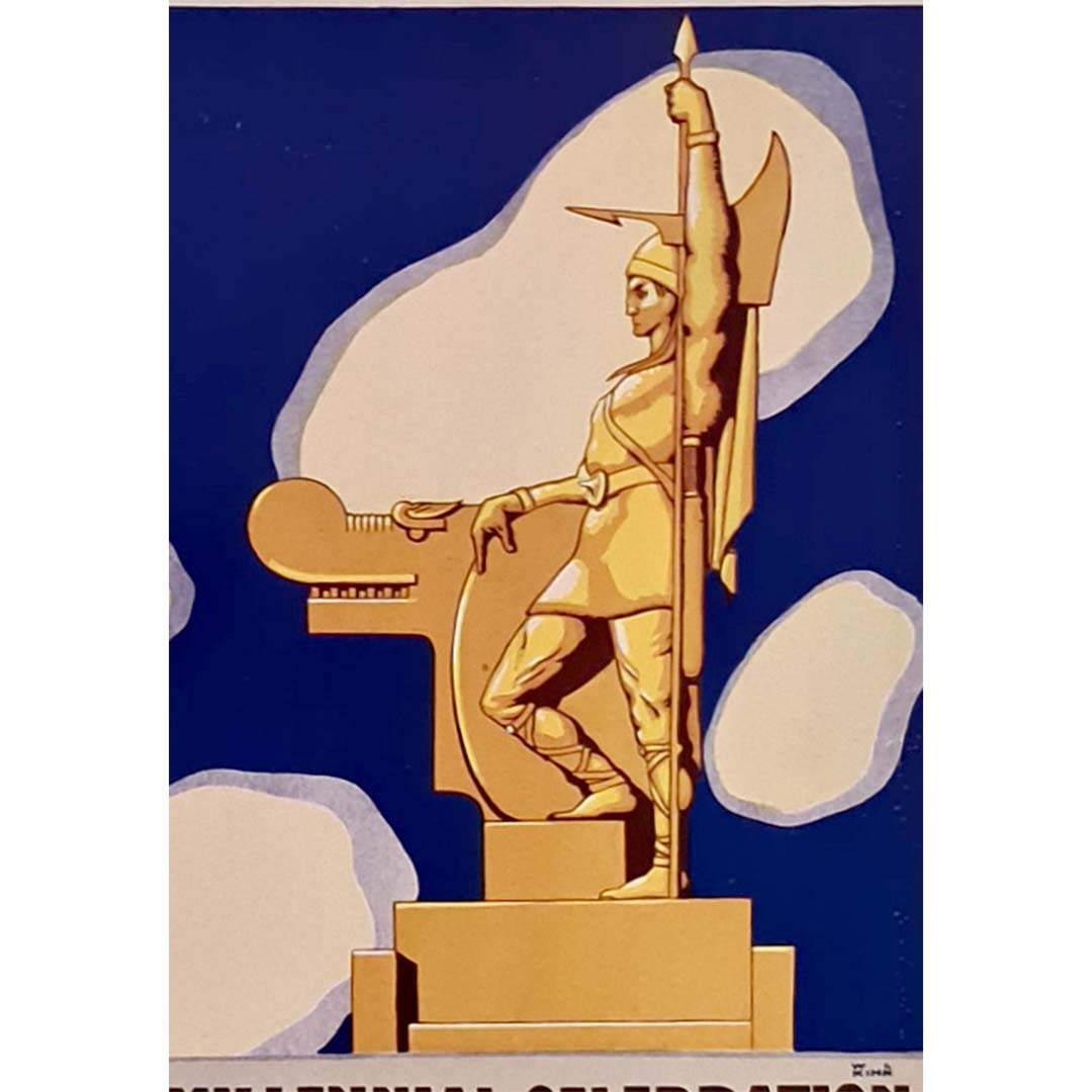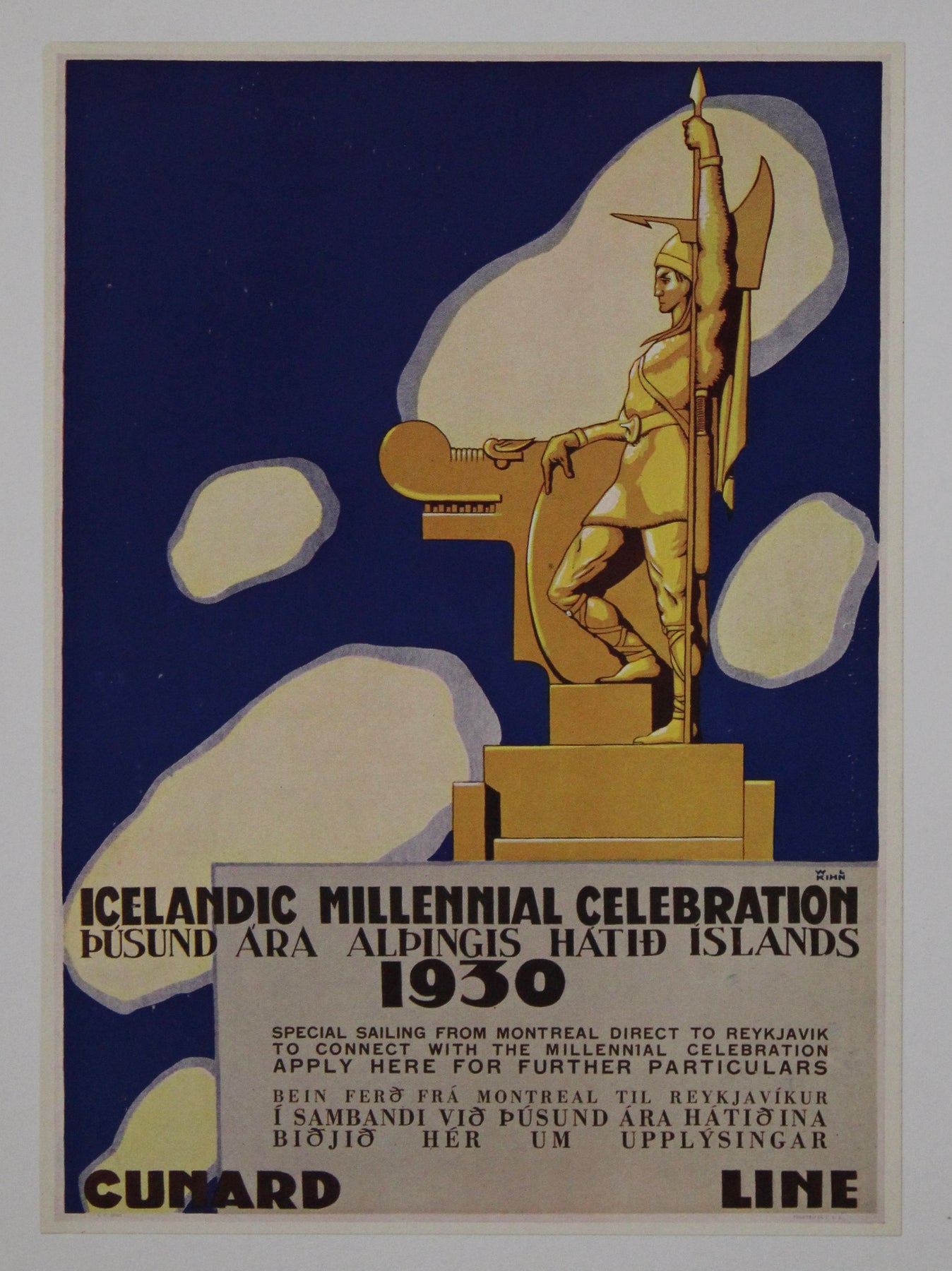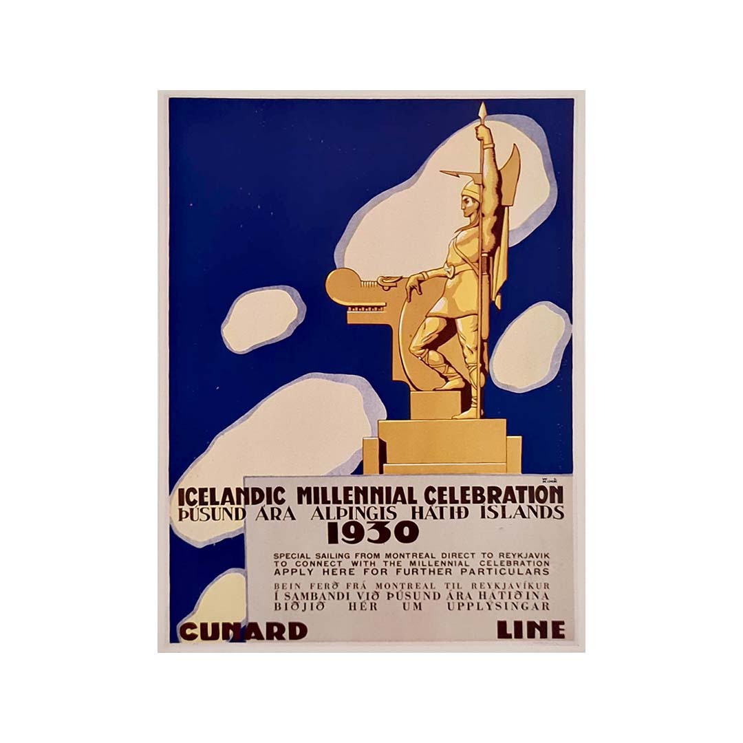 The 1930 original poster reduction by W. Langdon Kihn for the Icelandic Millennial Celebration, commissioned by Cunard Line, is a historical piece promoting travel to Iceland during its millennial celebrations, marking 1,000 years since the settlement of the island. This poster was part of a broader effort to celebrate Icelandic culture and history while highlighting Cunard Line’s role in facilitating travel to unique destinations.