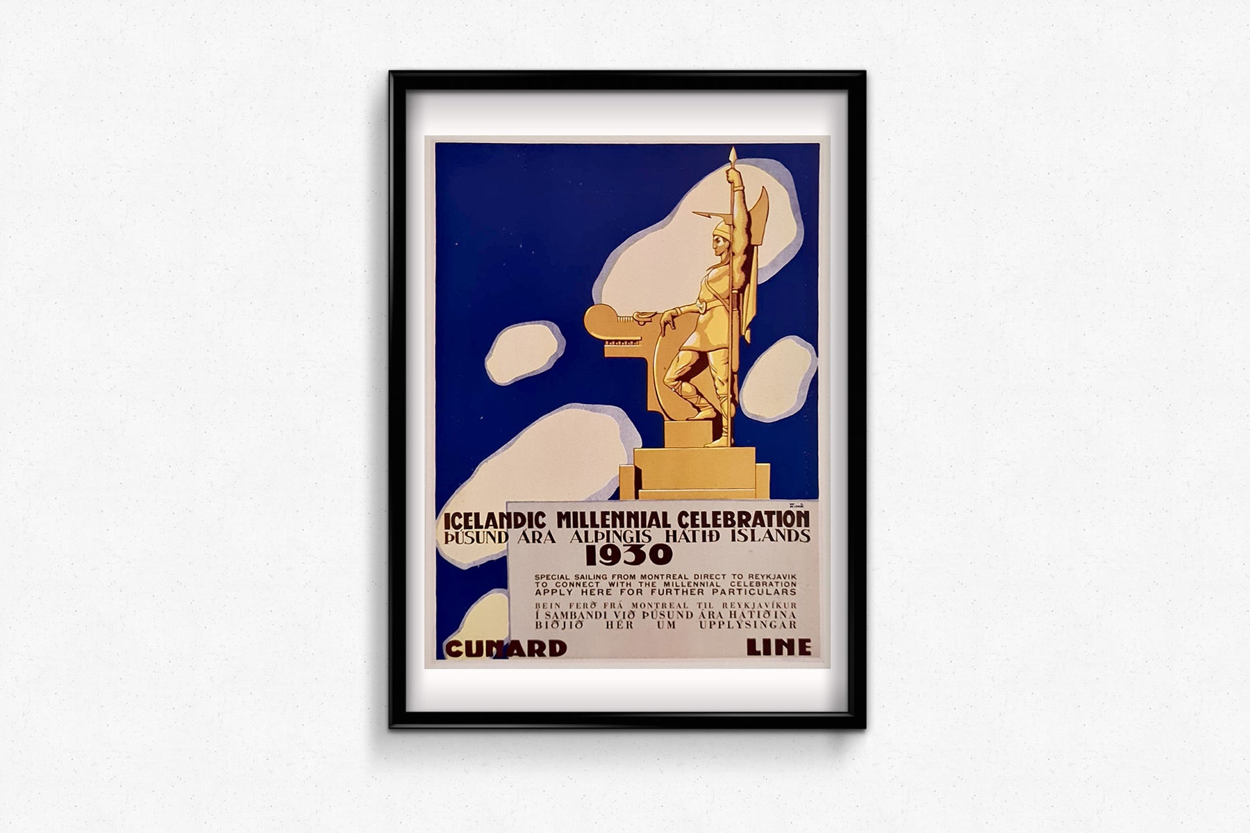 Created during an era when steamship travel symbolized both luxury and adventure, this poster aimed to attract travelers by showcasing Iceland as a remote and culturally significant destination. The millennial celebrations centered on Iceland’s Viking heritage and its enduring legacy, appealing to those with a fascination for history and exploration. Cunard Line positioned itself as the gateway to this once-in-a-lifetime event, offering passengers the opportunity to experience Iceland’s historical significance firsthand.