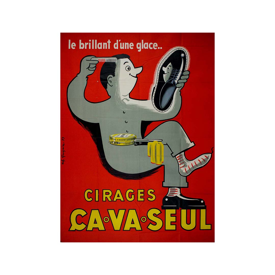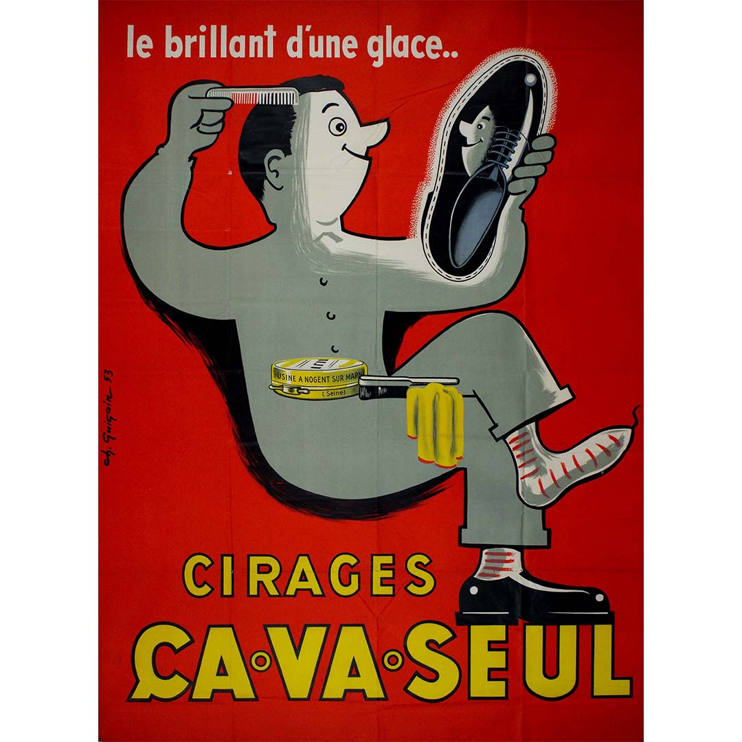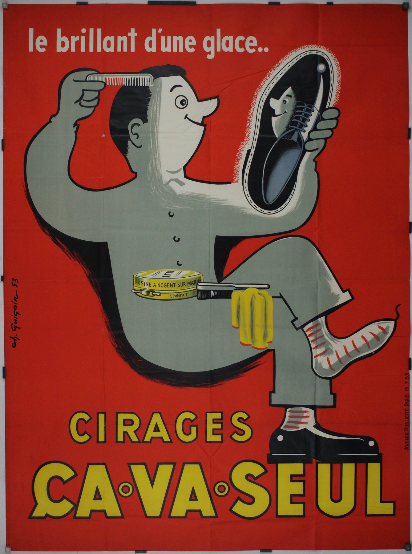 Regular price €800,00The 1953 original advertising poster by Ch. Guigain, titled "Cirages Ca Va Seul," is a captivating example of mid-20th century commercial art. This vibrant and playful poster was designed to promote the "Ca Va Seul" brand of shoe polish, produced by a factory in Nogent-sur-Marne, France.