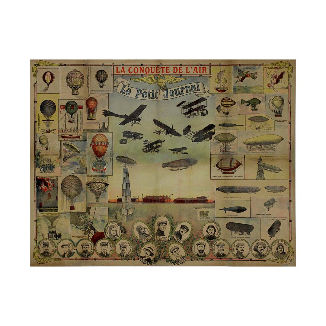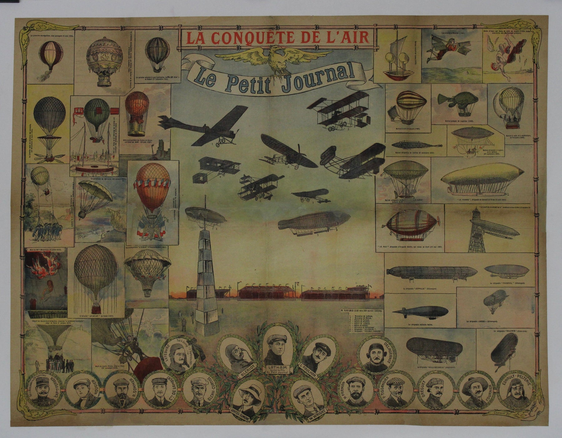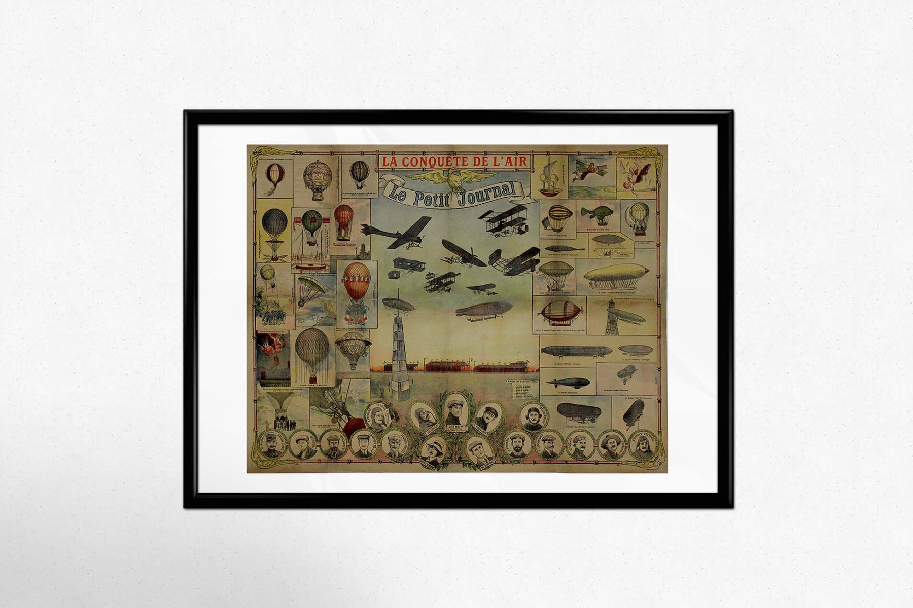 The poster is a colorful and detailed depiction of the various aerial feats and flying machines that captivated the world at the time. It features illustrations of both balloons and airships, which had dominated the skies in earlier decades, as well as the new aeroplanes that were just beginning to revolutionize air travel. At the center of the composition are images of biplanes and monoplanes soaring through the air, symbolizing the future of aviation, with smaller vignettes depicting notable aircraft and flights that had paved the way for modern aviation.