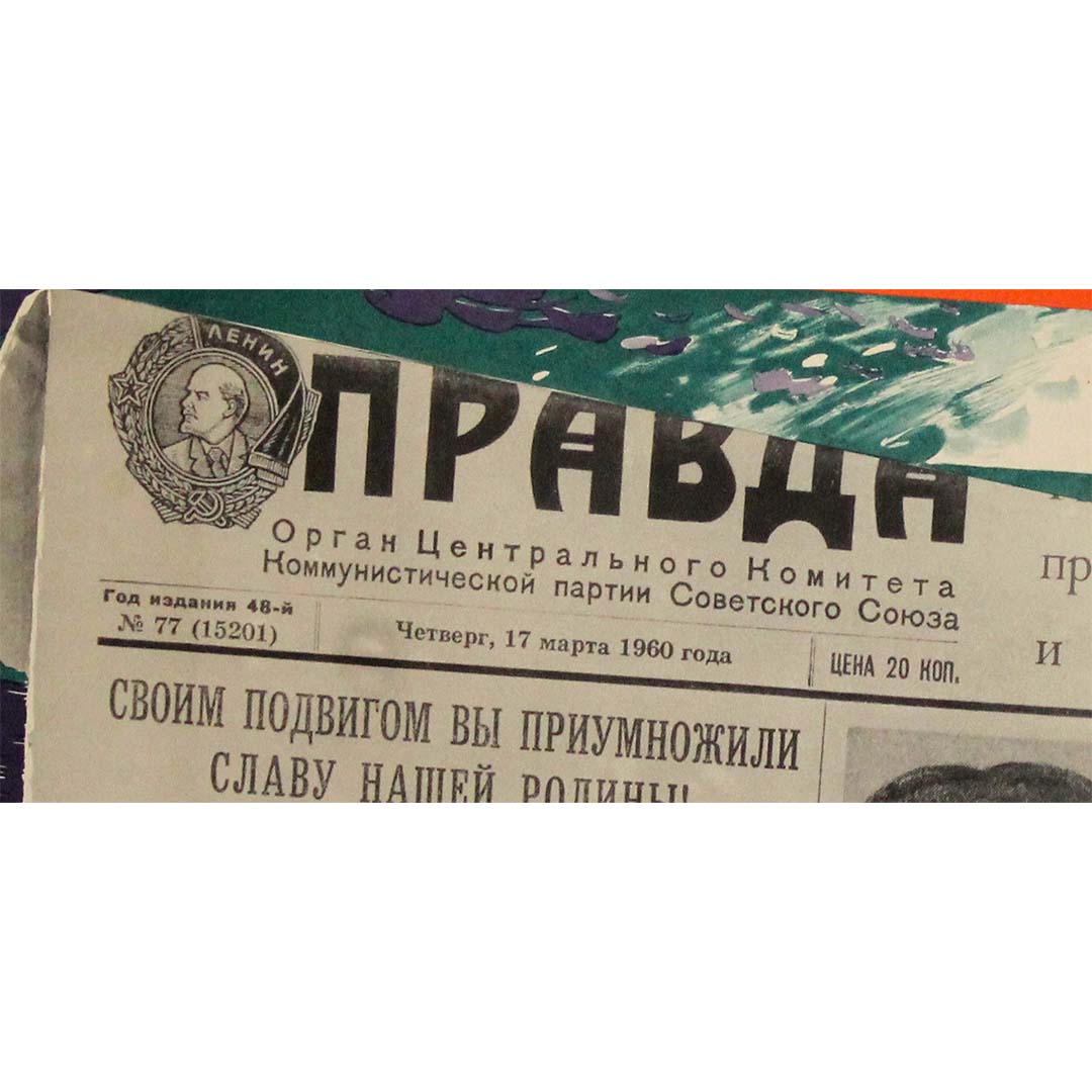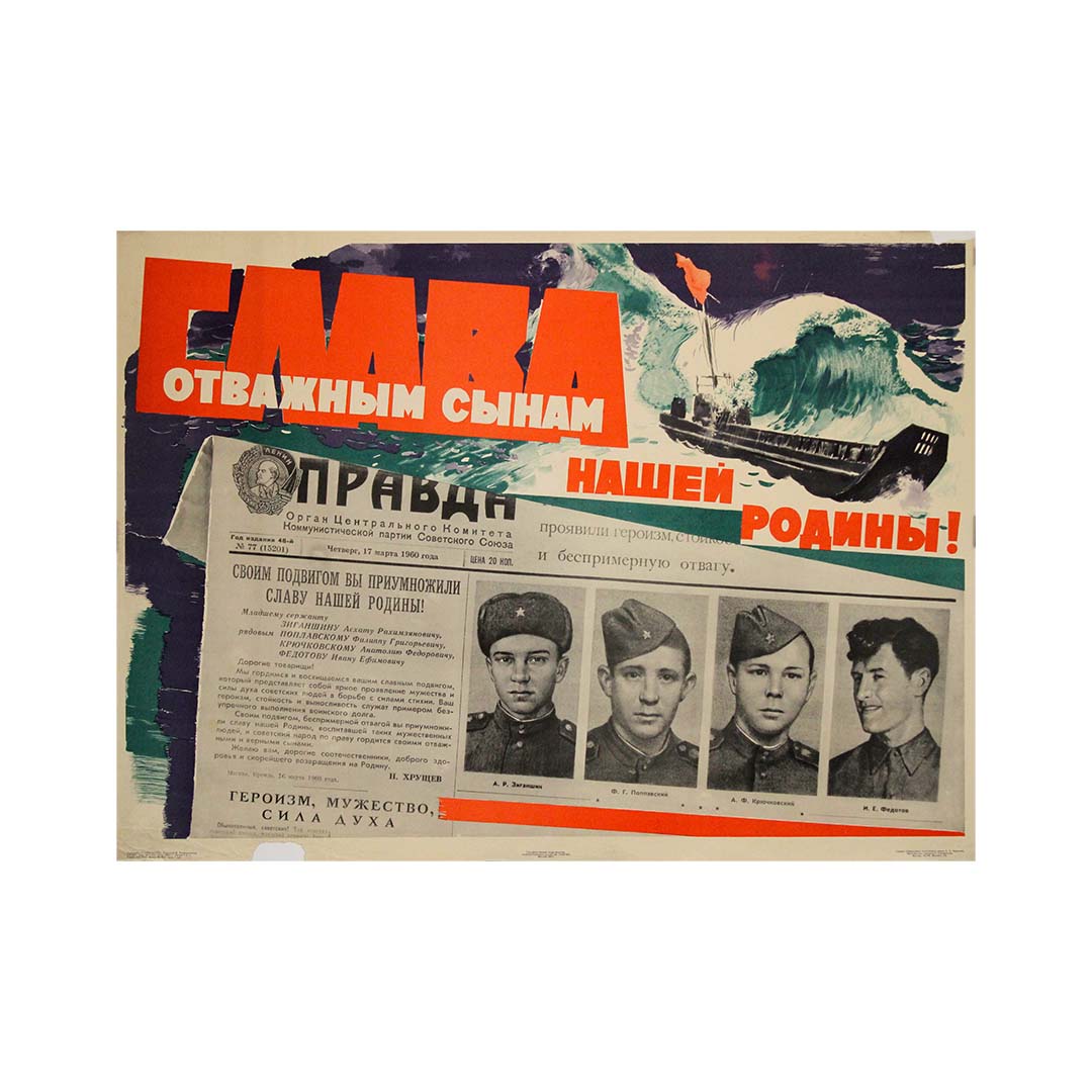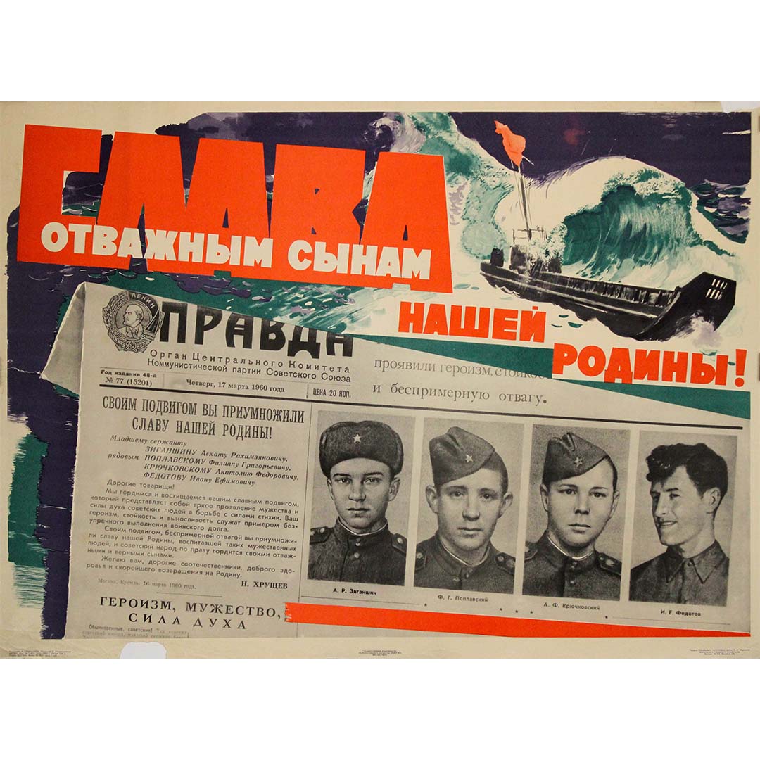 The 1960 original poster titled Aux fils courageux, notre patrie by Isaak Grinstein is a notable example of Soviet-era propaganda art. This piece was printed in Moscow and reflects the USSR's efforts to honor and motivate its military forces during a period marked by Cold War tensions.