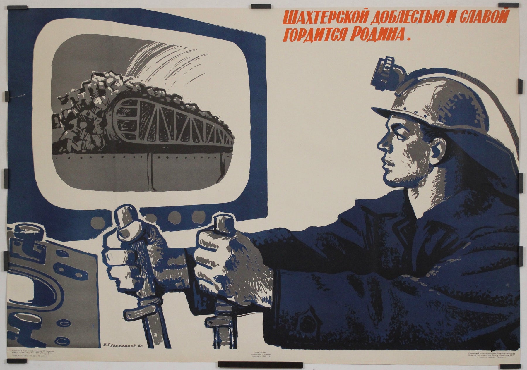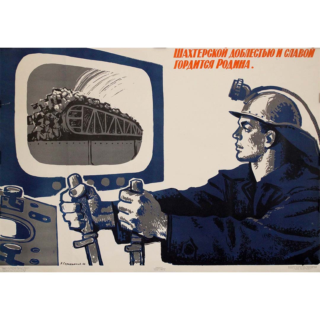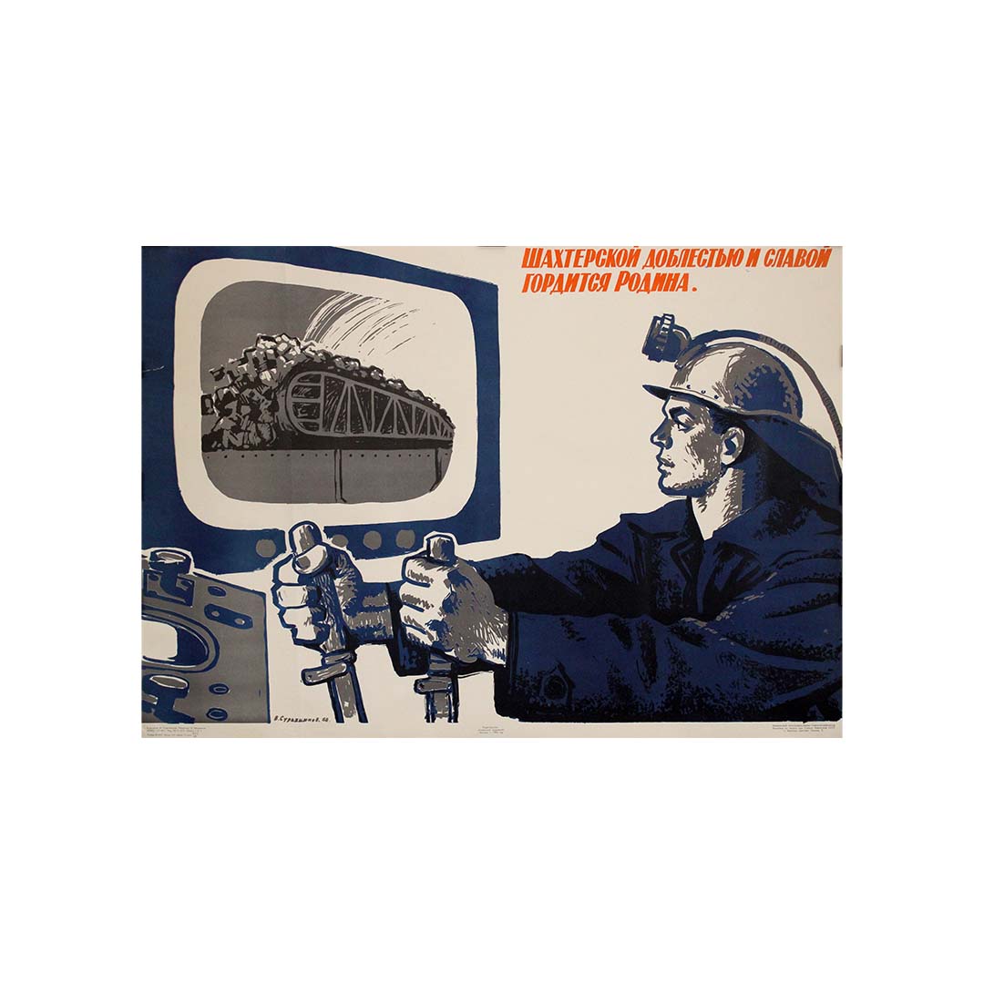 This original 1968 Soviet propaganda poster, created by artist V. Surakninov, pays tribute to the heroism and industrious spirit of Soviet miners. The artwork features a determined coal miner at the controls of a mechanized system, operating the levers with precision and strength. His gaze is fixed on a monitor displaying a fully loaded coal train, emphasizing the scale and significance of his labor.