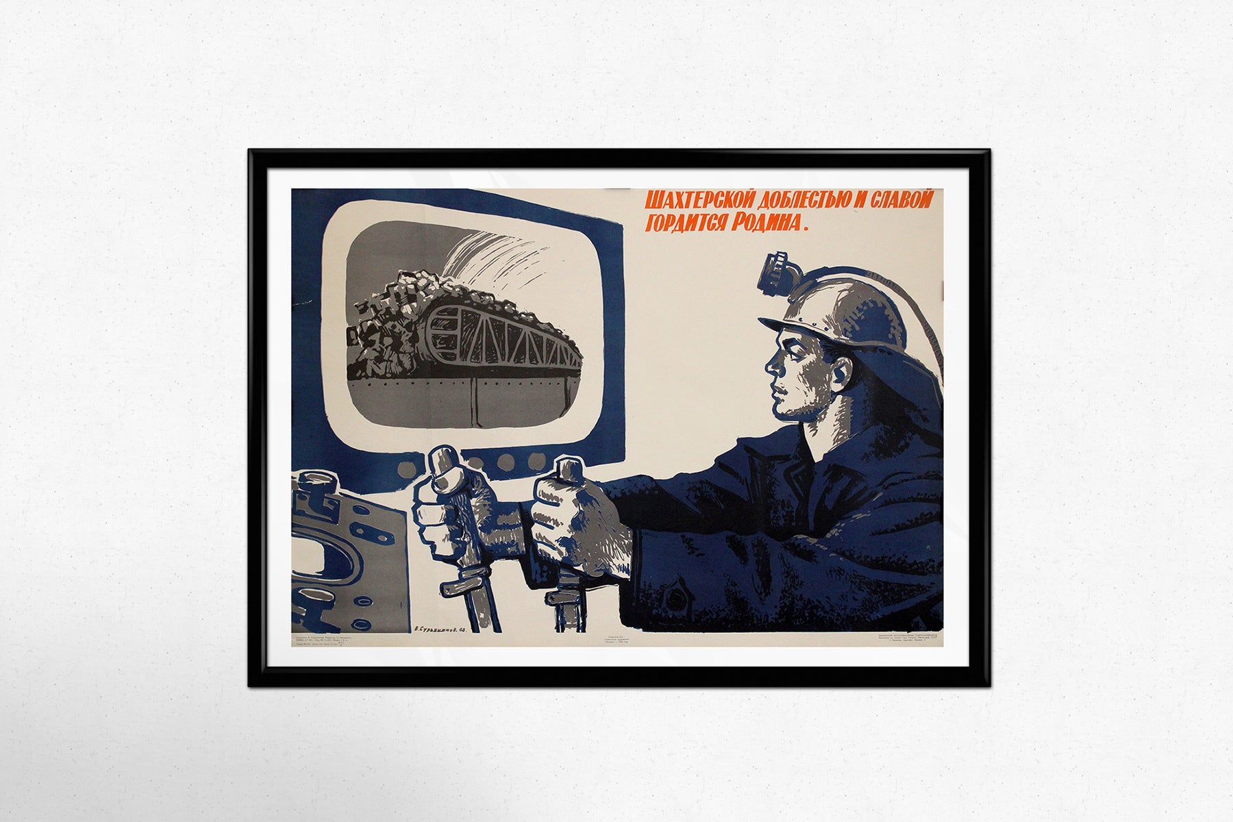 Rendered in a bold, graphic style using a limited palette of blue, black, and white, the composition underscores the mechanization and modernization of Soviet industry. The contrast between the dark tones of the miner’s figure and the bright screen suggests both the physical and technological aspects of mining. The use of strong, angular lines enhances the sense of power and resilience, portraying the worker as both a skilled technician and a national hero.