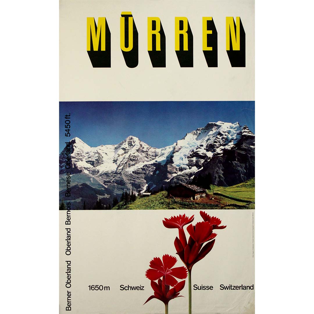 This 1958 original travel poster by the Swiss design duo Gyger & Klopfenstein captures the alpine village of Mürren with arresting clarity and a distinctly modern edge. Situated at 1650 meters in the Bernese Oberland, Mürren is presented not just as a destination, but as a high-altitude ideal — a crystalline harmony of nature, geometry, and visual rhythm.
