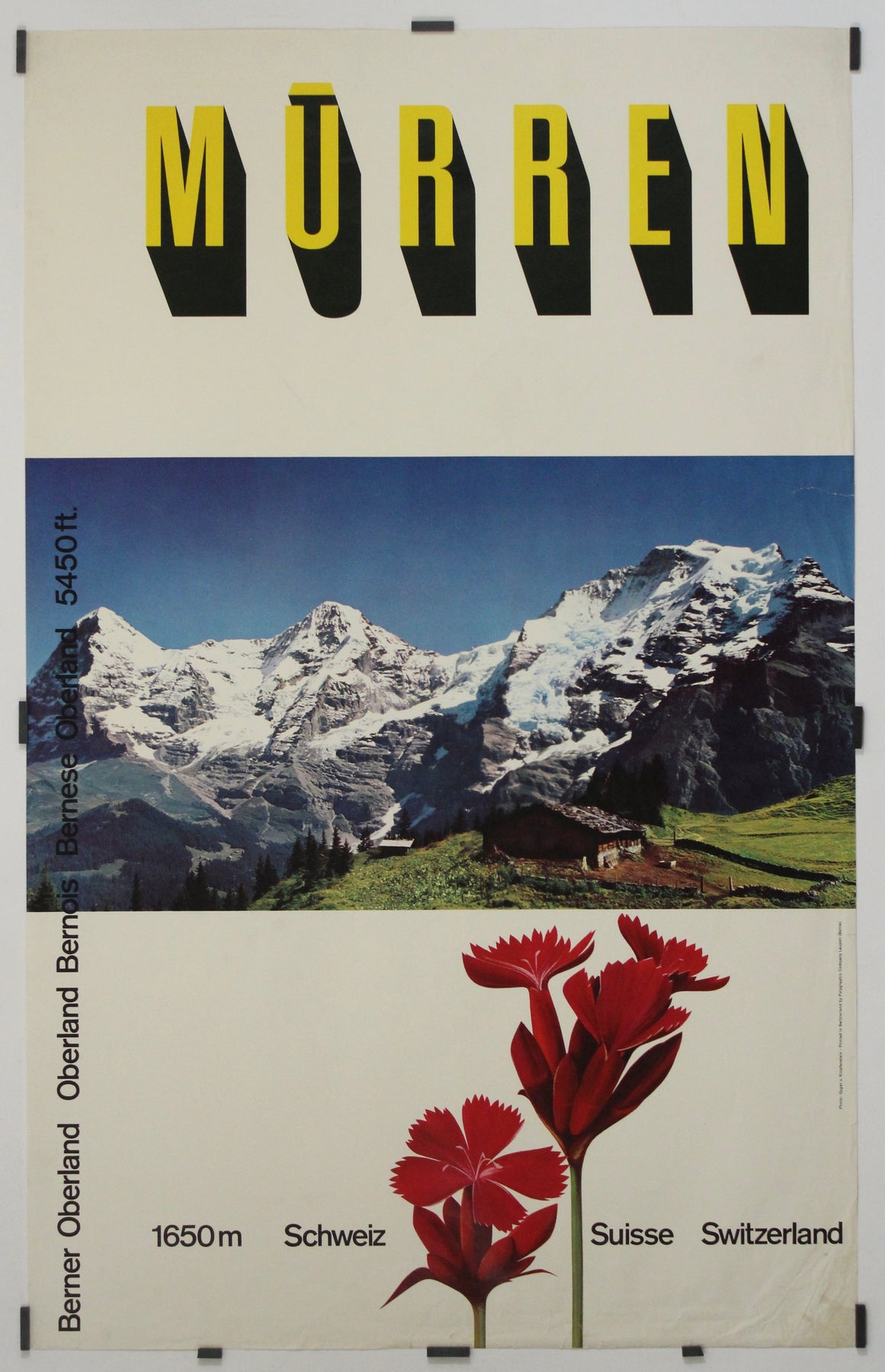 At the top, bold block letters spell MÜRREN in stark yellow and black — a typographic feat of sharp contrast and dynamic shadow, a nod to the International Typographic Style then emerging across Swiss graphic design. The central image delivers a breathtaking panoramic of the Eiger, Mönch, and Jungfrau peaks, whose jagged, snow-covered faces form a rugged counterpoint to the clean lines above and below.