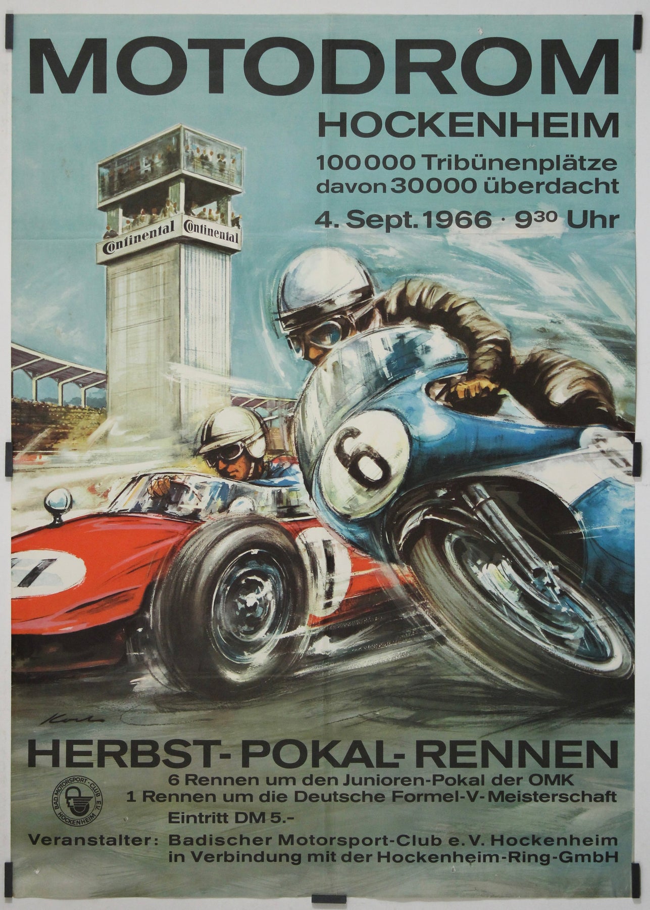 This original 1966 motorsport poster by E. Koch, created for the Herbst-Pokal-Rennen at the Motodrom Hockenheim, was designed to promote the autumn racing meeting held on September 4, 1966. The event took place at the Hockenheimring, one of Germany’s most important and rapidly developing motorsport venues of the period.