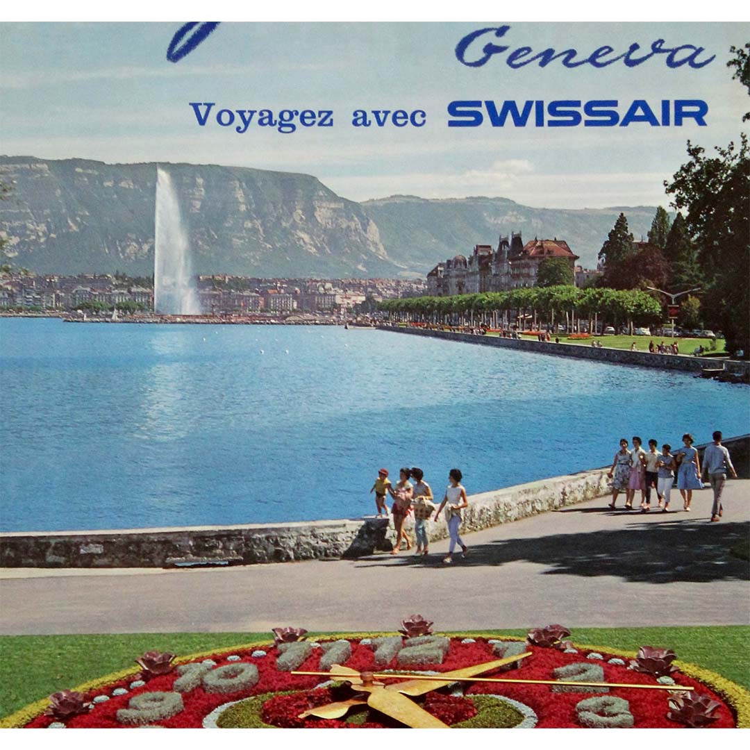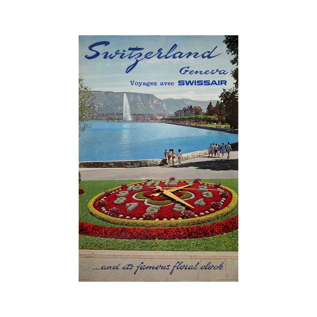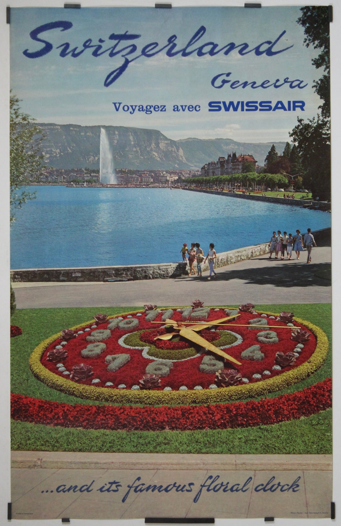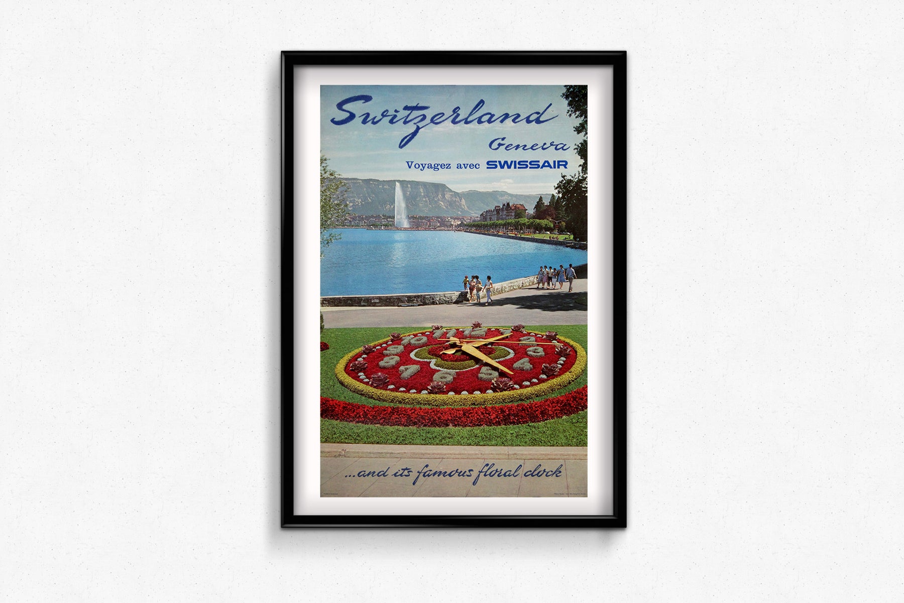This charming 1964 Swissair travel poster by Swiss artist J. Bersier captures the serene elegance and timeless appeal of Geneva, Switzerland. Dominated by a vibrant image of Geneva’s famous L’Horloge Fleurie—the city’s iconic floral clock—the poster masterfully blends tourism and national pride. In the background, the stunning Jet d’Eau fountains over Lake Geneva, framed by the Alpine foothills and the city’s classic architecture.