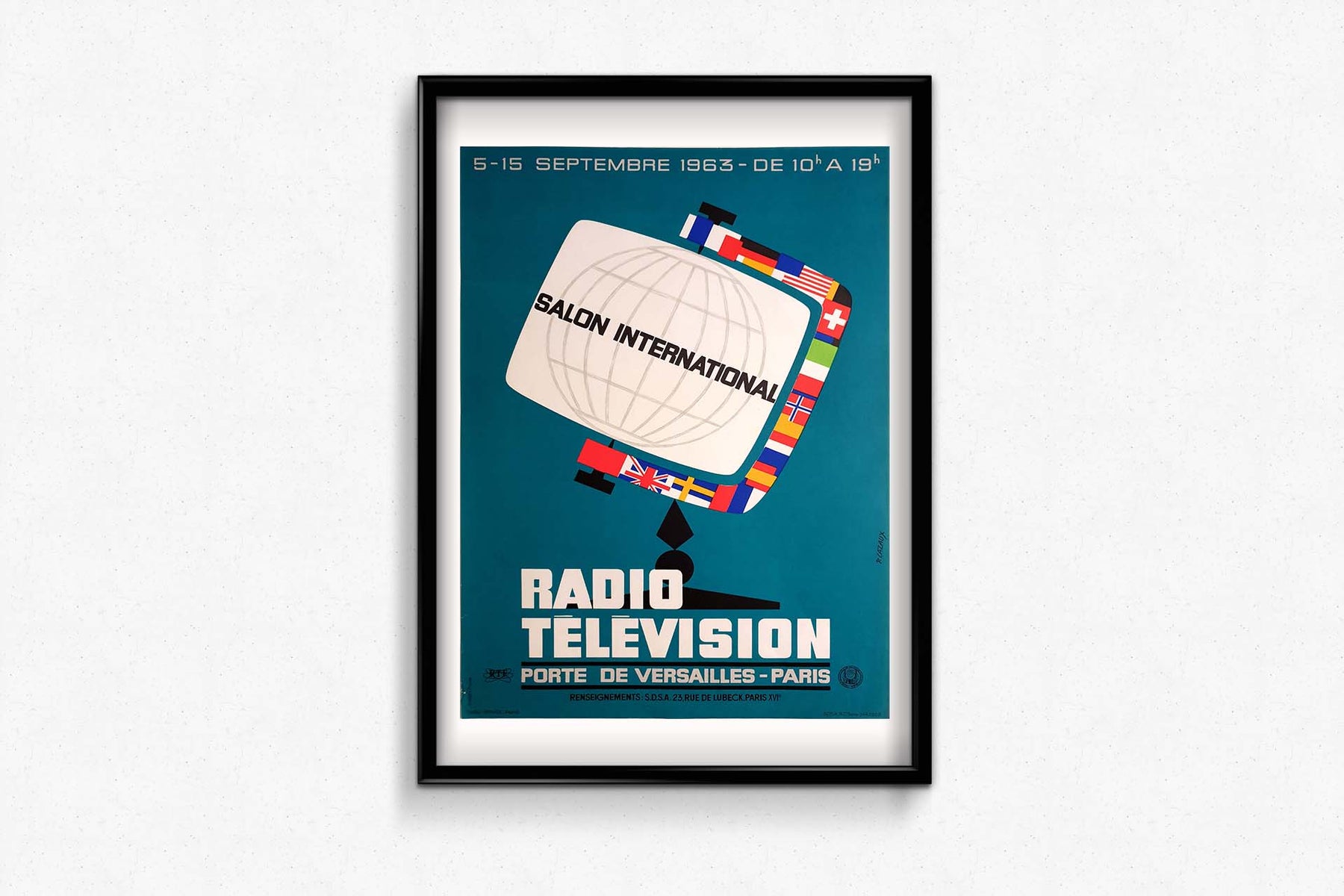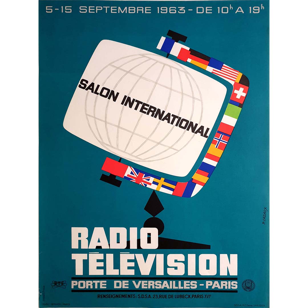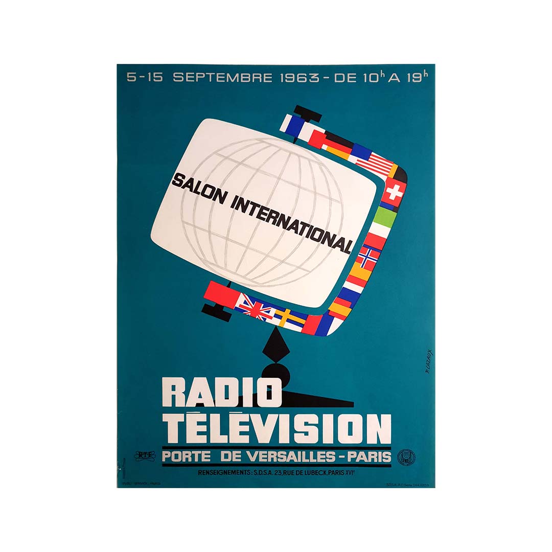 P. Cazaux's 1963 original poster for the Salon International Radio Télévision stands as an emblematic representation of a rapidly evolving era in communication technology. This poster, created to promote the International Radio Television Exhibition, not only serves as promotional material but also encapsulates the excitement, innovation, and anticipation surrounding the world of broadcasting.