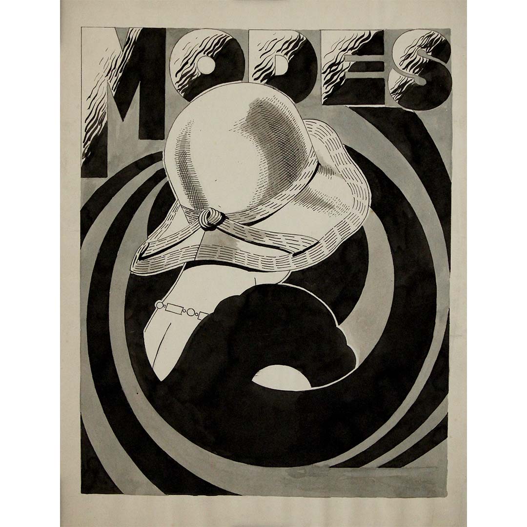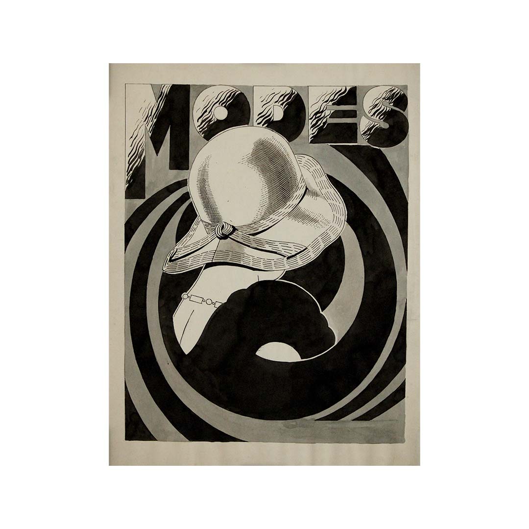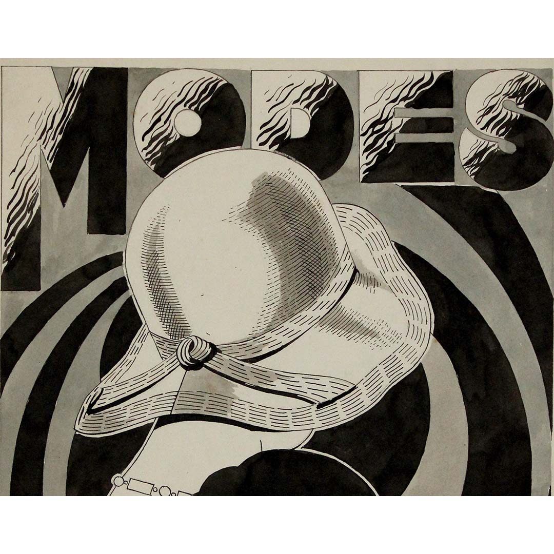 The composition is bold and dynamic, with swirling, geometric patterns that create a sense of movement and modernity. The typography of "MODES", with its sculpted, shadowed letters, adds depth and reinforces the sleek, sophisticated aesthetics of the time. The shading techniques, including hatching and tonal gradients, showcase the artist’s skill in rendering texture and contrast through ink.