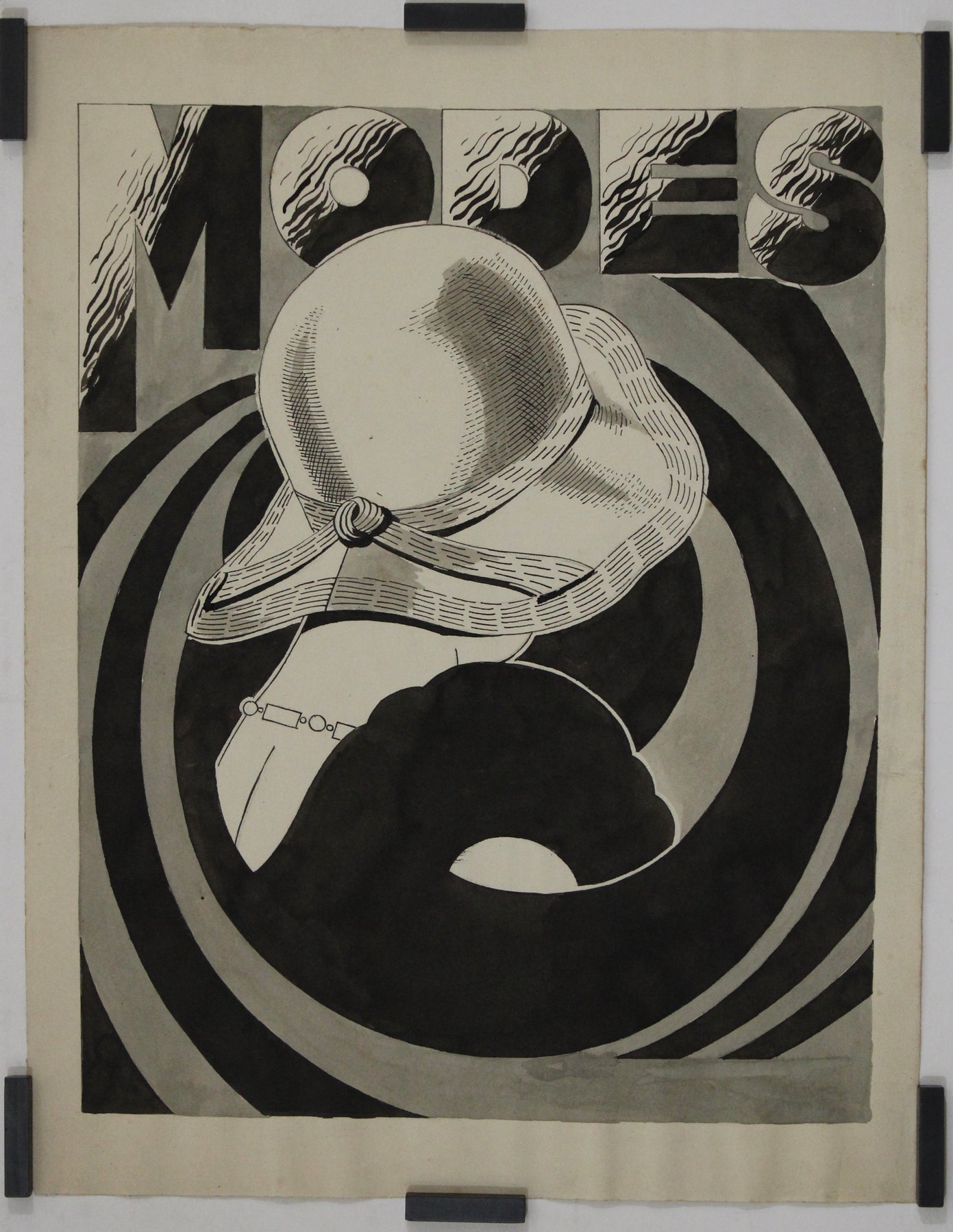 This circa 1930 ink poster project, titled "Modes," is a striking representation of Art Deco fashion illustration. Hand-drawn in black ink and wash, the artwork captures the essence of early 20th-century elegance. The central figure—a woman seen from behind—wears a wide-brimmed hat and a stylish backless dress, embodying the refined glamour of the era.