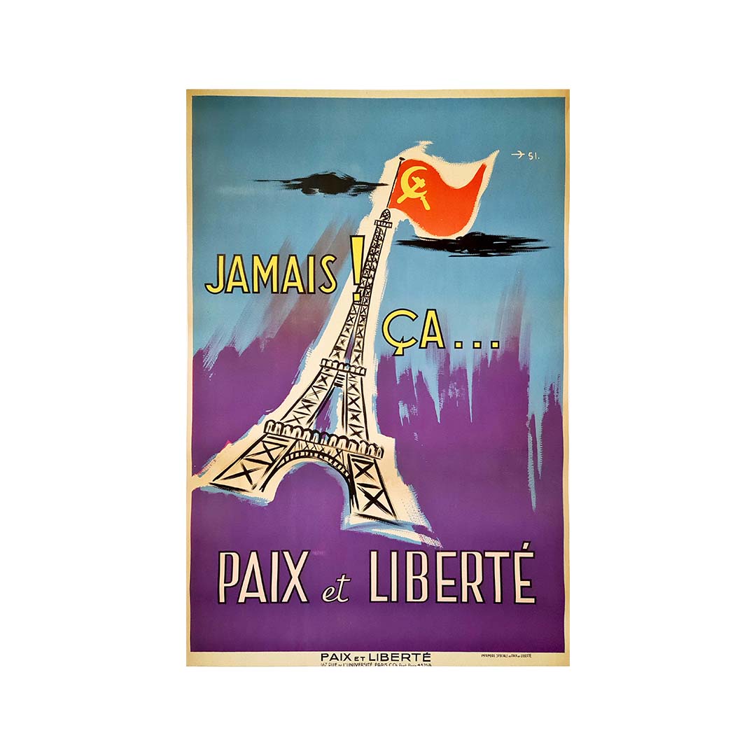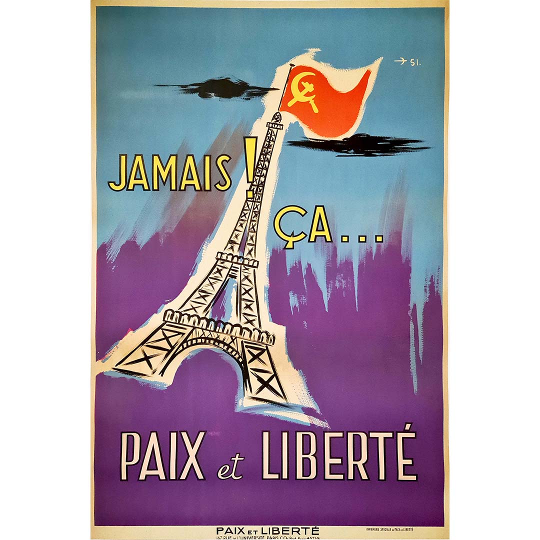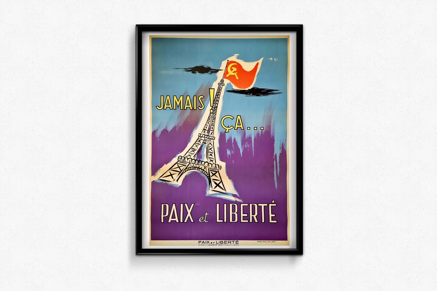 The 1951 original poster for Paix et Liberté titled Jamais ! Ça. is a powerful piece of anti-communist propaganda, notable for its stark imagery and bold message. Designed during the height of the Cold War, the poster reflects the Paix et Liberté movement’s mission to combat the influence of communism in post-war France and across Europe.
