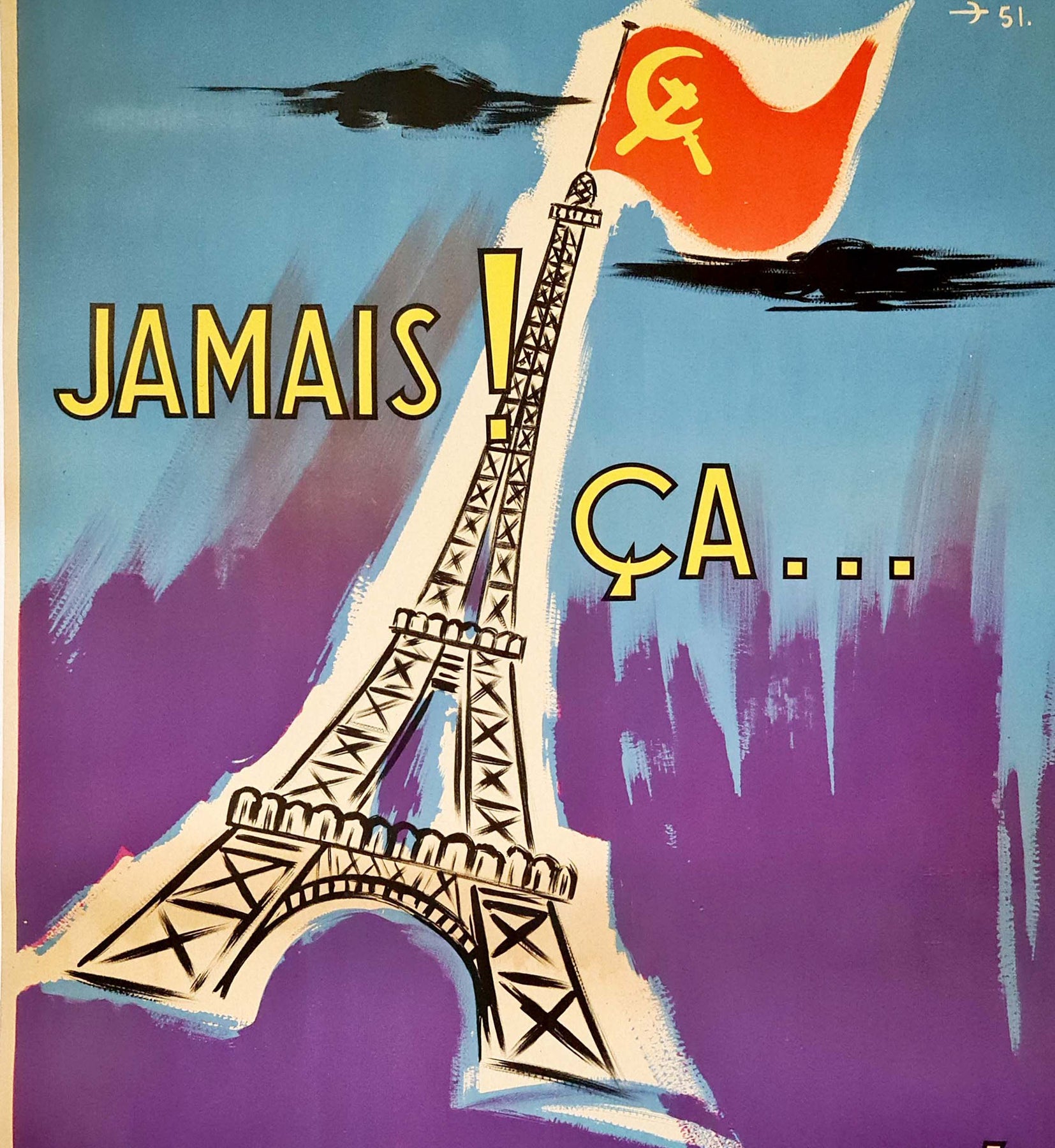 The visual centerpiece of the poster is the iconic Eiffel Tower draped in the ominous red flag of communism, emblazoned with the hammer and sickle. This striking image symbolizes the fear of France—represented by one of its most cherished national symbols—falling under Soviet control. The slogan Jamais ! Ça. (Never! This.) reinforces the urgent plea to resist the perceived threat of communist ideology and the loss of freedom it represented.