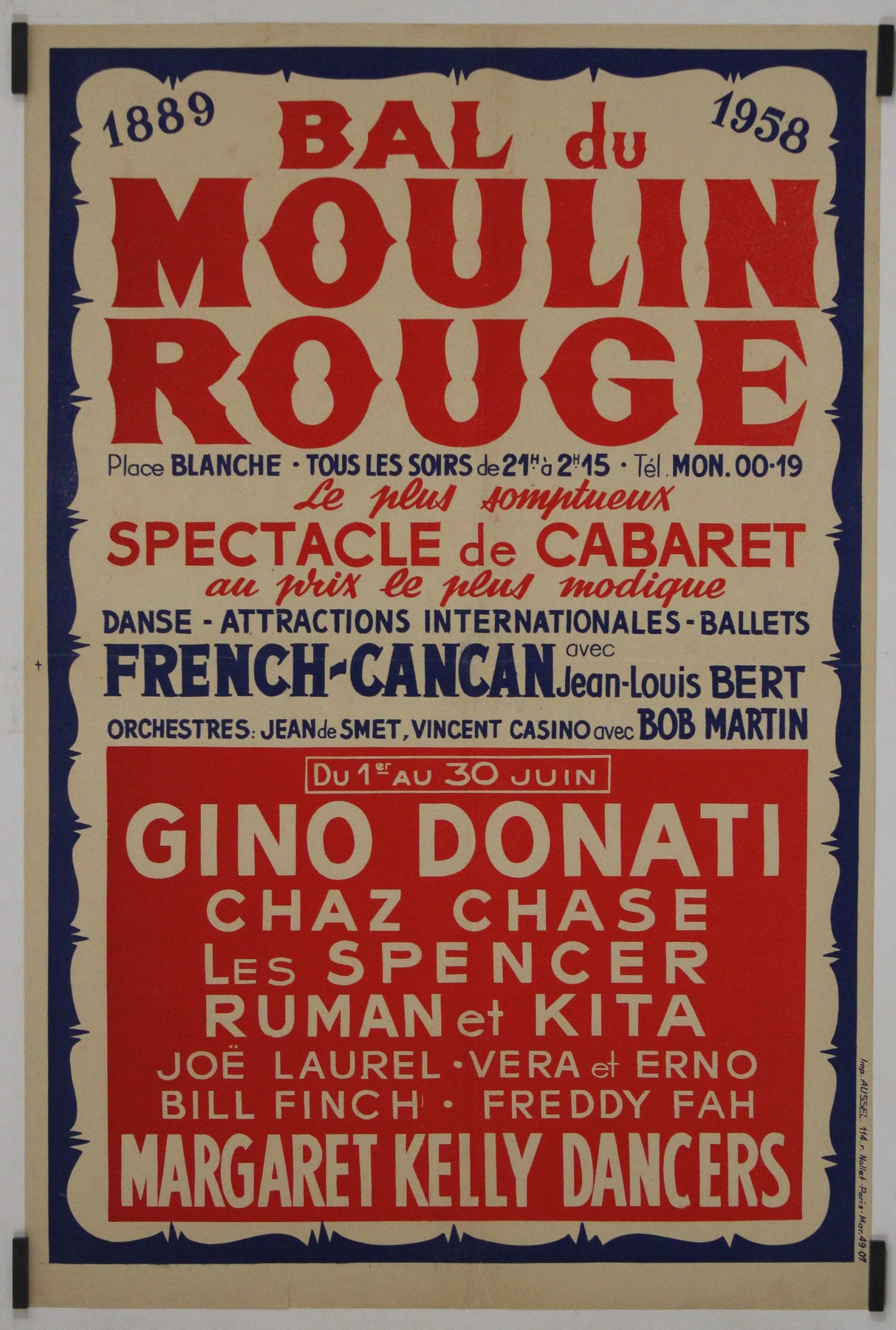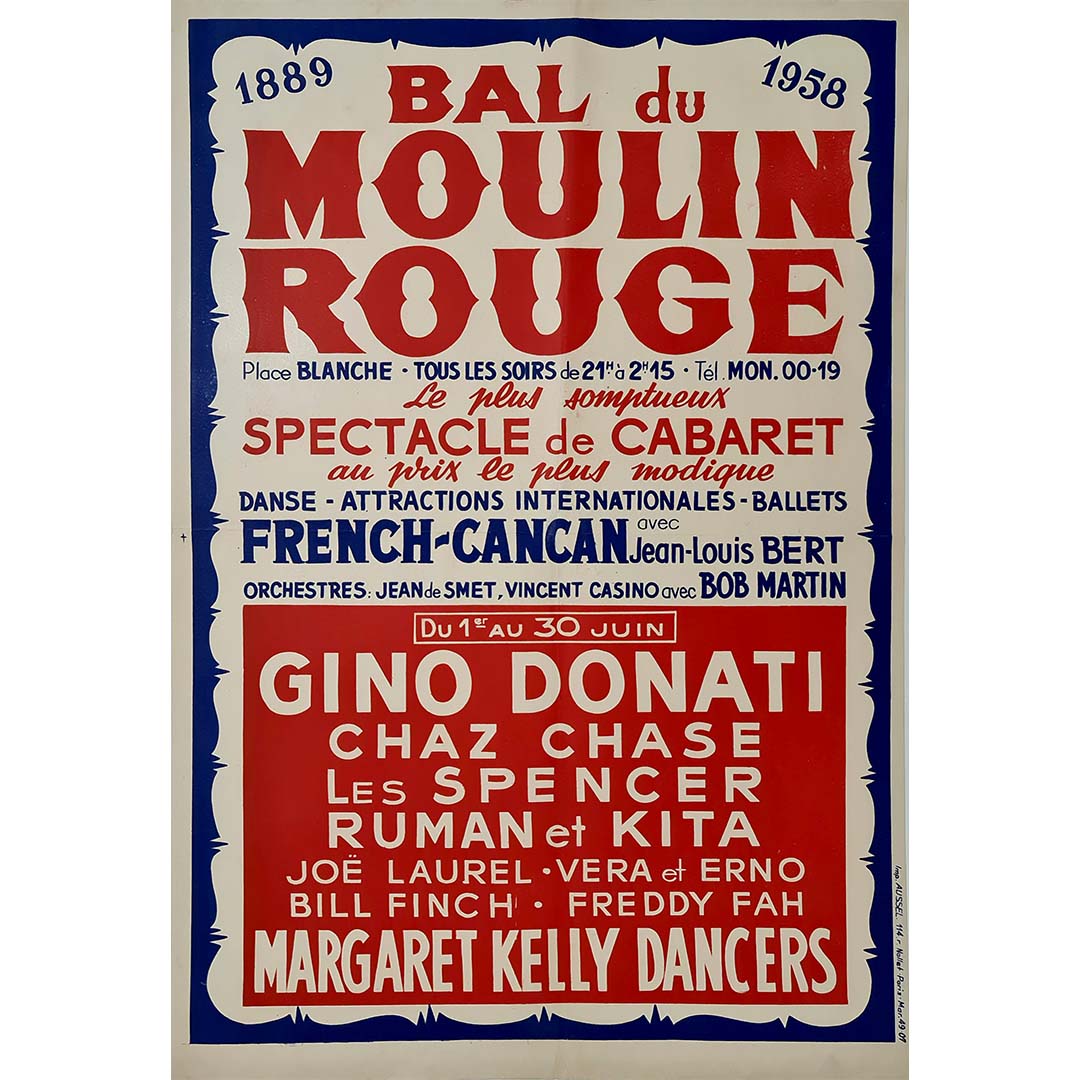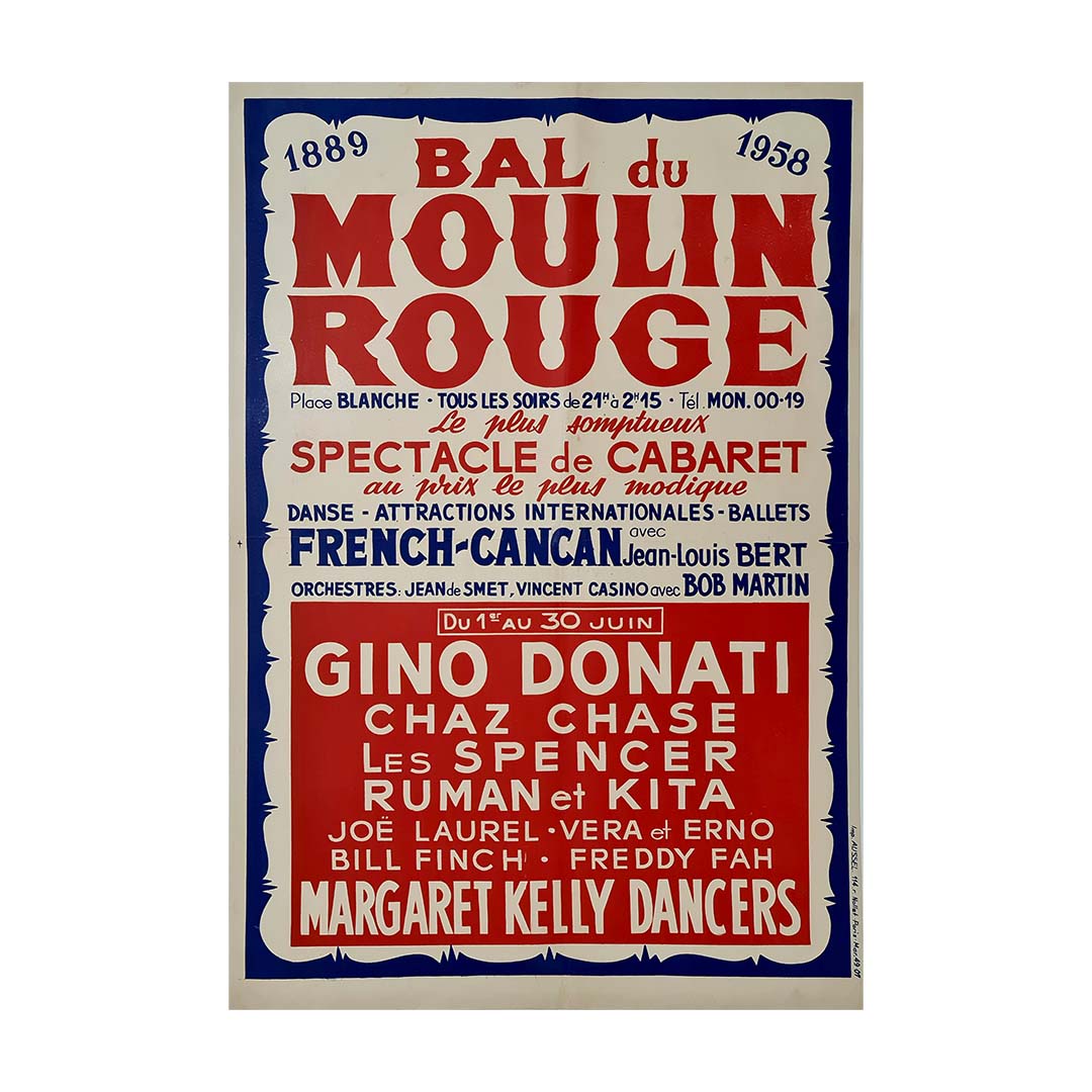 This 1958 original vintage poster for the Bal du Moulin Rouge is a striking example of mid-century Parisian cabaret advertising. Designed with a bold red, white, and blue color scheme, it captures the essence of the world-famous Moulin Rouge, a legendary Parisian nightclub that has been an icon of French entertainment since its opening in 1889.