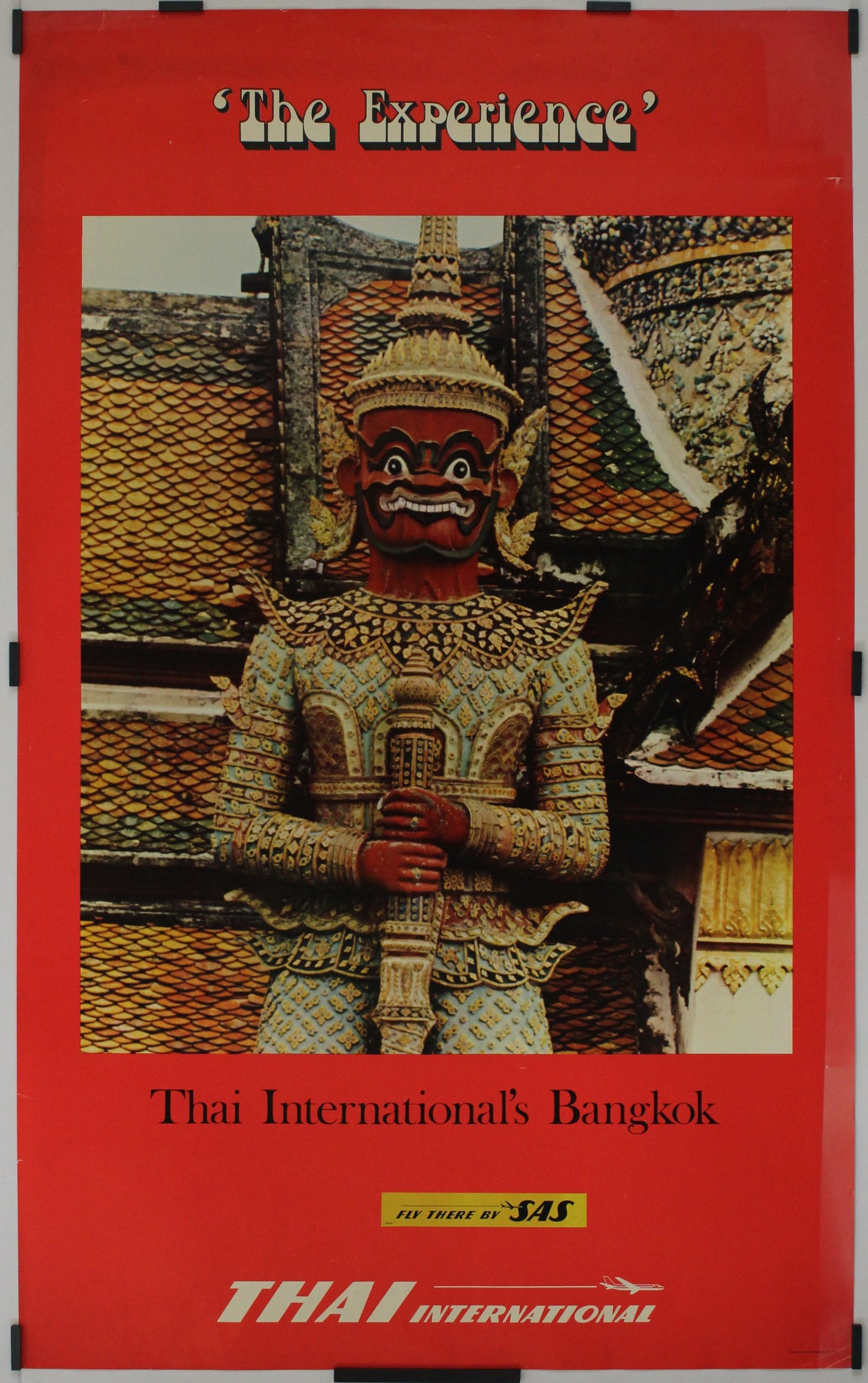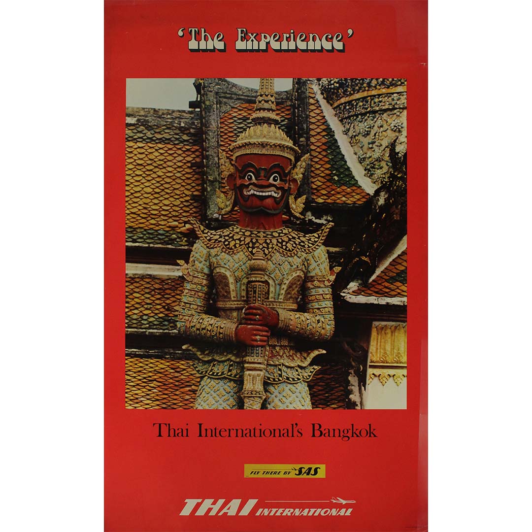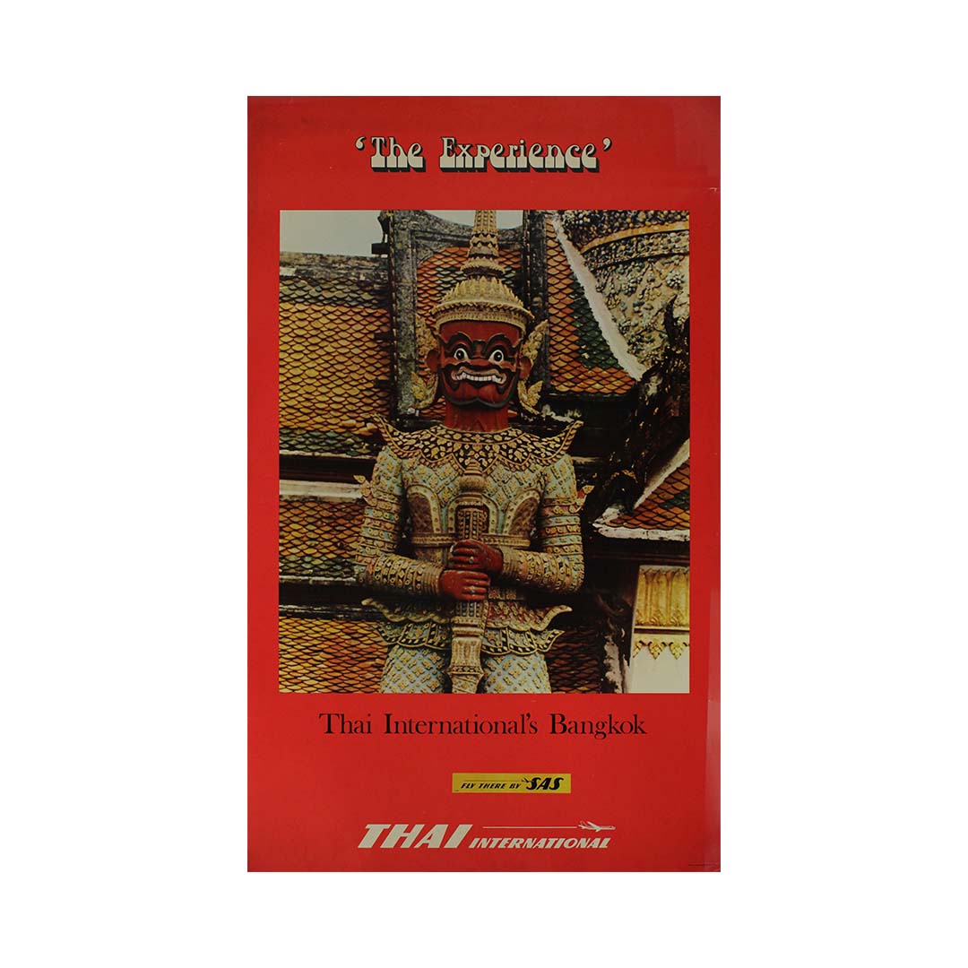 This striking 1950s travel poster for Thai International (now Thai Airways) captures the allure and mystique of Bangkok, Thailand, inviting travelers to immerse themselves in “The Experience.”