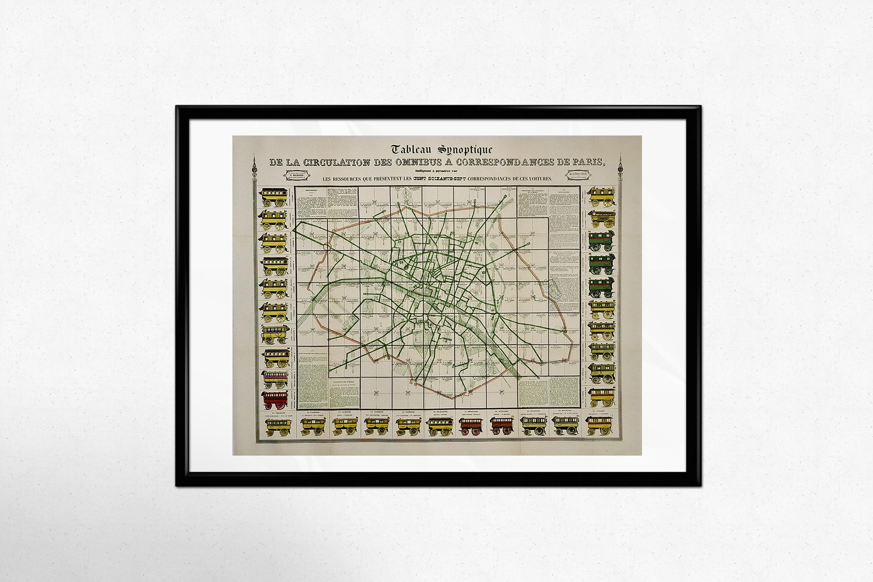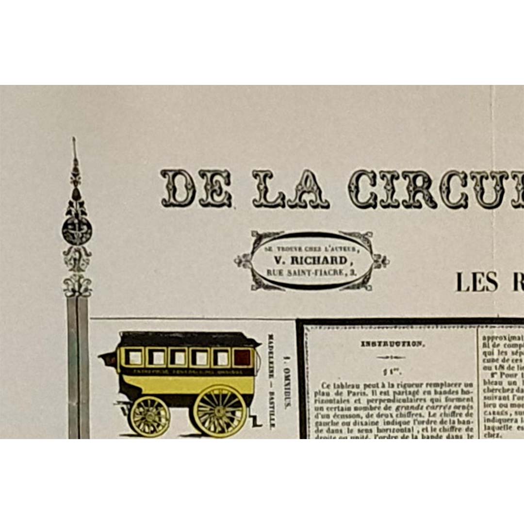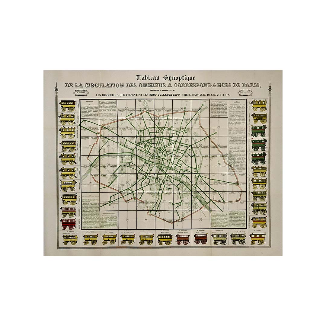 This remarkable original poster offers a snapshot of the Parisian public transportation system before 1854, capturing the intricate network of horse-drawn omnibuses that circulated throughout the capital. Titled “Tableau synoptique de la circulation des omnibus à correspondances de Paris,” it is one of the earliest known attempts to visually organize and standardize the routes of public vehicles within the rapidly expanding urban landscape of Haussmann-era Paris.