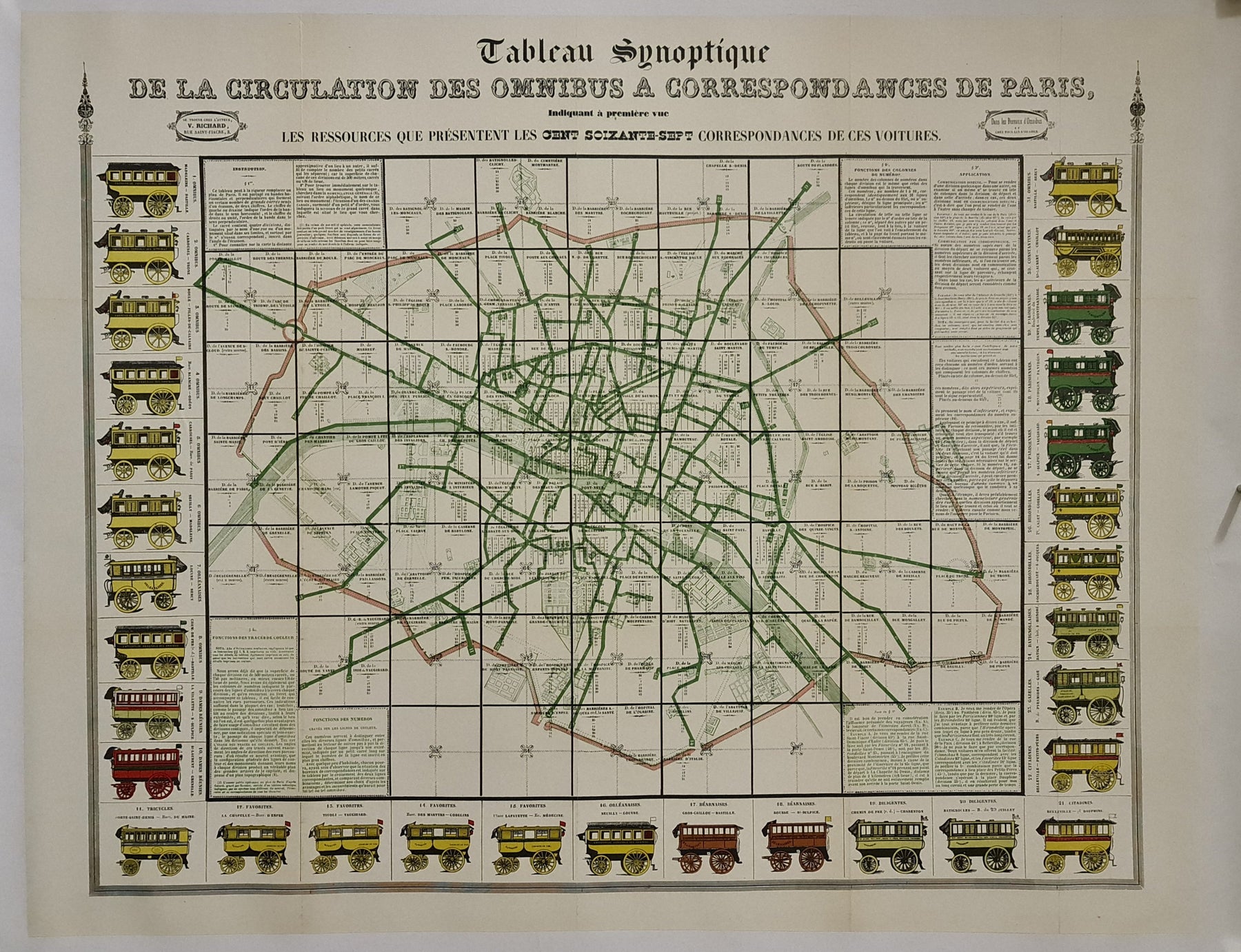 The poster presents a grid-style map of Paris, overlaid with fine green and red lines representing the omnibus routes and their interconnections. Along the edges are colorful illustrated depictions of various omnibus models, each labeled and numbered, helping passengers identify which vehicles served particular lines or destinations. The design is both functional and decorative, blending cartographic precision with early 19th-century artistic charm.