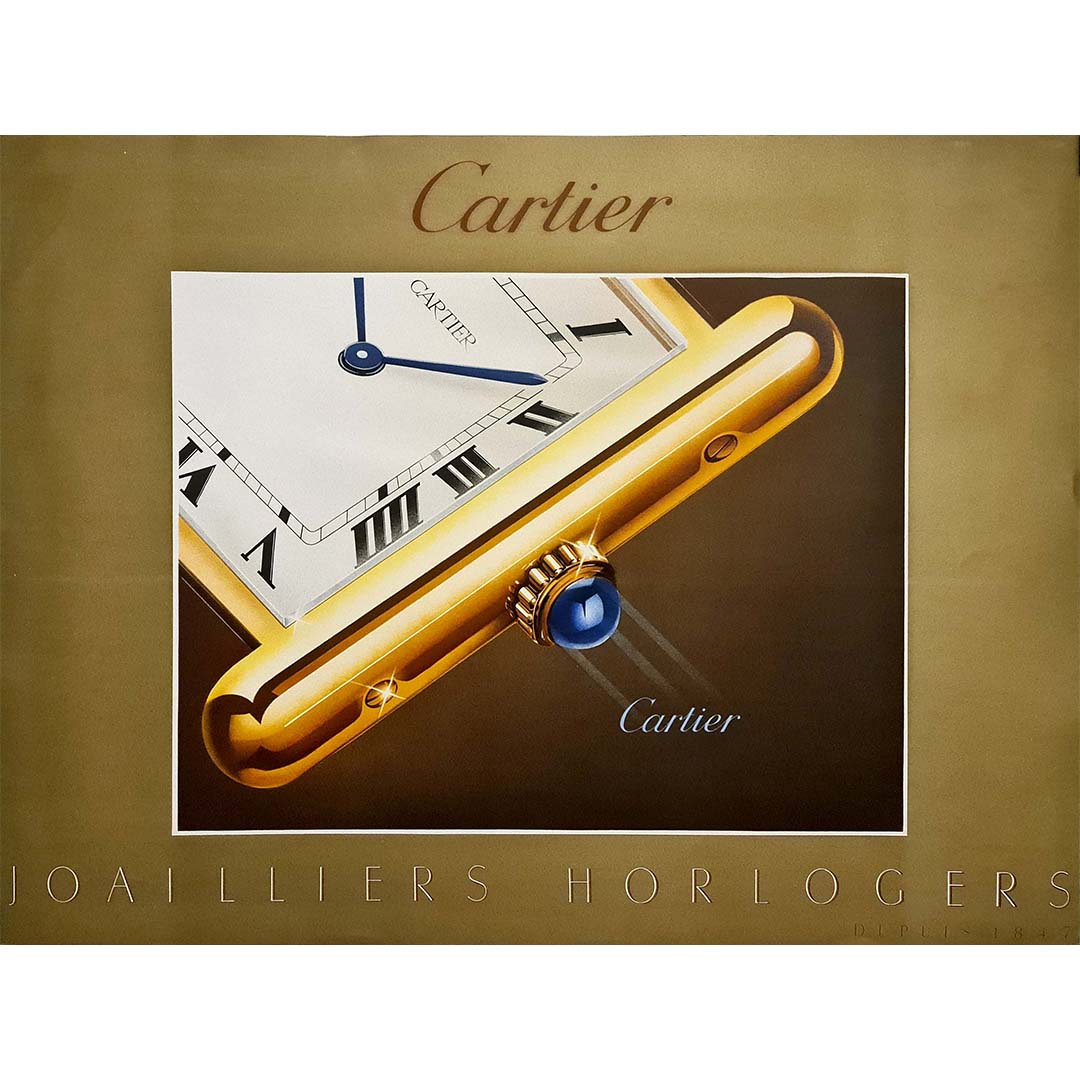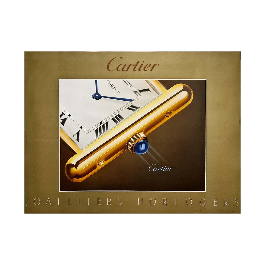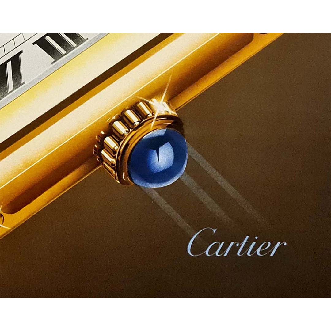 The 1985 poster emphasizes Cartier’s expertise in watchmaking, with the focus on a close-up of one of its iconic timepieces. The clean, minimalistic composition is dominated by an enlarged image of a Cartier wristwatch, likely the classic Tank model, which was originally designed in 1917. The Roman numerals on the dial and the blue sapphire cabochon crown, signature elements of Cartier watches, are prominently displayed, highlighting the exquisite attention to detail and precision craftsmanship for which Cartier is famous.