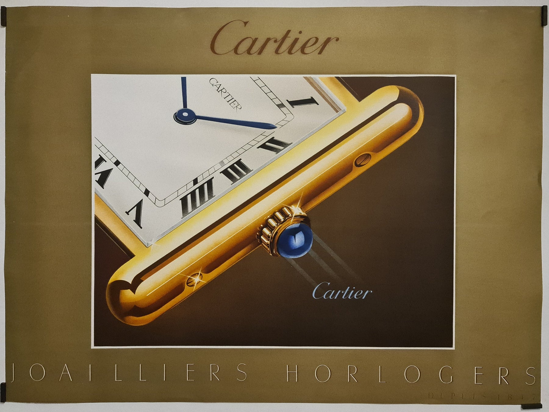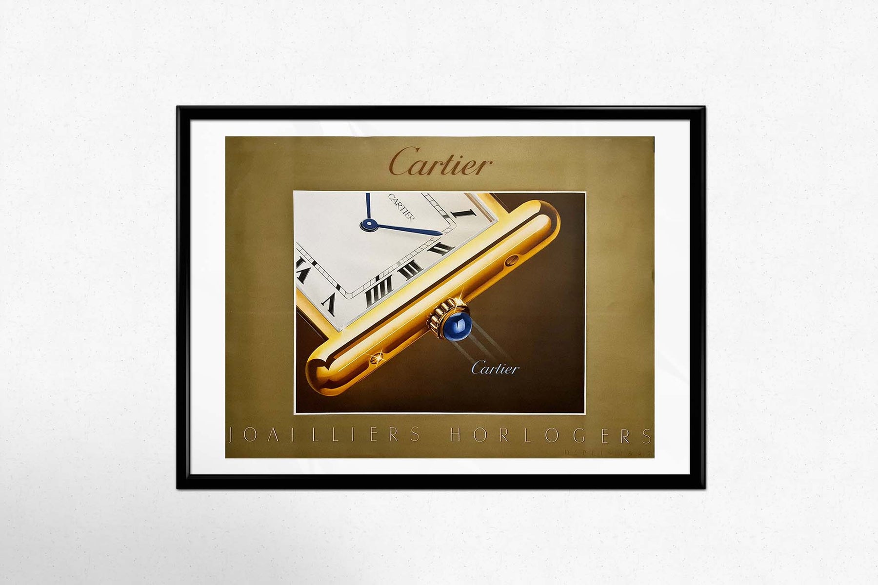 The watch featured in the poster exemplifies Cartier’s ethos: classic, functional, yet utterly luxurious. The simplicity of the design does not detract from its inherent value, making it appealing to a wide range of customers, from royalty to modern-day collectors. Cartier’s ability to craft products that are instantly recognizable while maintaining exclusivity has been a key part of its branding, and this 1985 poster is a perfect illustration of that strategy.