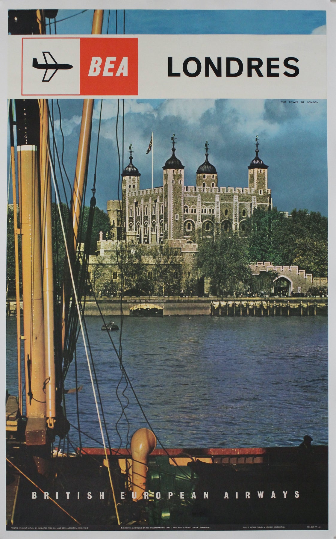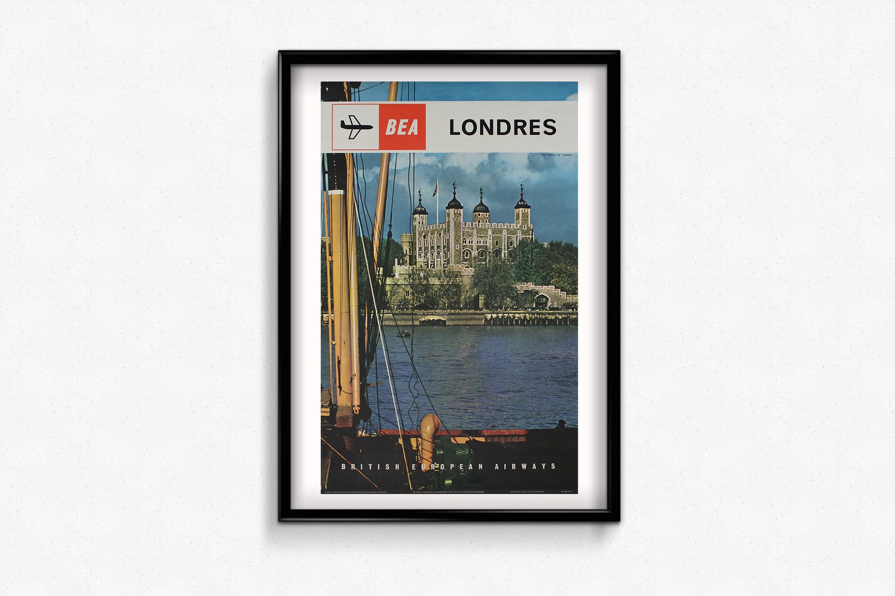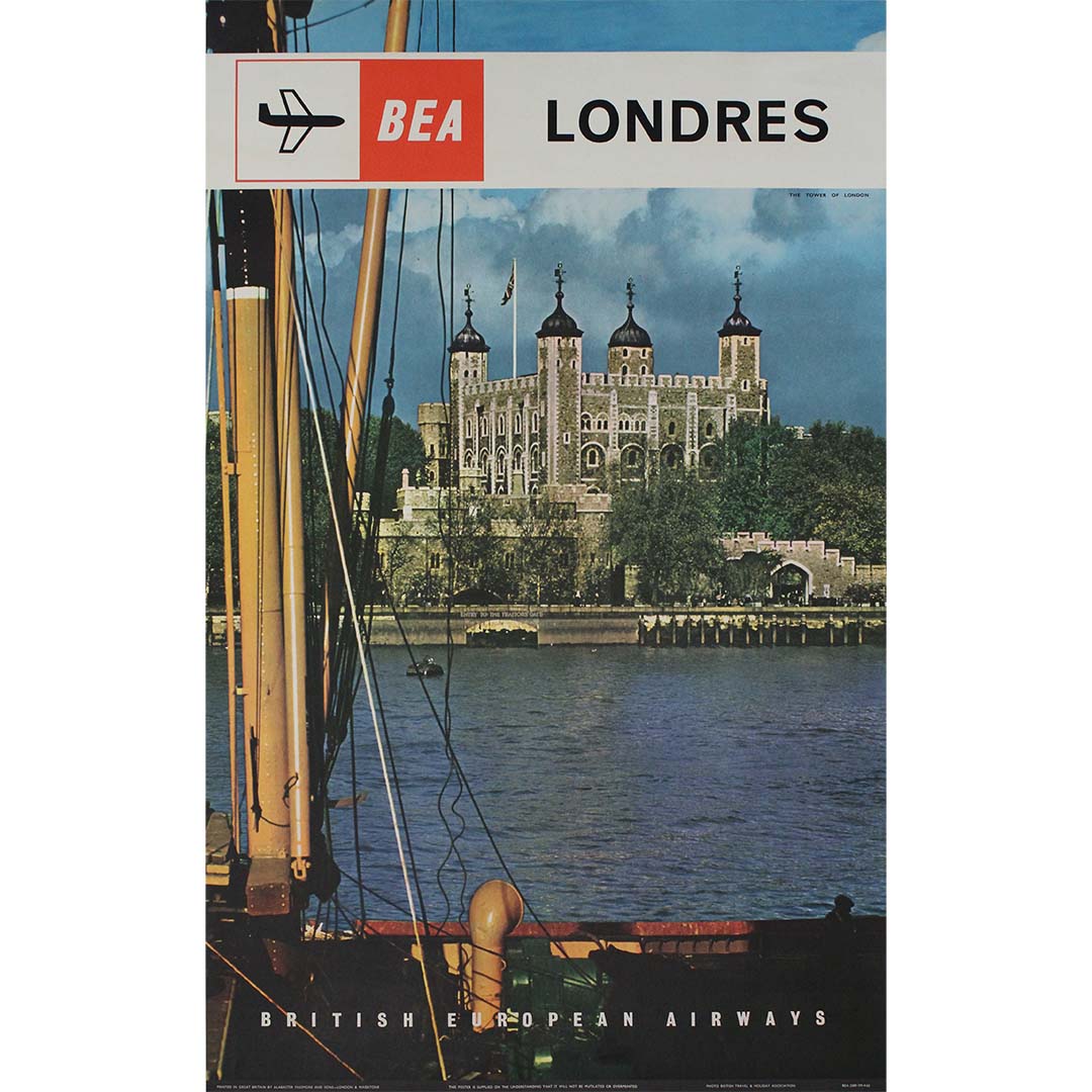 The 1962 original poster for BEA (British European Airways), titled "Londres: The Tower of London", was created as part of a campaign to promote London as a prime destination for international tourists. The poster specifically highlighted the Tower of London, one of the city’s most iconic landmarks, as a symbol of England’s rich history and cultural significance.