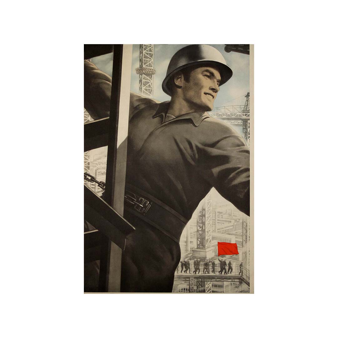 This striking Soviet propaganda poster from 1980 exemplifies the late Socialist Realist aesthetic—monumental, idealized, and resolutely optimistic. Created at the twilight of the Brezhnev era, the image celebrates the unwavering strength of the Soviet worker as the heroic engine of the state’s industrial and ideological progress.