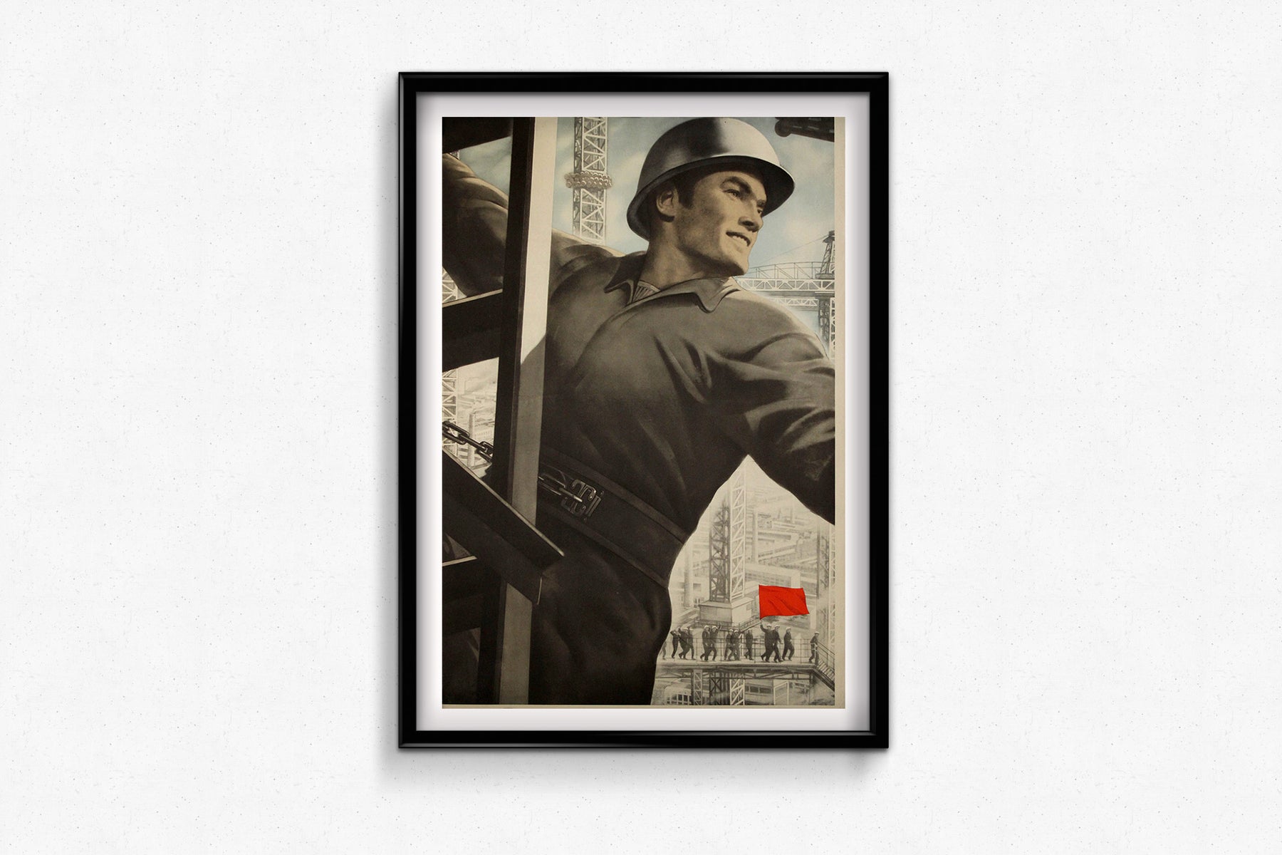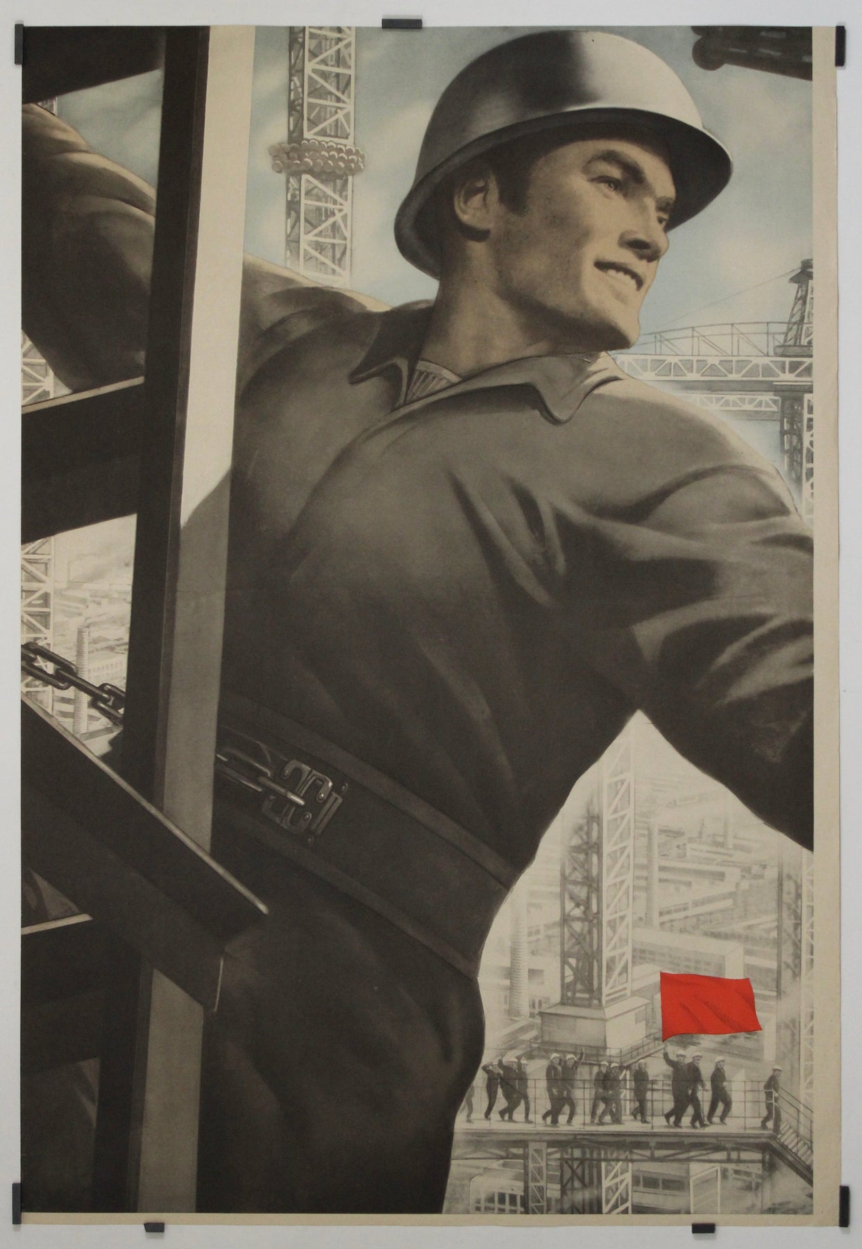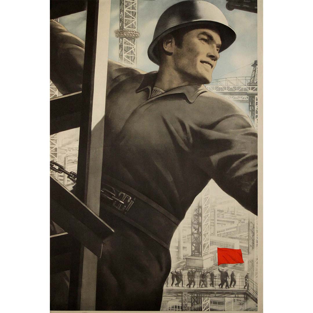 Behind him rises a sprawling industrial cityscape, dense with scaffolding, cranes, and angular steel structures. These geometric frameworks form a complex visual metaphor for the infrastructure of socialism. The only burst of color—a small red flag—draws the eye to a marching group of workers in the lower background, reaffirming the collective nature of Soviet achievement.