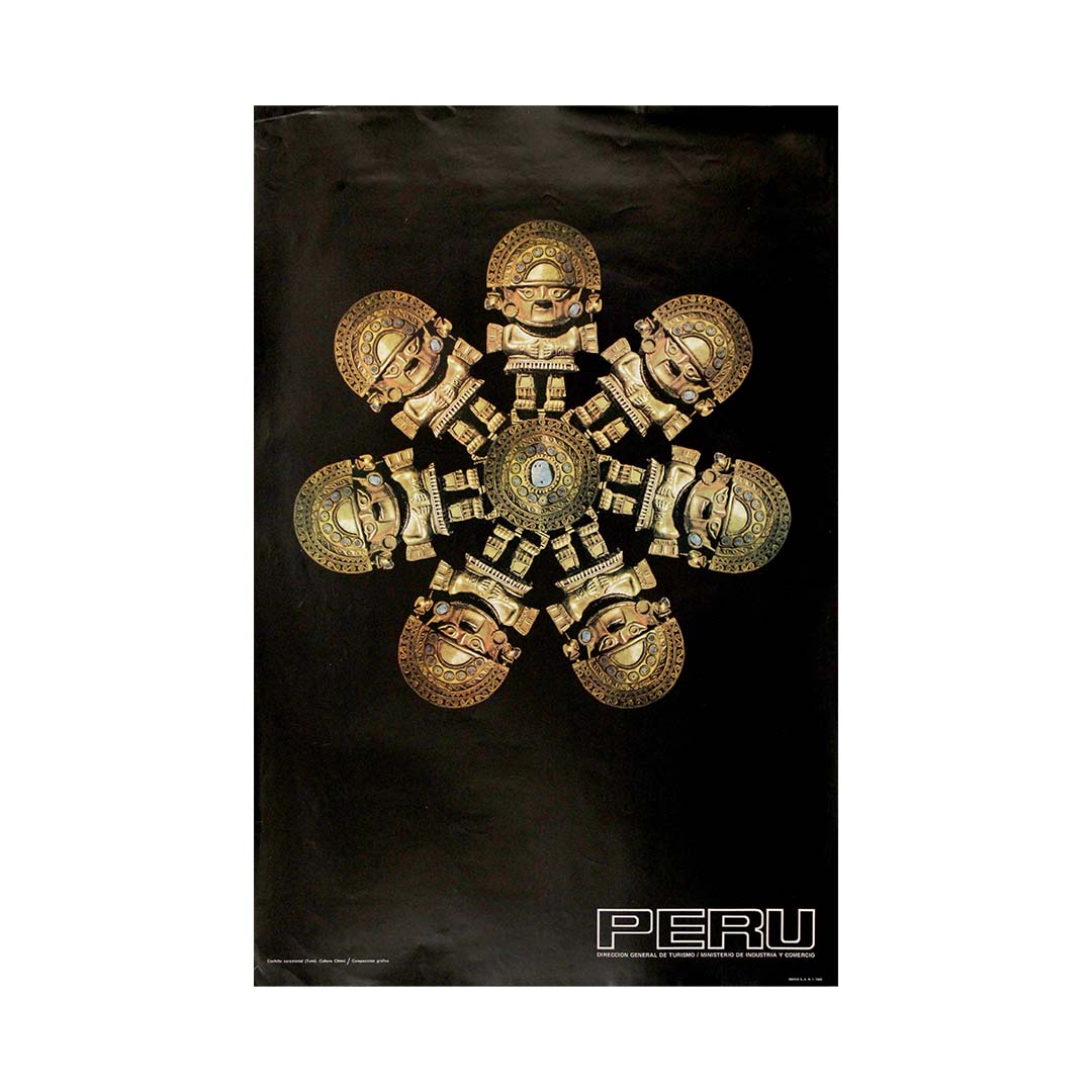 With its bold contrast, minimal text, and powerful central motif, this poster exemplifies modernist graphic design applied to archaeological promotion. It stands as both a collectible travel poster and a visual homage to the spiritual and artistic legacy of the Chimú civilization.