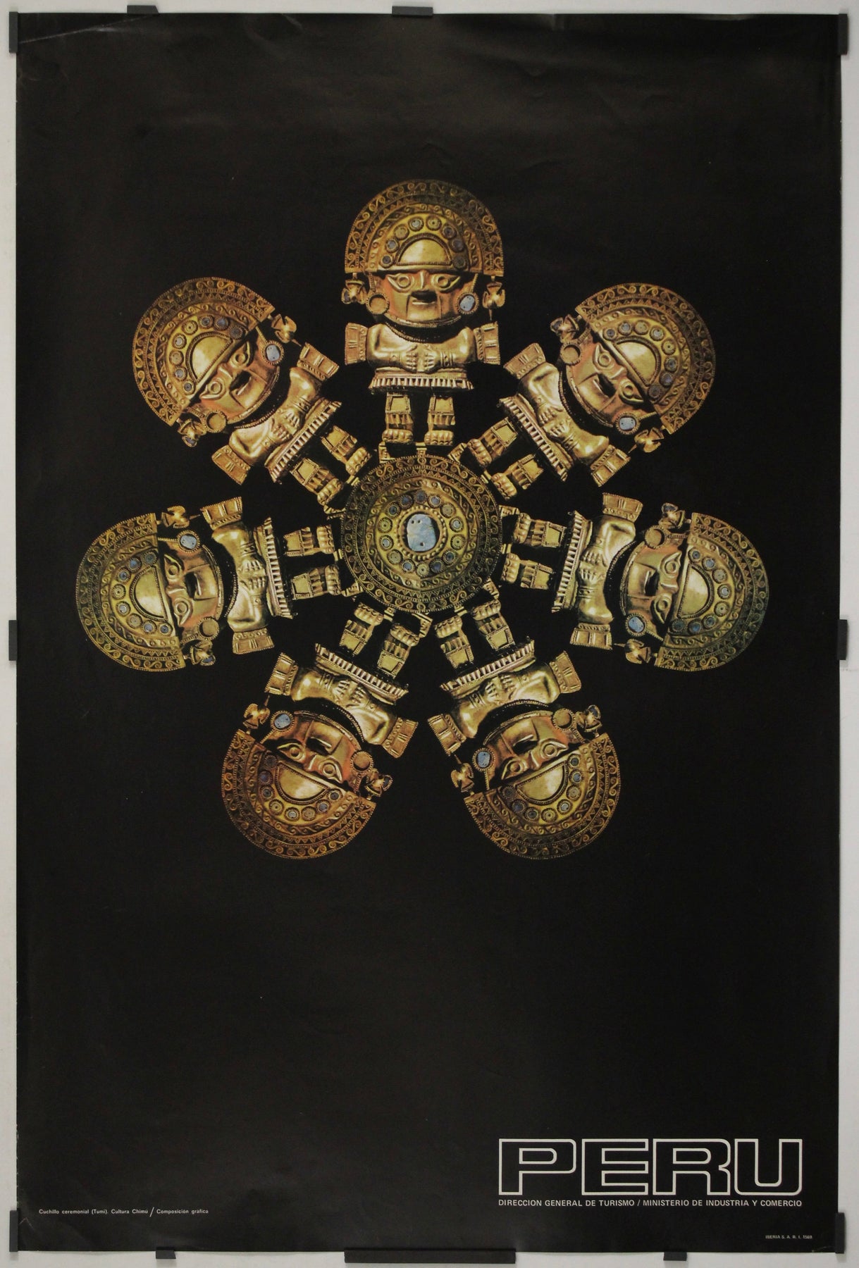 This striking Peruvian tourism poster from around circa 1960 showcases one of the most iconic ritual objects of pre-Columbian South America: the Tumi ceremonial knife, associated in this case with the Chimú civilization (c. 900–1470 AD), which flourished along the northern coast of present-day Peru before being incorporated into the Inca Empire.