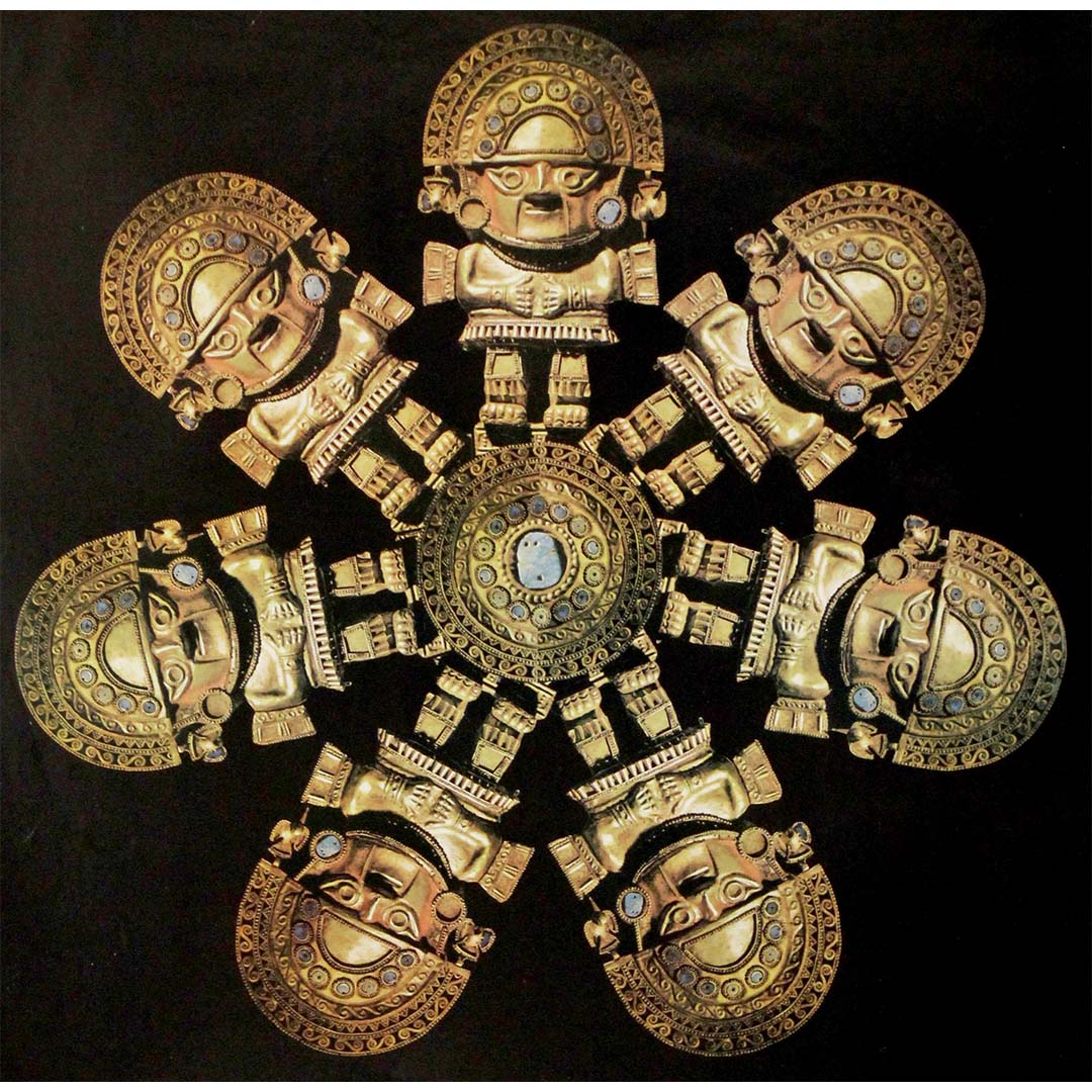 The composition presents a dramatic radial arrangement of stylized golden figures and Tumis, forming a symmetrical, almost cosmic motif against a deep black background. At the center appears a circular medallion, from which radiate anthropomorphic forms wearing elaborate headdresses and ornaments. This graphic construction evokes both a ritual sun symbol and the sophisticated metalwork traditions of ancient Peru, renowned for their mastery of gold, silver, and copper alloys.
