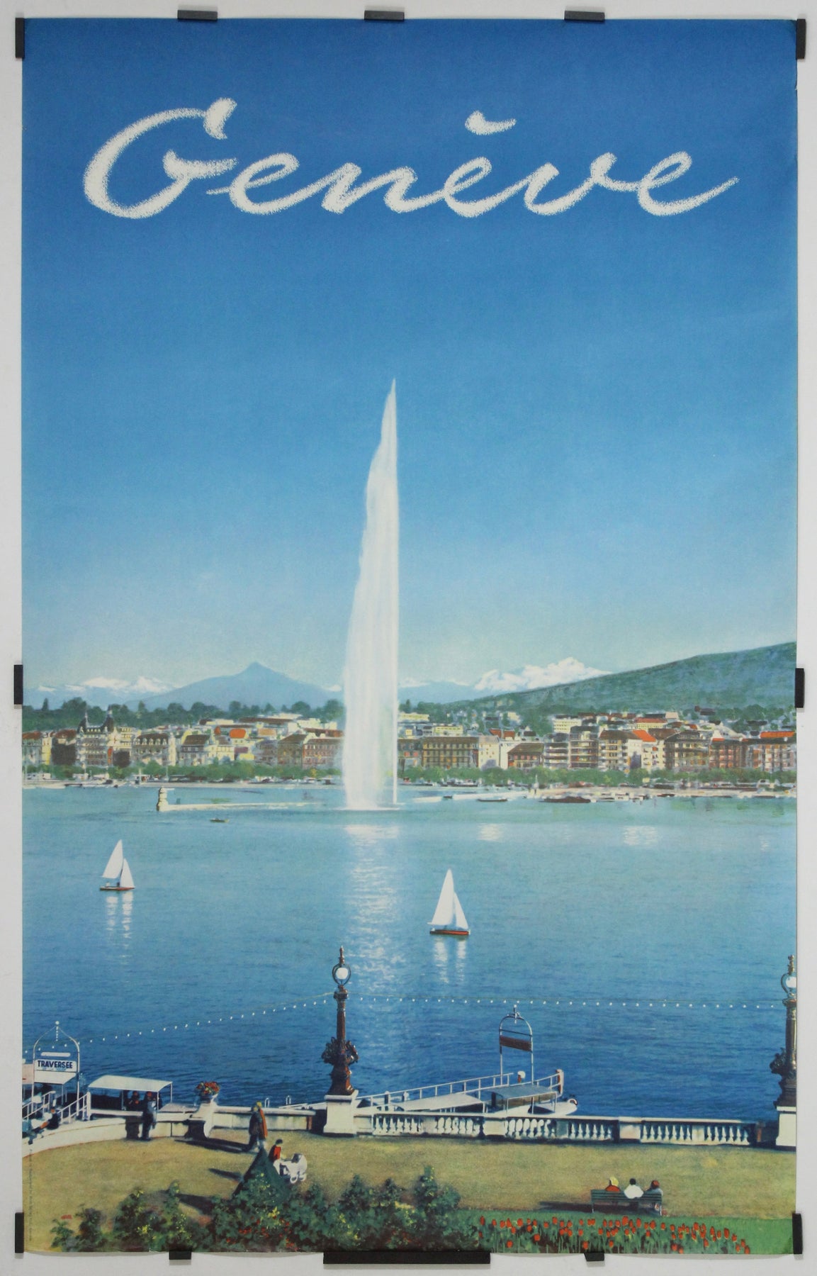 This elegant 1958 original travel poster showcases the refined beauty of Genève, Switzerland’s international city, rendered in crisp photographic realism. Published by the Swiss National Tourist Office during the golden age of mid-century tourism, this piece is both a celebration of Geneva’s iconic landscape and a subtle emblem of Swiss precision and cosmopolitan calm.