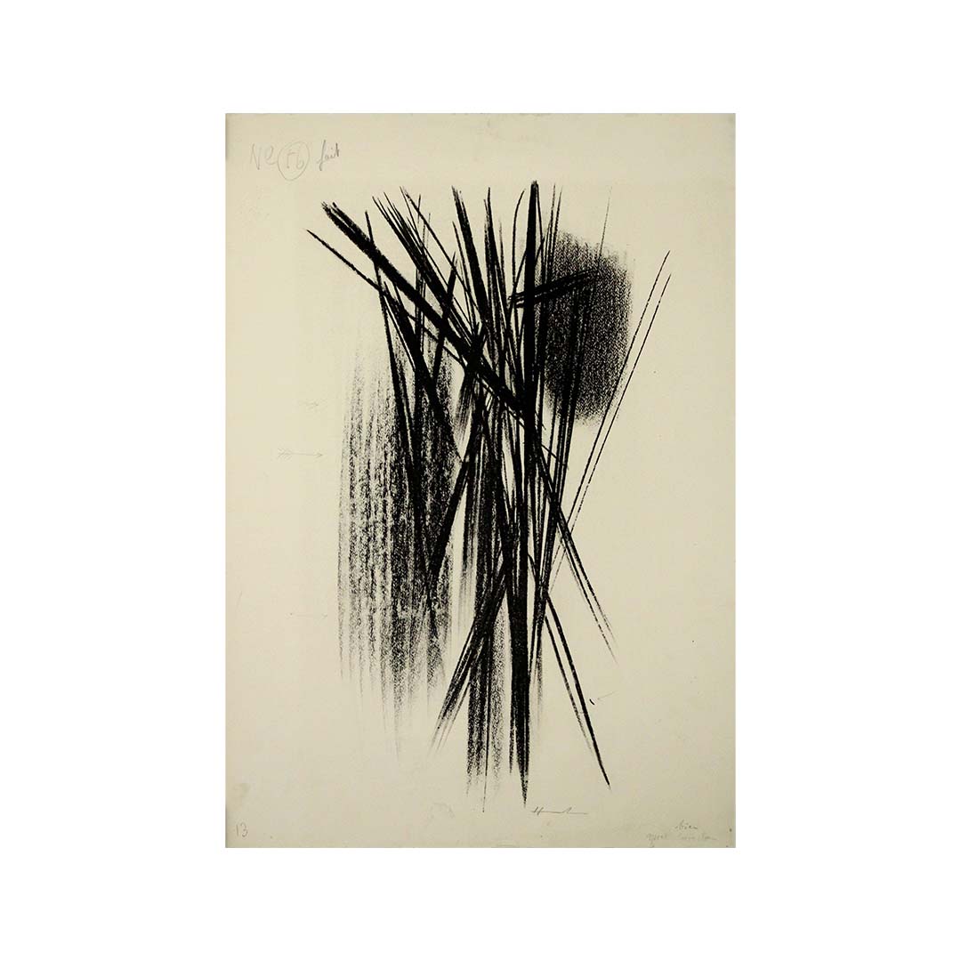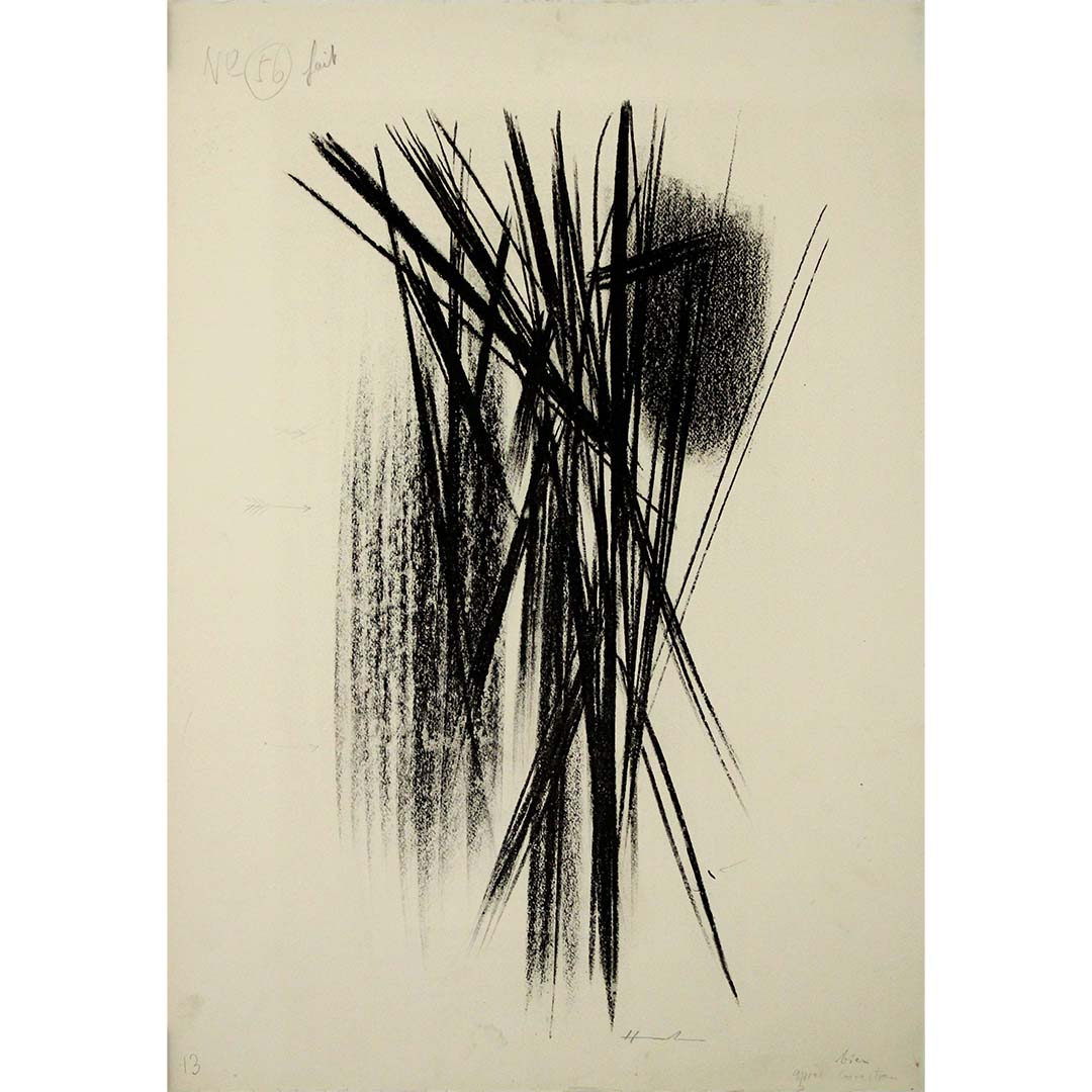 The 1958 original lithography by Hans Hartung, titled "Composition noir L56" represents a significant milestone in the artist's illustrious career, showcasing his profound exploration of form, texture, and contrast. Created as part of a limited edition series, this lithograph exemplifies Hartung's mastery of abstract expressionism and his innovative approach to composition.