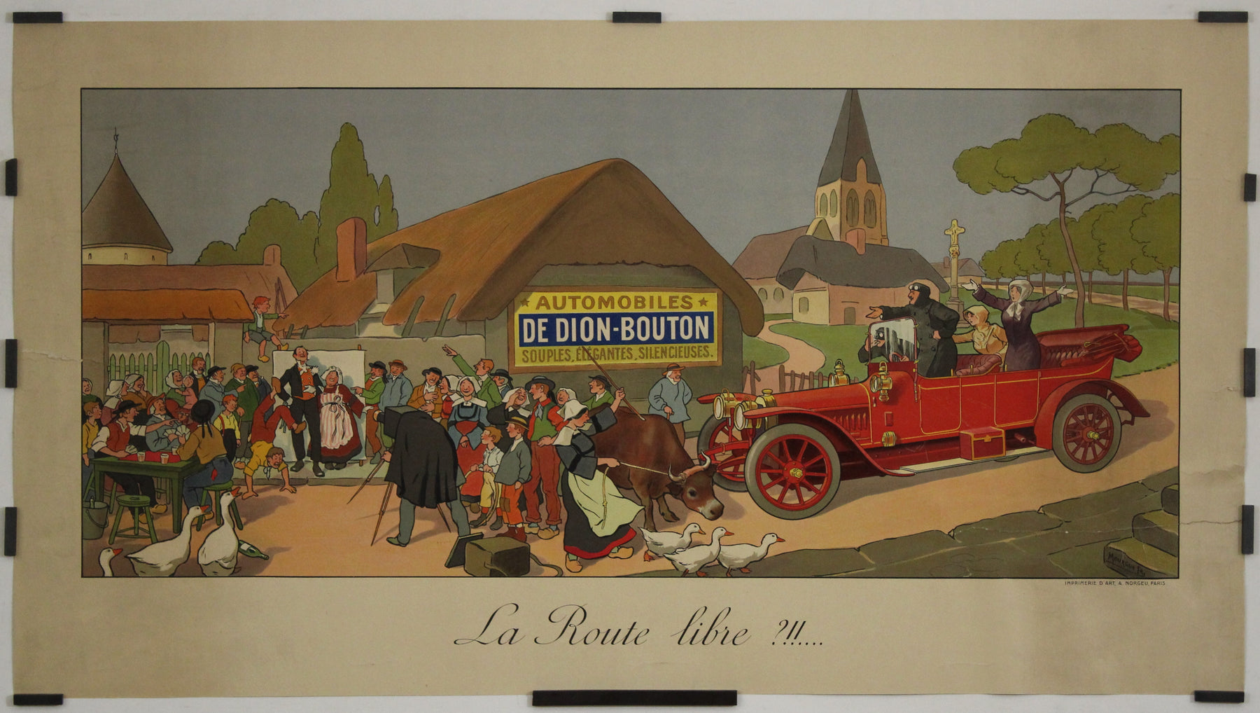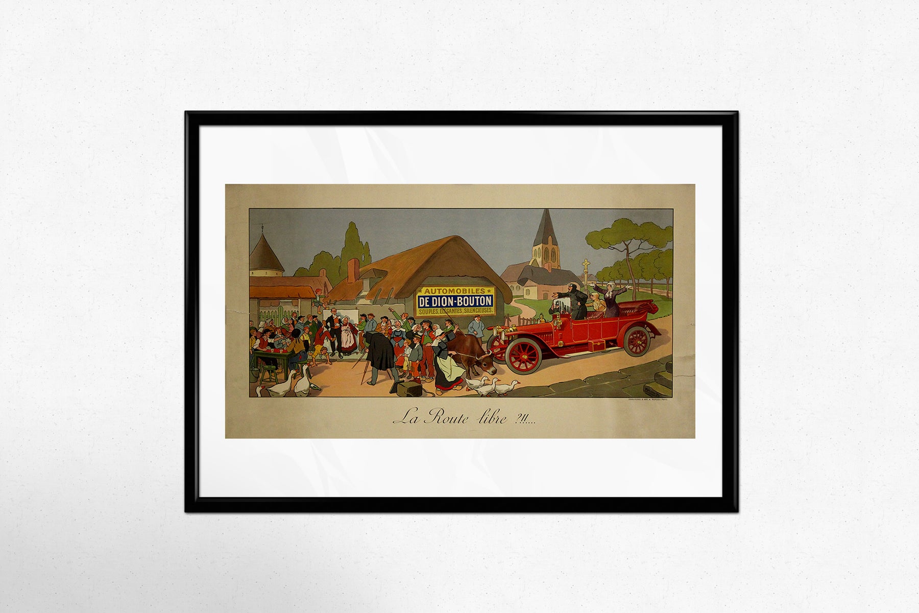 This circa 1900 original advertising poster by Mourgue was created to promote the pioneering automobiles of De Dion-Bouton, one of the most influential names in the early history of motoring. Titled “La route libre ?!!…”, the poster humorously captures the cultural shock provoked by the arrival of the automobile in rural France at the turn of the 20th century.