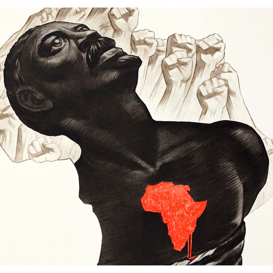 Behind the central figure, multiple raised fists emerge in pale tones, forming a symbolic backdrop of collective resistance and solidarity. These repeated gestures evoke the broader liberation movements that spread across Africa during the mid-twentieth century. The contrast between the dark, sculptural rendering of the figure and the lighter background fists reinforces the sense that Lumumba represents a larger movement of people striving for freedom.