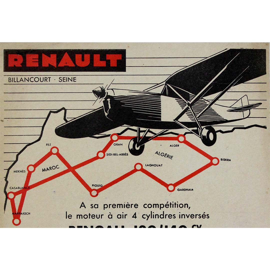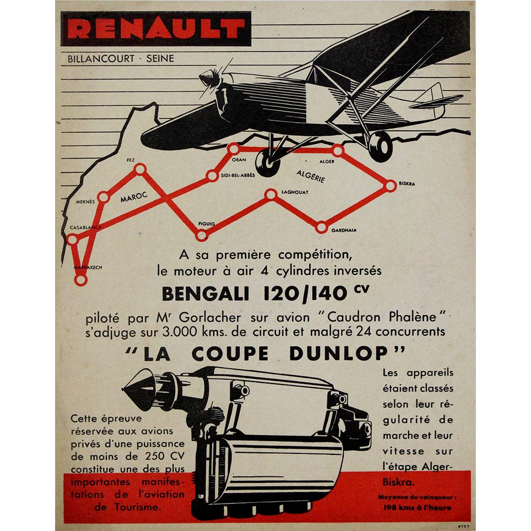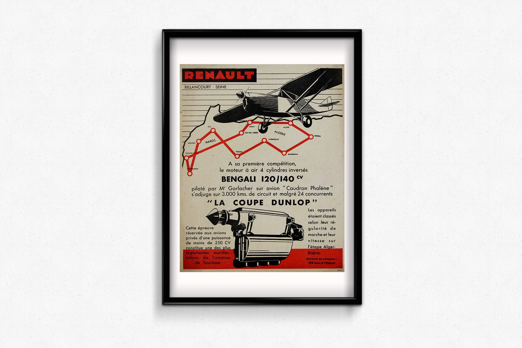Illustrated with a bold black and red color scheme, the poster features an aircraft in mid-flight, a detailed route map, and a technical drawing of the Bengali engine, reinforcing Renault’s role in pioneering aviation technology. This historical artifact is a rare piece of aviation and automotive history, showcasing the golden age of aeronautical competition and Renault’s engineering prowess in the early 20th century.
