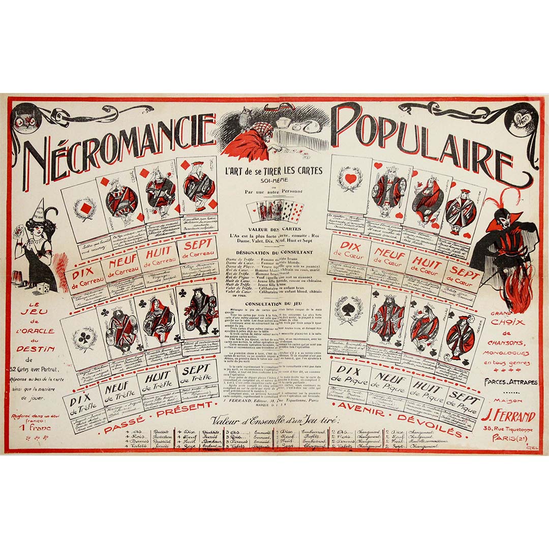 The composition combines instructional charts with theatrical imagery — playing cards, symbolic figures, and decorative flourishes typical of the Art Nouveau period. Such posters were often sold as affordable curiosities, enabling people to practice simple fortune-telling at home while enjoying the spectacle of esoteric imagery.