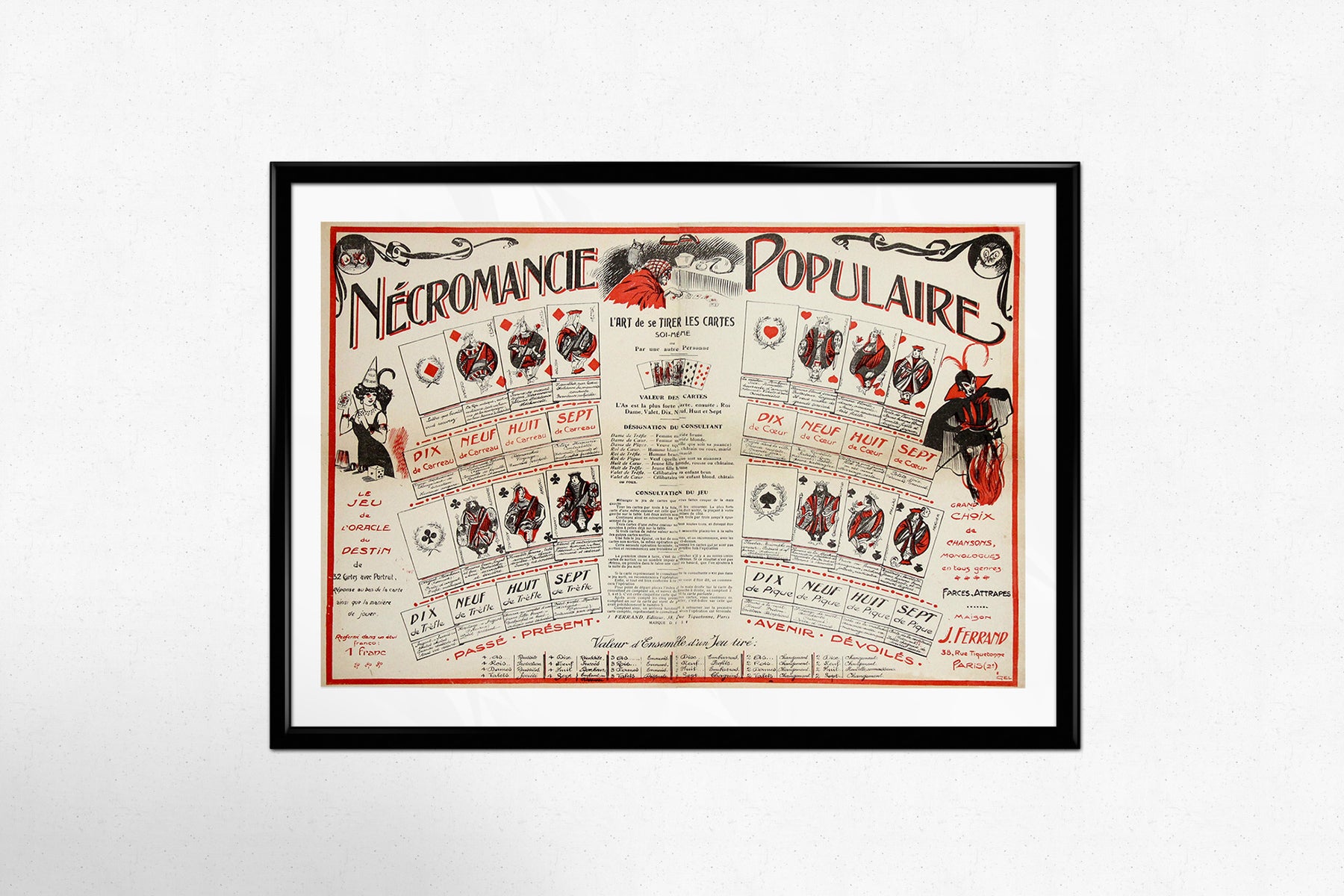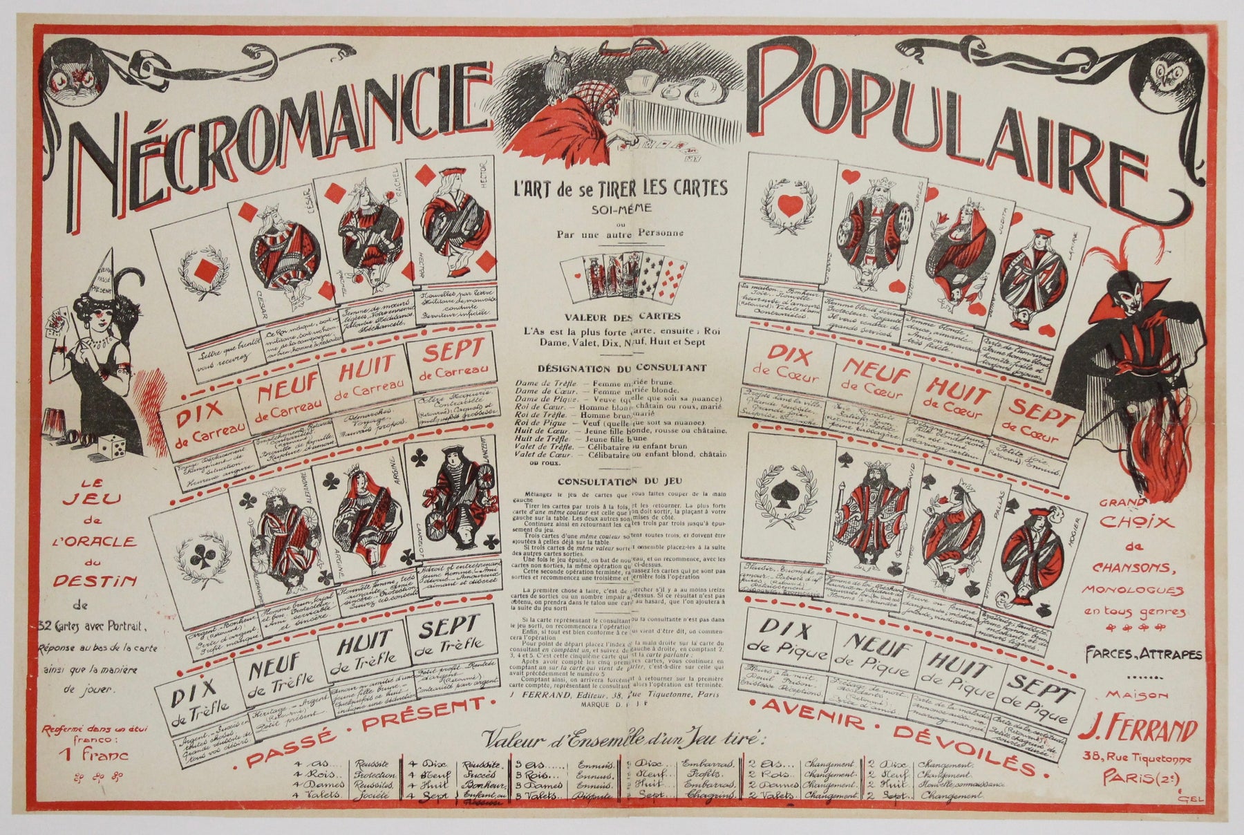 Despite the dramatic term “nécromancie,” the content generally relates to card divination rather than literal necromancy, highlighting how occult themes were frequently romanticized in popular visual culture. It illustrates a time when spiritualism, tarot reading, and mystical games were fashionable pastimes across Europe.
