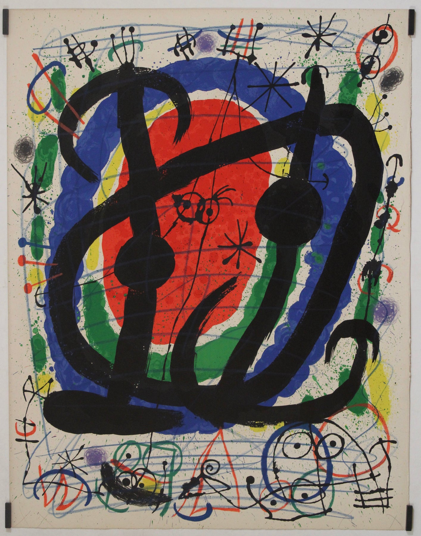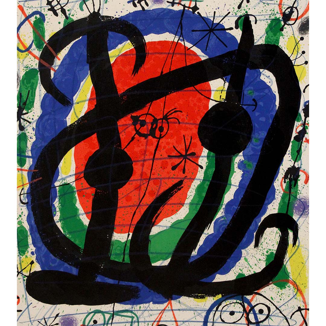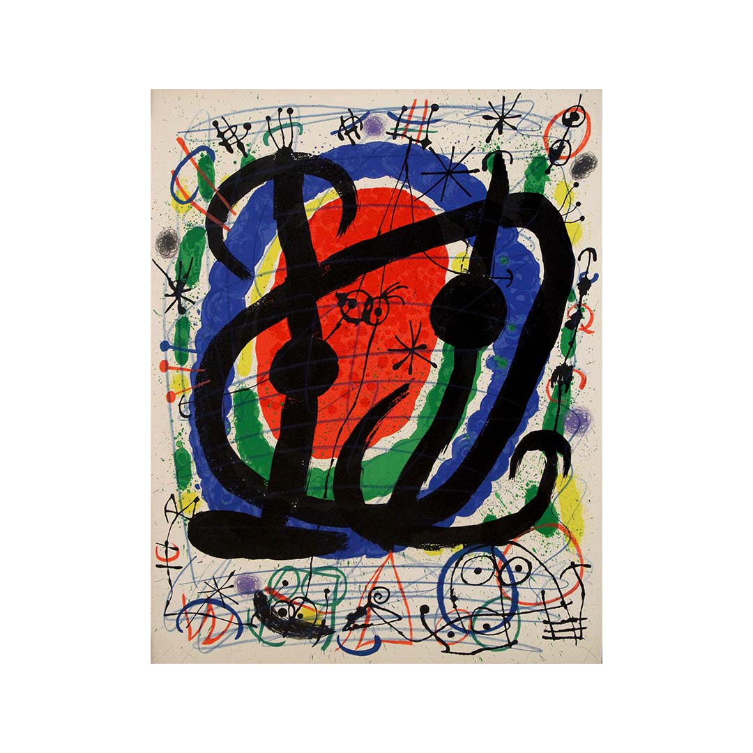 Joan Miró, widely recognized as one of the leading figures of Surrealism, was celebrated for his innovative techniques and his ability to convey profound psychological and emotional depth. Although he never formally joined the Surrealist movement, his work consistently aligned with its ideals. He pioneered automatism, a method of spontaneous creation designed to express the workings of the subconscious mind. This lithograph reflects Miró's dedication to that approach, combining a dynamic use of color, intricate compositions, and flowing, organic forms. Recurring motifs like birds, eyes, and celestial elements often appear in his art, inviting viewers to explore their rich symbolic potential.