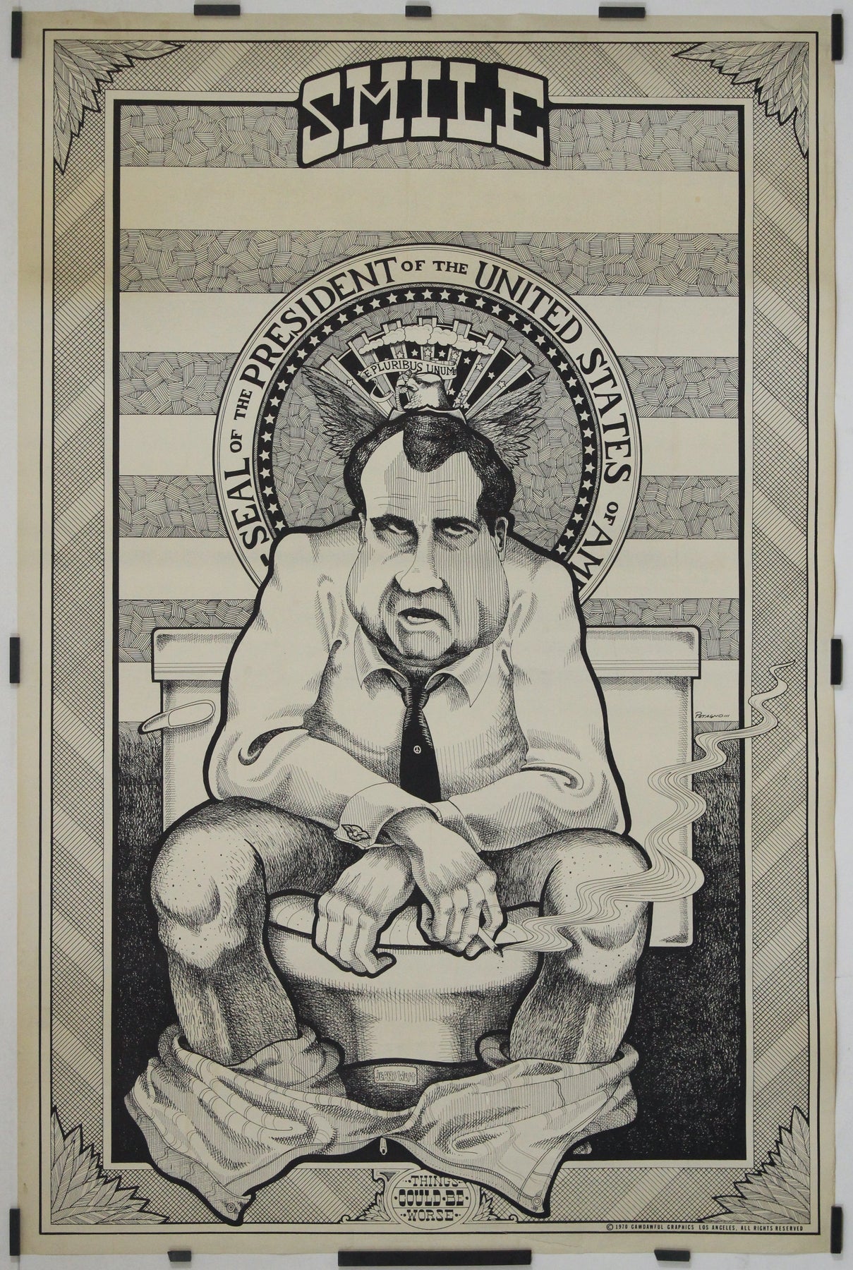 The “Smile, Things Could Be Worse” caricature poster by Joe Petagno from 1970 offers a humorous yet biting critique of President Richard Nixon. The visual imagery of Nixon sitting on a toilet, pants down, with the tagline "Smile, Things Could Be Worse," adds a layer of absurdity and mockery to his presidency. This bold and irreverent portrayal emphasizes the vulnerability and perceived incompetence of the President during a tumultuous era in American politics.